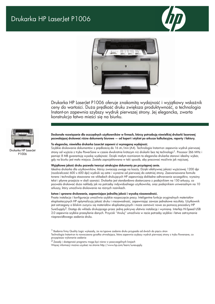 Drukarka HP LaserJet P1006 Drukarka HP LaserJet P1006 oferuje znakomitą wydajność i wyjątkowy wskaźnik ceny do wartości. Duża prędkość druku zwiększa produktywność, a technologia Instant-on zapewnia szybszy wydruk pierwszej strony. Jej elegancka, zwarta konstrukcja łatwo mieści się na biurku. Doskonałe rozwiązanie dla oszczędnych użytkowników w firmach, którzy potrzebują niewielkiej drukarki laserowej pozwalającej drukować różne dokumenty biurowe — od kopert i etykiet po arkusze kalkulacyjne, raporty i faktury. Drukarka HP LaserJet P1006 Ta elegancka, niewielka drukarka LaserJet zapewni ci wymaganą wydajność. Szybkie drukowanie dokumentów z prędkością do 16 str./min (A4). Technologia Instant-on zapewnia wydruk pierwszej strony od wyjścia z trybu PowerSave w czasie dwukrotnie krótszym niż drukarki bez tej technologii1. Procesor 266 MHz i pamięć 8 MB gwarantują wysoką wydajność. Dzięki małym rozmiarom ta elegancka drukarka stanowi idealny wybór, gdy na biurku jest mało miejsca. Została zaprojektowana w taki sposób, aby pracować możliwie jak najciszej. Wyjątkowa jakość druku pozwala tworzyć atrakcyjne dokumenty po przystępnej cenie. Idealna drukarka dla użytkowników, którzy zwracają uwagę na koszty. Dzięki efektywnej jakości wyjściowej 1200 dpi (rozdzielczość 600 x 600 dpi) wydruki są ostre i wyraźne od pierwszej do ostatniej strony. Zaawansowana formuła tonera i technologia stosowana we wkładach drukujących HP zapewniają dokładne odtwarzanie szczegółów, wyraźny tekst i płynne przejścia w skali szarości. Drukarka jest standardowo dostarczana z podajnikiem na 150 arkuszy, co pozwala drukować duże nakłady jak na potrzeby indywidualnego użytkownika, oraz podajnikiem uniwersalnym na 10 arkuszy, który umożliwia drukowanie na różnych nośnikach. Łatwe i sprawne drukowanie, zapewniające jednolitą jakość i wysoką niezawodność. Prosta instalacja i konfiguracja umożliwia szybkie rozpoczęcie pracy. Inteligentne funkcje oryginalnych materiałów eksploatacyjnych HP optymalizują jakość druku i niezawodność, zapewniając zawsze jednakowe rezultaty. Użytkownik jest ostrzegany o bliskim zużyciu się materiałów eksploatacyjnych i może zamówić nowe za pomocą procedury HP SureSupply2. Dostęp do wkładu drukującego przez jedną pokrywę ułatwia instalację i wymianę. Interfejs Hi-Speed USB 2.0 zapewnia szybkie przesyłanie danych. Przycisk "Anuluj" umożliwia w razie potrzeby szybkie i łatwe zatrzymanie nieprawidłowego zadania druku. 1 Badania firmy Quality Logic wykazały, że na typowe zadanie druku przypada od dwóch do pięciu stron Technologia Instant-on to nowoczesna grzałka utrwalająca, która zapewnia szybszy wydruk pierwszej strony z trybu Powersave, co przyspiesza wykonanie zadania 2 Zasady i dostępność programu mogą być różne w poszczególnych krajach Więcej informacji można uzyskać na stronie http://www.hp.com/learn/suresupply. Dane techniczne Technologia druku Prędkość druku Procesor Pamięć Rozdzielczość druku Jakość druku Języki drukowania Ekonomiczne drukowanie Czcionki Normatywny cykl pracy (miesięcznie, format A4) Marginesy wydruku Obsługa nośników Druk laserowy A4 w czerni: Do 16 str./min Pierwsza wydrukowana strona w czerni: poniżej 9 s Specyfikacje prędkości według standardowych branżowych metod testowych 266 MHz, Tensilica® 8 MB Do 600 x 600 dpi (efektywna rozdzielczość wyjściowa 1200 dpi) REt, HP FastRes 600, HP FastRes 1200 Przetwarzanie druku w komputerze Tryb Economode (oszczędność do 50% tonera przy rozdzielczości 600 dpi), szybki powrót do trybu Powersave po każdym wydruku dzięki technologii Instant-on (oszczędność prądu), drukowanie kilku zmniejszonych stron na jednym arkuszu i ręczny druk dwustronny (oszczędność papieru) Brak Do 5000 stron górny: 4 mm, lewy: 4 mm, prawy: 4 mm, dolny: 4 mm Podawanie Pojemność Waga nośników Podajnik 1 arkusze: 150, koperty: 15; od 60 do 163 g/m˛ arkusze: 10 (z priorytetem poboru) Informacje o zamawianiu CB411A Drukarka HP LaserJet 1006, próbny wkład drukujący HP LaserJet (o średniej wydajności 700 standardowych stron), instrukcja uruchomienia, dokumentacja drukarki i oprogramowanie na płycie CD, ulotka na temat pomocy technicznej, kabel zasilania Q6302A CB435A Format A4, A5, B5, pocztówki, koperty (C5, DL, B5), od 147x211 do 216x356 mm, podajnik na 10 arkuszy z priorytetem poboru: A6, od 76x127 do 216x356 mm Odbiór nośników: Liczba arkuszy: Do 100. Koperty: Do 15. Folie przezroczyste: Do 100; Odbiornik papieru na 100 arkuszy wydrukiem do dołu Drukowanie Ręczny (z obsługą przez sterownik) dwustronne: Papier (laser, zwykły, fotograficzny, szorstki, welinowy), koperty, etykiety, kartony, folia transparentna, pocztówki Nośniki USB Hi-Speed (zgodne z USB 2.0), Opcjonalnie: Brak Interfejsy Obsługiwane systemy operacyjne System Microsoft® Windows® 2000, XP Home, XP Professional, XP Professional x64, Server 2003 (32- lub 64-bitowy), dostosowany do systemu Windows Vista®; Mac OS X v 10.3, Mac OS X v 10.4, Mac OS X v 10.5 Opcjonalnie: Najnowsze sterowniki są dostępne na stronach http://www.hp.com i http://www.hp.pl/sterowniki Brak Obsługiwane sieciowe systemy operacyjne Minimalne wymagania systemowe Microsoft® Windows® 2000, XP Home, XP Professional, Windows Vista® Ready, 120 MB wolnego miejsca na dysku twardym, napęd CD-ROM, port USB, Mac OS X 10.2.8, 10.3, 10.4 lub nowszy; Komputer Macintosh z procesorem PowerPC G3, G4, G5 lub Intel® Core; 128 MB pamięci RAM (zalecane 256 MB); 120 MB wolnego miejsca na dysku twardym; napęd CD-ROM; Port USB Przetwarzanie druku w komputerze („host-based") Oprogramowanie 2 diody (Uwaga, Gotowość) Panel sterowania Stan i komunikaty HP, funkcja śledzenia zużycia Zarządzanie drukarką Wymagania: Napięcie wejściowe 110 – 127 V (+/- 10%), 60 Hz (+/-2 Hz), 7 A; 220 – 240 V (+/- 10%), 50 Zasilanie Hz (+/- 2 Hz), 4,0 A;.