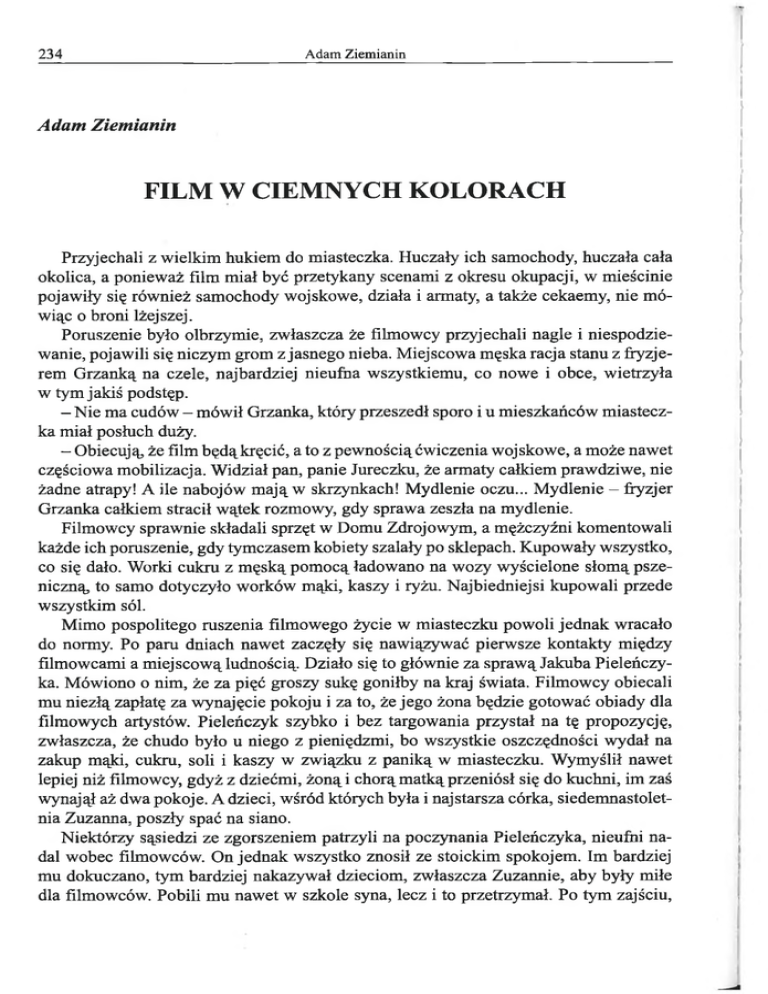 Adam Ziemianin 234 Adam Ziemianin FILM W CIEMNYCH KOLORACH Przyjechali z wielkim hukiem do miasteczka. Huczały ich samochody, huczała cała okolica, a ponieważ film miał być przetykany scenami z okresu okupacji, w mieścinie pojawiły się również samochody wojskowe, działa i armaty, a także cekaemy, nie mówiąc o broni lżejszej. Poruszenie było olbrzymie, zwłaszcza że filmowcy przyjechali nagle i niespodziewanie, pojawili się niczym grom z jasnego nieba. Miejscowa męska racja stanu z fryzjerem Grzanką na czele, najbardziej nieufna wszystkiemu, co nowe i obce, wietrzyła w tym jakiś podstęp. - Nie ma cudów - mówił Grzanka, który przeszedł sporo i u mieszkańców miasteczka miał posłuch duży. - Obiecują, że film będą kręcić, a to z pewnością ćwiczenia wojskowe, a może nawet częściowa mobilizacja. Widział pan, panie Jureczku, że armaty całkiem prawdziwe, nie żadne atrapy! A ile nabojów mają w skrzynkach! Mydlenie oczu... Mydlenie - fryzjer Grzanka całkiem stracił wątek rozmowy, gdy sprawa zeszła na mydlenie. Filmowcy sprawnie składali sprzęt w Domu Zdrojowym, a mężczyźni komentowali każde ich poruszenie, gdy tymczasem kobiety szalały po sklepach. Kupowały wszystko, co się dało. Worki cukru z męską pomocą ładowano na wozy wyścielone słomą pszeniczną, to samo dotyczyło worków mąki, kaszy i ryżu. Najbiedniejsi kupowali przede wszystkim sól. Mimo pospolitego ruszenia filmowego życie w miasteczku powoli jednak wracało do normy. Po paru dniach nawet zaczęły się nawiązywać pierwsze kontakty między filmowcami a miejscową ludnością. Działo się to głównie za sprawą Jakuba Pieleńczyka. Mówiono o nim, że za pięć groszy sukę goniłby na kraj świata. Filmowcy obiecali mu niezłą zapłatę za wynajęcie pokoju i za to, że jego żona będzie gotować obiady dla filmowych artystów. Pieleńczyk szybko i bez targowania przystał na tę propozycję, zwłaszcza, że chudo było u niego z pieniędzmi, bo wszystkie oszczędności wydał na zakup mąki, cukru, soli i kaszy w związku z paniką w miasteczku. Wymyślił nawet lepiej niż filmowcy, gdyż z dziećmi, żoną i chorą matką przeniósł się do kuchni, im zaś wynajął aż dwa pokoje. A dzieci, wśród których była i najstarsza córka, siedemnastoletnia Zuzanna, poszły spać na siano. Niektórzy sąsiedzi ze zgorszeniem patrzyli na poczynania Pieleńczyka, nieufni nadal wobec filmowców. On jednak wszystko znosił ze stoickim spokojem. Im bardziej mu dokuczano, tym bardziej nakazywał dzieciom, zwłaszcza Zuzannie, aby były miłe dla filmowców. Pobili mu nawet w szkole syna, lecz i to przetrzymał. Po tym zajściu, Film w ciemnych kolorach 235 widząc, że nic nie wskórają koledzy młodego Pieleńczyka szybko zmienili front i zaczęli wypytywać o filmowych artystów. Stary tylko pouczał swego siódmoklasistę, co ma mówić rówieśnikom. - Przez żołądek do serca, przez dzieci do rodziców - powiadał Pieleńczyk, a jego chytre jak u lisa oczka mrugały prędko. Synowi nie musiał wiele tłumaczyć, bo naturę miał po ojcu. Niedaleko bowiem spadło jabłko od jabłoni. - Powiedz im, że filmowcy codziennie piją zagraniczną wódkę, a ja z nimi, że częstująmnie drogimi, amerykańskimi papierosami i że dali mi całą paczkę żyletek ״Wilkinson”, a jedną taką żyletką golę się już trzeci miesiąc i wciąż jest jak nowa! Przesadzał Pieleńczyk z tym goleniem, gdyż filmowcy dopiero drugi tydzień byli w miasteczku, ale nikt na to nie zwracał uwagi. Każdy chłonął wieści filmowe z maskowaną ciekawością Młody Pieleńczyk opowiadał więc o ich scyzorykach z kilkoma ostrzami, o aparatach filmowych i o malutkim telewizorze, który u nich widział. Rozmiękczał powoli swymi opowieściami zatwardziałą atmosferę panującą w miasteczku. Główny wpływ na pryskanie cichej zmowy miały tu pieniądze. Bajońskie sumy, jakie, według syna, zarabiał ojciec, kusiły wszystkich. Powoli, bardzo powoli, mieszkańcy miasteczka zaczęli przekonywać się do filmówców. Wiele się na to złożyło. I ludzka ciekawość, i dodatkowy zarobek przy filmie, lecz najważniejszy wpływ miało tu niecodzienne wydarzenie, którego jednym z głównych bohaterów był Pieleńczyk. Zdarzyło się to w sobotę. Góry dymiły i nie zanosiło się na lepszą pogodę. Wilgoć gęsta kisiła się nad miasteczkiem. Pierwsze opadłe liście mocno lgnęły do asfaltu. Po nich to przeszedł Pieleńczyk z jakimś obcym człowiekiem. Razem z nieznajomym skierowali się do gospody. Jakub Pieleńczyk, mimo swojego skąpstwa, lubił zaglądać do kieliszka. Jak godził te dwie wykluczające się cechy charakteru, trudno sobie wyobrazić. Często, nim jeszcze przyjechali filmowcy, można go było spotkać w sklepie spółdzielczym, gdzie kupował wódkę. Teraz, kiedy dzięki filmowi stał się bogatym mieszkańcem miasteczka, robił to znacznie częściej. Do szynku zaglądał jednak bardzo rzadko. Jego słabość do alkoholu nie wykluczała chłopskiego, zdrowego rozsądku. Po prostu nie lubił przepłacać wódki w knajpie. Stąd w gospodzie był rzadkim gościem. Najwyżej czasem wpadał na kieliszek ״czystej”, kłócił się, że mu nie dolano na miarę, po czym wypijał ją jednym haustem. I wychodził ocierając gębę rękawem. Dlatego kiedy bywalcy gospody w pewną sobotę zastali go siedzącego w szynku przy półlitrówce i śledziu po japońsku, poruszenie było duże. Lecz nawet przybycie Pieleńczyka nie zbulwersowało tak mieszkańców, jak jego gość. Zasiadł on bowiem przy knajpianym stole z prawdziwym Afrykańczykiem. Jak miasteczko miasteczkiem, nikt dotychczas tego nie widział. Afrykańczyk i Pieleńczyk. Kobiety zaglądały do gospody przez okno i czyniły znak krzyża, a mężczyźni siedzieli przy stolikach i tępo się gapili. Ciasno było jak pod chórem w kościele na niedzielnej sumie. Tylko Pieleńczyk i Afrykańczyk mieli d
