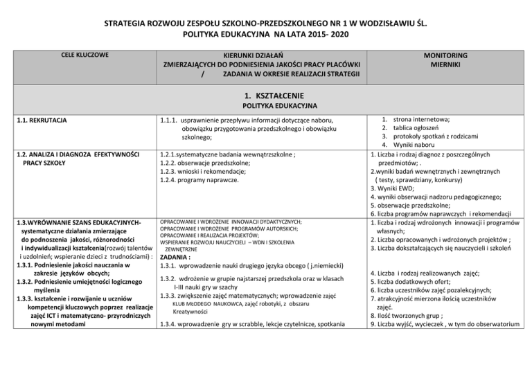 STRATEGIA ROZWOJU ZESPOŁU SZKOLNO-PRZEDSZKOLNEGO NR 1 W WODZISŁAWIU ŚL. POLITYKA EDUKACYJNA NA LATA 2015- 2020 CELE KLUCZOWE KIERUNKI DZIAŁAŃ ZMIERZAJĄCYCH DO PODNIESIENIA JAKOŚCI PRACY PLACÓWKI / ZADANIA W OKRESIE REALIZACJI STRATEGII MONITORING MIERNIKI 1. KSZTAŁCENIE POLITYKA EDUKACYJNA 1.1. REKRUTACJA 1.1.1. usprawnienie przepływu informacji dotyczące naboru, obowiązku przygotowania przedszkolnego i obowiązku szkolnego; 1.2. ANALIZA I DIAGNOZA EFEKTYWNOŚCI PRACY SZKOŁY 1.2.1.systematyczne badania wewnątrzszkolne ; 1.2.2. obserwacje przedszkolne; 1.2.3. wnioski i rekomendacje; 1.2.4. programy naprawcze. 1.3.WYRÓWNANIE SZANS EDUKACYJNYCHsystematyczne działania zmierzające do podnoszenia jakości, różnorodności i indywidualizacji kształcenia(rozwój talentów i uzdolnień; wspieranie dzieci z trudnościami) : 1.3.1. Podniesienie jakości nauczania w zakresie języków obcych; 1.3.2. Podniesienie umiejętności logicznego myślenia 1.3.3. kształcenie i rozwijanie u uczniów kompetencji kluczowych poprzez realizacje zajęć ICT i matematyczno- przyrodniczych nowymi metodami OPRACOWANIE I WDROŻENIE INNOWACJI DYDAKTYCZNYCH; OPRACOWANIE I WDROŻENIE PROGRAMÓW AUTORSKICH; OPRACOWANIE I REALIZACJA PROJEKTÓW; WSPIERANIE ROZWOJU NAUCZYCIELI – WDN I SZKOLENIA ZEWNĘTRZNE 1. strona internetowa; 2. tablica ogłoszeń 3. protokoły spotkań z rodzicami 4. Wyniki naboru 1. Liczba i rodzaj diagnoz z poszczególnych przedmiotów; . 2.wyniki badań wewnętrznych i zewnętrznych ( testy, sprawdziany, konkursy) 3. Wyniki EWD; 4. wyniki obserwacji nadzoru pedagogicznego; 5. obserwacje przedszkolne; 6. liczba programów naprawczych i rekomendacji 1. liczba i rodzaj wdrożonych innowacji i programów własnych; 2. Liczba opracowanych i wdrożonych projektów ; 3. Liczba dokształcających się nauczycieli i szkoleń ZADANIA : 1.3.1. wprowadzenie nauki drugiego języka obcego ( j.niemiecki) 1.3.2. wdrożenie w grupie najstarszej przedszkola oraz w klasach I-III nauki gry w szachy 1.3.3. zwiększenie zajęć matematycznych; wprowadzenie zajęć KLUB MŁODEGO NAUKOWCA, zajęć robotyki, z obszaru Kreatywności 1.3.4. wprowadzenie gry w scrabble, lekcje czytelnicze, spotkania 4. Liczba i rodzaj realizowanych zajęć; 5. liczba dodatkowych ofert; 6. liczba uczestników zajęć pozalekcyjnych; 7. atrakcyjność mierzona ilością uczestników zajęć. 8. Ilość tworzonych grup ; 9. Liczba wyjść, wycieczek , w tym do obserwatorium 1.3.4. Wzbogacanie języka ojczystego autorskie 1.3.5. Zapewnienie odpowiednich warunków kształcenia dzieci niepełnosprawnych; 1.3.5.1) Diagnoza potrzeb uczniów; 2) Doskonalenie nauczycieli w zakresie pracy z uczniem o specjalnych potrzebach edukacyjnych; 3) Współpraca z PPP w obszarze diagnozy i wczesnej interwencji psychologiczno-pedagogicznej; 4) Wprowadzenie. narzędzi psychometrycznych pozwalających na prace z dziećmi wg indywidualnych możliwości i potrzeb. 5)Wprowadzenie zajęć specjalistycznych; 6) Wyposażanie placówki do potrzeb uczniów niepełnosprawnych, dostosowanie bazy wg potrzeb dzieci . 1.3.6. Wyrównywanie szans edukacyjnych dzieci zagrożonych wykluczeniem; 1.3.6.1.Doskonalenie warunków edukacji na starcie poprzez wspieranie doskonalenia nauczycieli i rozwoju bazy dydaktycznej w pracy z dziećmi młodszymi ( sześciolatki ); 2. Rozwój i stałe wspieranie istniejących inicjatyw edukacyjnych skierowanych do dzieci ze środowisk zagrożonych wykluczeniem; 3. Realizacja zajęć psychologicznych, pedagogicznych w ramach projektów zewnętrznych. 1.3.7. Stwarzanie lepszych warunków rozwoju uczniów zdolnych. 1.3.7.1)Wspieranie realizacji zajęć indywidualnego programu i toku nauki dla uczniów szczególnie uzdolnionych; 2) Stworzenie eksperymentu „CENTRUM MŁODEGO NAUKOWCA”; 3) Organizacja uroczystości promujących uczniów sukcesu; 4) Wspieranie rozwoju zawodowego nauczycieli oraz ich nagradzanie za szczególne osiągnięcia w pracy z uczniem zdolnym:kreatywność, innowacyjność, praca zespołowa, metody zindywidualizowanego podejścia do ucznia) 1.3.8. Rozwój materialno-organizacyjny zasobów służących kształceniu uczniów 3.8.1). Uzupełnianie bazy dydaktycznej, w tym rozbudowa Sali przedszkolnej i dobudowanie szatni przedszkola. 2) Efektywne wykorzystywanie istniejącego wyposażenia multimedialnego; 3) Rozwijanie możliwości korzystania z e-materiałów; 4) Udoskonalenie multimedialnych zasobów wspierających proces doradztwa zawodowego. astrologicznego; 10.Liczba spotkań z ciekawymi ludźmi; 11. Liczba badań przesiewowych, opinii, orzeczeń 12.Arkusze diagnostyczne 13. Wyniki badań przesiewowych 14. Liczba dzieci objętych wsparciem ; 15. Liczba nauczycieli doskonalących się w zakresie pracy z uczniem o specjalnych potrzebach edukacyjnych. 16. Liczba i rodzaj zajęć specjalistycznych 17. Wysokość środków finansowych przeznaczonych na doposażenie 18. Ilość pomieszczeń przystosowanych do pracy z sześciolatkami; 19. Liczba projektów wczesnej diagnozy i interwencji 20. Liczba zajęć dla dzieci zagrożonych wykluczeniem. 21. Ilość programów i zajęć realizowanych z uczniami szczególnie uzdolnionymi; 22. Ilość uczniów biorących udział w konkursach zewnętrznych; 23. Liczba laureatów; 24. Baza informacji o metodach i możliwościach pracy z uczniem zdolnym; 24. Ilość nauczycieli szkolących się w obszarze pracy z uczniem zdolnym. 25. Liczba pracowni szkolnych; 26. Ilość sprzętu IT 27. Baza sportowa 28. Doposażanie placu zabaw ; 2. WYCHOWANIE ROZWÓJOW POSTAW PROSPOŁECZNYCH, WSPIERANIE KREATYWNOŚCI I SAMODZIELNOŚCI DZIECI W ZMIENIAJĄCYM SIĘ SWIECIE 2.1. ROZWÓJ KOMPETENCJI I POSTAW OBYWATELSKICH 2.1.1. Rozwój samorządności w szkole – Rady Uczniowskiej oraz inicjatyw obywatelskich uczniów; 2.1.2. Realizacja programu UCZEŃ W URZĘDZIE ; 2.1.3.Kontynuacja programu autorskiego szkoły i przedszkola JESTEM ZAWADZIANINEM, WODZISŁAWIANINEM, POLAKIEM I EUROPEJCZYKIEM; 2.1.4. W
