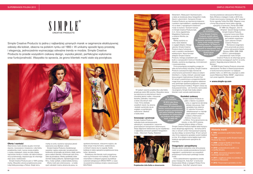 SUPERBRANDS POLSKA 2012 simple creative products również prestiżowe odznaczenie Mistrzynie Wolańskim, Mateuszem Stankiewiczem, Stylu XX-lecia w kategorii moda w 2010 roku. a także ze światowej sławy fotografem mody Z kolei renomowany miesięcznik „Elle” przyznał Alexim Lubomirskim. Kampanie Simple firmie nagrodę Trofea Elle 2002. Magazyn wraz Creative Products są niezmiennie kojarzone z firmą Olay przyznał marce także nagrodę z polskimi topmodelkami, współpracującymi specjalną w konkursie „Trendy Elle 2006”. na co dzień z największymi kreatorami W 1999 roku Magazyn „Dom & mody na świecie. Twarzami kampaTo, czego Wnętrze” docenił design butików nii Simple Creative Products były nie wiedziałeś Simple Creative Products m.in. Anna Jagodzińska, Firma Simple Creative i przyznał marce tytuł Złote Magdalena Frąckowiak, Products wydała album Miejsce za prostotę, która a ostatnio Monika Jac poświęcony historii marki. jest znakiem rozpoznawJagaciak. Na świecie wszystkie największe czym salonów Simple Markę wyróżnia na domy mody wydają książki Creative Products. rynku także dbałość o swojej marce. W Polsce to Biznesowe osiągnięcia o wygląd sklepów. Design wydanie pionierskie i wyjątkowe firmy przyniosły jej czterosalonów Simple Creative – docenił to miesięcznik Twój krotne odznaczenie Gazele Products łączy funkcjonalStyl przyznając firmie tytuł Biznesu (2004, 2006, 2009 ność z wysokim standardami Doskonałość i 2010 r.), potwierdzające estetycznymi. Nowy koncept Mody 2011. przynależność marki Simple sklepów Simple Creative Creative Products do elitarnego grona Products, którego przykładem jest najdynamiczniej rozwijających się firm na rynku butik w warszawskim Centrum Handlowym polskim. Nagrodę przyznał dziennik „Puls Arkadia, wyróżnia się elegancją, minimalizmem Biznesu”. i nowoczesnością. W 2009 Simple Creative Products otrzymało Firma przywiązuje szczególną uwagę nie odznaczenie The Best In Poland przyznawane tylko do komunikacji wizualnej. Simple Creative w konkursie konsumenckim na najlepsze Products sukcesywnie dąży również do polskie marki, a w 2010 roku zwycięża w plebiutrzymywania partnerskich relacji ze stałymi scycie Wyborowa Marka ‘89/09”, organizowaklientkami, z myślą o których, powstał wyjątnym przez tygodnik „Newsweek”. kowy program lojalnościowy Simple Club. W ramach uczestnictwa w programie klientki mogą liczyć na specjalne programy rabatowe www.simple-cp.com oraz zamknięte spotkania połączone z prezentacją limitowanych kolekcji. Program cieszy się dużą popularnością – od momentu wprowadzenia programu Simple Club liczba stałych klientek marki wzrosła siedmiokrotnie. Simple Creative Products to jedna z najbardziej uznanych marek w segmencie ekskluzywnej odzieży dla kobiet, obecna na polskim rynku od 1993 r. W unikalny sposób łączy prostotę i elegancję, jednocześnie wyznaczając odważne trendy w modzie. Simple Creative Products to przede wszystkim ciekawy design, wysoka jakość, perfekcyjne wykonanie oraz funkcjonalność. Wszystko to sprawia, że grono klientek marki stale się powiększa. Oferta i wartości Wzornictwo marki określa się jako minimalistyczne, nowoczesne i kreatywne. Lidia Kalita, projektantka marki, tworzy swoje projekty z myślą o kobietach, które nie tylko śledzą najnowsze trendy w modzie, ale także kreatywnie je przetwarzają, dopasowując do własnego stylu życia i osobowości. Simple Creative Products jest w 100% polską marką. Wszystkie ubrania projektowane przez Lidię Kalitę powstają w Polsce. Dzięki temu 98 W każdym sezonie projektantka Lidia Kalita projektuje około 350 wzorów. Wszystkie rzeczy są wykonane ze szlachetnych tkanin (wysokiej jakości wełen, mieszanek Kontekst rynkowy To, czego bawełny, jedwabiu i kaszmiru), Simple Creative Products to nie wiedziałeś a także naturalnych skór jeden z liderów na polskim W 2012 roku firma i futer. Firma dokłada rynku w segmencie damskiej otworzyła własny wszelkich starań, by ubrania odzieży luksusowej. Sieć showroom. W industrialnym, i dodatki wyróżniały się ze sprzedaży liczy obecnie bardzo nowocześnie zaaranżowzględu na perfekcyjne 51 salonów firmowych, wanym wnętrzu prezentowana wykonanie i dbałość zlokalizowanych w najwiękjest pełna kolekcja, dostępna o każdy detal. szych polskich miastach, dla stylistów do wykorzystaa także w Niemczech nia podczas sesji zdjęcio(Kolonia i Essen) oraz Innowacje i promocje wych, a także dla w Wilnie. Firma dynamicznie się Simple Creative Products gwiazd. rozwija, w roku 2012 zostaną wzbudza duże zainteresowanie otwarte kolejne sklepy w Polsce. odważnymi, nowatorskimi i starannie Simple Creative Products będzie także kontynuprzemyślanymi kampaniami reklamowymi. ować ekspansję zagraniczną – do końca 2012 Sesje zdjęciowe realizowane są we współpracy roku w ramach umów franczyzowych pojawią z najbardziej cenionymi polskimi fotografami się dwa sklepy na terenie Rosji. W tym samym mody – Marcinem Tyszką, Robertem roku firma rozpocznie sprzedaż swoich kolekcji on-line. W e-sklepie można będzie kupić mini kolekcje zaprojektowane specjalnie do internetu. markę na rynku wyróżnia najwyższa jakość wykonania oraz dbałość o detal. Simple Creative Products charakteryzuje wyrazisty i spójny wizerunek, konsekwentnie budowany od początku jej istnienia, dzięki czemu grono stałych klientek i miłośniczek stylu firmy stale się powiększa. Markę upodobały sobie również osoby publiczne, reprezentujące świat filmu, mody i polityki, a także kobiety biznesu. Oferta marki jest zróżnicowana – w kolekcjach odnaleźć można ubrania do pracy, na spotkania biznesowe, wieczorne wyjścia, ale także stroje mniej formalne, weekendowe, w których stawia się na wygodę. Każda kolekcja to także specjalnie projektowane buty, torby i akcesoria. Dodatkowo dla klient