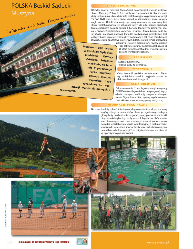 POLSKA Beskid Sądecki Muszyna ny renali Fa b r y k . a s i n e t zkoła s a n l jona Pr o f e s a ad Z A K WAT E R O WA N I E Ośrodek Sportu i Rekreacji Alpina Sport położony jest w części uzdrowiskowej Muszyny. Pokoje 2, 3, 4 - osobowe z łazienkami. W obiekcie znajdują się: kawiarnia, dwie duże sale wielofunkcyjne wyposażone w sprzęt: TV SAT, DVD, video, duży ekran, rzutnik multimedialny, sprzęt grający, nagłośnienie. Obiekt dysponuje specjalną infrastrukturą sportową: boiskiem wielofunkcyjnym ze sztucznej trawy (do piłki nożnej, siatkówki, tenisa), boiskiem do piłki nożnej, 6 kortami tenisowymi ziemnymi, ścianą tenisową, 2 kortami tenisowymi ze sztucznej trawy, boiskiem do koszykówki i siatkówki plażowej. Ponadto do dyspozycji uczestników jest: odkryty basen kąpielowy, basen kryty oddalony o 100 m od ośrodka, grillowisko, ścieżki spacerowe i rowerowe, bilard, stół do tenisa stołowego, piłkarzyki stołowe, badminton, rowery górskie. Przy zakwaterowaniu pobierana jest kaucja 50 Muszyna – uz drowisko zł, która zwracana jest w dniu wyjazdu, o ile nie w Beskidzie zostaną wyrządzone szkody. Sądeckim , niedaleko Kr ynicy TRANSPORT Górskiej. Po łożone Autokar turystyczny. w kotlinie, na Rozkład jazdy na stronie 62. tere nie Popradzk WYŻYWIENIE iego Parku Krajob Całodzienne (3 posiłki + podwieczorek). Pierwrazowego stan szy posiłek: kolacja w dniu przyjazdu, ostatni poowi siłek: śniadanie w dniu wyjazdu. wspaniałą ba zę w ypadową do CENA OBEJMUJE organizacji w ycie czek pieszych Zakwaterowanie (11 noclegów z wyjątkiem grupy rowerow ych. i OPSM06 - 8 noclegów i skrócony program), wyzy- wienie, transport, realizację programu, ubezpieczenie Signal Iduna S.A., opiekę wychowawców - instruktorów, całodobową opiekę medyczną. I N F O R M AC J E P R A KT YC Z N E organizator: ALMATUR OPOLE Na wyjazd należy zabrać: śpiwór na nocleg w namiocie podczas wyprawy w góry - dotyczy uczestników obozu przygodowego, nakrycie głowy, buty do chodzenia po górach, mały plecak na wycieczki, nieprzemakalną kurtkę, ciepły sweter lub polar. Na obóz sportowy - obuwie sportowe i dres sportowy. Uczestnicy obozu muszą posiadać wpis lekarza w karcie kwalifikacyjnej o braku przeciwwskazań do uprawiania sportu. Każdy uczestnik obozu otrzyma: pamiątkowy dyplom, płytę CD ze zdjęciami obozowymi i koszulkę z pamiątkowymi nadrukami. Z ISIC zniżki do 100 zł na imprezy z tego katalogu www.almatur.pl Kolonia tenisowa (10 – 14 lat) Obóz tenisowy (15 - 18 lat) Obóz przeznaczony jest dla młodzieży zainteresowanej nauką i doskonaleniem gry w tenisa ziemnego. Każdy uczestnik ma zagwarantowane dwa treningi dziennie, po 1,5 godziny na kortach ziemnych oraz ze sztucznej trawy. Uczestnicy obozu nie muszą posiadać własnych rakiet tenisowych. Zapewniamy najnowsze modele rakiet firm Dunlop i Slazenger. Program pobytu uzupełnią wycieczki, wyjścia do miasteczka wodnego, dyskoteki, ogniska, konkursy itp. Kolonia (10 – 14 lat) Obóz survivalowo - przygodowy (15 – 18 lat) Fabryka Adrenaliny. Przygoda i survival. Obozy przeznaczone dla osób lubiących aktywny wypoczynek. Bogaty program zapewnia, że na obozie w Muszynie nie ma ani chwili na nudę. Rodzaj i czas zajęć jest określony w programie, który gawrantuje maksymalną ilość wrażeń dla każdego z uczestników. Obóz ma za zadanie rozwijać wśród uczestników umiejętność pracy w grupie (team building) jednocześnie zapewniając dobrą zabawę oraz uczyć zasad bezpieczeństwa przy uprawianiu dyscyplin proponowanych w programie. Program Terminy Obóz tenisowy Obóz survivalowo – przygodowy OPSM 01 23.06-04.07 1.549 zł 1.699 zł OPSM 02 05.07-16.07 1.549 zł 1.699 zł OPSM 03 17.07-28.07 1.549 zł 1.699 zł OPSM 04 29.07-09.08 1.549 zł 1.699 zł OPSM 05 10.08-21.08 1.549 zł 1.699 zł OPSM 06* 22.08-30.08 1.299 zł 1.449 zł Zniżka dla Stałych Klientów - 50 zł First Minute - zniżka 100 zł do 28.02.2009 r. Wiosenna Promocja - zniżka 50 zł do 31.03.2009 r. Szczegóły na str.2. i złożonej gry w terenie górskim (3 razy po 2 godz.). Quady – to pojazdy na każdą drogę łączące w sobie cechy samochodu terenowego i motoru, pozwalają na bezpieczne poruszanie się w każdym, nawet bardzo trudnym, górskim terenie. Uczestnicy będą mogli poznać ich możliwości na 3 wycieczkach (3 razy po 2, 5 godz., grupy do 8 osób). Orienteering – to zajęcia, w czasie których uczestnicy nauczą się czytania mapy, posługiwania się kompasem oraz obsługi urządzenia do nawigacji GPS. Po takich zajęciach nie będzie problemu z odnalezieniem drogi w lesie, czy udziału w biegu na orientację (3 razy po 2 godz.). Pierwsza pomoc przedmedyczna – to zajęcia uczące pierwszej pomocy w nagłych wypadkach. Uczestnicy nauczą się jak m.in.: tamować krwotok, unieruchamiać złamane kończyny oraz podstawowych zasad postępowania w ratownictwie medycznym (3 razy po 2 godz.). Spotkanie z ratownikiem GOPR. Strzelanie, zajęcia obejmą strzelanie z karabinka pneumatycznego oraz łuku. Uczestnicy zapoznają się z karabinkiem pneumatycznym i odbędą strzelanie na strzelnicy do tarczy z różnych odległości oraz do ruchomego celu. Zajęcia uczą obchodzenia się z bronią oraz szczególnych zasad bezpieczeństwa panujących na strzelnicy (3 razy po 2 godz.). Zajęcia na basenie mają stanowić formę rekreacyjną, wypoczynku i odnowy biologicznej po wyczerpujących dniach (3 razy po 2 godz.). Rowery górskie - zajęcia obejmują trzy wycieczki w góry, w terenie o różnej skali trudności: od łatwej do trudnej (3 razy po 2 godz., grupy do 8 osób). Program uzupełnią gry zespołowe, czyli zajęcia rekreacyjne z poszczególnych dyscyplin sportowych takich jak: piłka nożna, koszykówka, piłka siatkowa, uni hokej. Zajęcia będą się odbywać na boiskach otwartych oraz na hali sportowej (2 razy po 2 godz.). organizator: ALMATUR OPOLE Zajęcia linowe, które w sposób szczeg