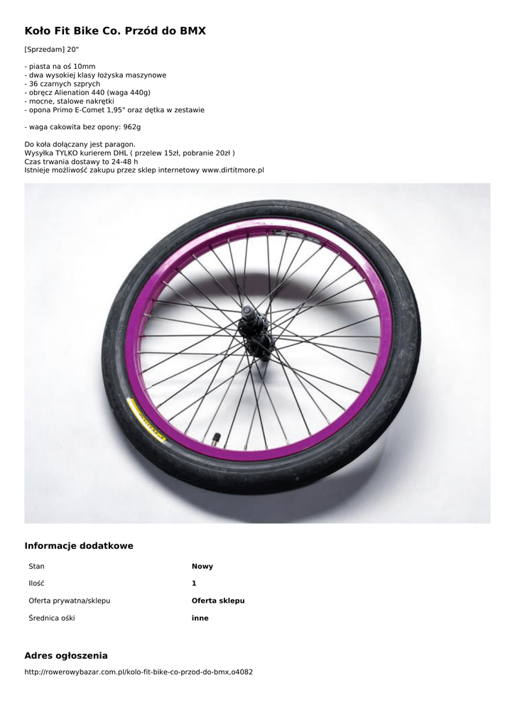 Koło Fit Bike Co. Przód do BMX [Sprzedam] 20" - piasta na oś 10mm dwa wysokiej klasy łożyska maszynowe 36 czarnych szprych obręcz Alienation 440 (waga 440g) mocne, stalowe nakrętki opona Primo E-Comet 1,95" oraz dętka w zestawie - waga cakowita bez opony: 962g Do koła dołączany jest paragon. Wysyłka TYLKO kurierem DHL ( przelew 15zł, pobranie 20zł ) Czas trwania dostawy to 24-48 h Istnieje możliwość zakupu przez sklep internetowy www.dirtitmore.pl Informacje dodatkowe Stan Nowy Ilość 1 Oferta prywatna/sklepu Oferta sklepu Średnica ośki inne Adres ogłoszenia http://rowerowybazar.com.pl/kolo-fit-bike-co-przod-do-bmx,o4082 Kontakt Mail: [email protected] Telefon: 664-591-159 Lokalizacja ul. Dereniowa 6, Warszawa Mazowieckie (Polska) Ogłoszenie dodano: 2016-06-23 16:24:14 Ogłoszenie wygasa: 2016-06-27 17:14:42 Powered by TCPDF (www.tcpdf.org)