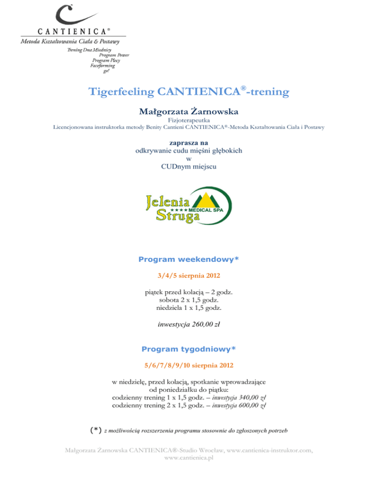 Tigerfeeling CANTIENICA®-trening Małgorzata Żarnowska Fizjoterapeutka Licencjonowana instruktorka metody Benity Cantieni CANTIENICA®-Metoda Kształtowania Ciała i Postawy zaprasza na odkrywanie cudu mięśni głębokich w CUDnym miejscu Program weekendowy* 3/4/5 sierpnia 2012 piątek przed kolacją – 2 godz. sobota 2 x 1,5 godz. niedziela 1 x 1,5 godz. inwestycja 260,00 zł Program tygodniowy* 5/6/7/8/9/10 sierpnia 2012 w niedzielę, przed kolacją, spotkanie wprowadzające od poniedziałku do piątku: codzienny trening 1 x 1,5 godz. – inwestycja 340,00 zł codzienny trening 2 x 1,5 godz. – inwestycja 600,00 zł (*) z możliwością rozszerzenia programu stosownie do zgłoszonych potrzeb Małgorzata Żarnowska CANTIENICA®-Studio Wrocław, www.cantienica-instruktor.com, www.cantienica.pl WARUNKI UDZIAŁU Rezerwacaja miejsca: poprzez wpłatę na konto M .Zarnowska CANTIENICA-Studio Konto nr 50 1030 0019 0109 8530 0038 5186 Tytuł płatności: imię i nazwisko uczestni(ka)czki, Kowary, data: 3-5 sierpień lub 5-10 sierpień. Ze względu na ograniczenie liczby miejsc, decydujące znaczenie ma kolejność dokonania wpłaty! W przypadku nadesłania większej liczby zgłoszeń nastąpi zwrot opłaty lub zostaną zaproponowane dodatkowe terminy. Zgłoszenie na email: [email protected] . (warsztat, imię i nazwisko, nr. telefonu) Aby zgłoszenie nie zostało przeoczone w spamach nadaj wiadomości tytuł: CANTIENICA-Kowary Potwierdzenie nadejścia wpłaty i otrzymania miejsca otrzymasz na podany przez Ciebie adres email wraz z ankietą, którą po wypełnieniu należy odesłać przed warsztatami. Ankieta jest obligatoryjna i służy optymalizacji treningu, bezpieczeństwu, uwzględnieniu Twoich potrzeb i oczekiwań. Wszelkie zapytania należy kierować na email: [email protected] lub tel. 601 239 776 – Małgorzata Żarnowska O możliwościach profilaktyki i terapii ruchem według metody CANTIENICA® czytaj na http://www.cantienica-instruktor.com/pl/glossar.html ZAKWATEROWANIE Prosimy pytać o pakiet dla CANTIENICA® Przykładowa oferta: Pakiet dla CANTIENICA® - 3- Dniowy Jelenia Struga MEDICAL SPA – CUDna wySPA Karkonoszy zaprasza na CUDny pobyt w Karkonoszach. Bliskość górskich szlaków, karkonoska przyroda, atrakcje kotliny Jeleniogórskiej i czeskiej strony Karkonoszy, przestronne pokoje, wyborna kuchnia, atrakcje wellness, rozrywka dla wszystkich - u nas zapomina się o nudzie! Małgorzata Żarnowska CANTIENICA®-Studio Wrocław, www.cantienica-instruktor.com, www.cantienica.pl 3 dniowy pakiet zawiera: o 2 noclegi w pokoju typu superior o o o Pakiet kulinarny: 2x Śniadania w formie bufetu pełnego zdrowej żywności 2 x obiady 2 x kolacje Codzienne Atrakcje Wellness: -Skojarzona Terapia Radonowa – inhalacje radonowe prowadzone w podziemnej grocie skojarzone z ćwiczeniami w ciepłej wodzie basenu. -Poranny rozruch połączony z brodzeniem w górskim strumieniu metodą Sebastiana Kneippa. - Korzystanie z basenu z przeciwprądem i niespotykanym widokiem na podwodną recepcję - seanse w saunie fińskiej z kąpielą w górskim strumieniu o o o o o Smakoszy zachęcamy również do zamawiania dań a la carte oraz przepysznych deserów Potencjałka AOx – unikalna woda antyoksydacyjna Korzystanie z Biblioteki Indyjskiej z bogatym księgozbiorem Bezpłatny dostęp do Internetu, Sejf w każdym pokoju, Monitorowany parking Wiele pomysłów na spędzenie CUDownych chwil w okolicy: wycieczki rowerowe, nauka pływania dla dzieci, jazda konna, korty tenisowe, teatr, sztuka, zwiedzanie Zamku Książ i wiele innych. (Atrakcje dodatkowo płatne). o Bogata oferta CUDnych zabiegów SPA. Nowość! Zabiegi Pat & Rub polecane przez Kingę Rusin. Specjalnie dla Państwa na wszystkie zabiegi SPA rabat 15% Ceny: Cena pakietu dla 1 osoby w 2-osobowym pokoju Superior: 392 zł Rezerwacji prosimy dokonywać drogą mailową: [email protected] lub telefonując pod numer 75 75 28 404, www.jeleniastruga.pl również dla Państwa specjalna oferta na pobyt tygodniowy. Małgorzata Żarnowska CANTIENICA®-Studio Wrocław, www.cantienica-instruktor.com, www.cantienica.pl