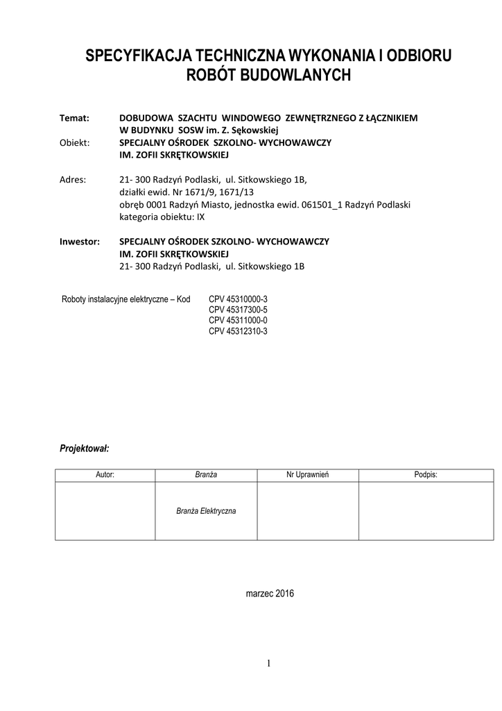 SPECYFIKACJA TECHNICZNA WYKONANIA I ODBIORU ROBÓT BUDOWLANYCH Temat: DOBUDOWA SZACHTU WINDOWEGO ZEWNĘTRZNEGO Z ŁĄCZNIKIEM W BUDYNKU SOSW im. Z. Sękowskiej SPECJALNY OŚRODEK SZKOLNO- WYCHOWAWCZY IM. ZOFII SKRĘTKOWSKIEJ Obiekt: Adres: 21- 300 Radzyń Podlaski, ul. Sitkowskiego 1B, działki ewid. Nr 1671/9, 1671/13 obręb 0001 Radzyń Miasto, jednostka ewid. 061501_1 Radzyń Podlaski kategoria obiektu: IX Inwestor: SPECJALNY OŚRODEK SZKOLNO- WYCHOWAWCZY IM. ZOFII SKRĘTKOWSKIEJ 21- 300 Radzyń Podlaski, ul. Sitkowskiego 1B Roboty instalacyjne elektryczne – Kod CPV 45310000-3 CPV 45317300-5 CPV 45311000-0 CPV 45312310-3 Projektował: Autor: Nr Uprawnień Branża Branża Elektryczna marzec 2016 1 Podpis: SPIS TREŚCI: 1. CZĘŚĆ OGÓLNA ................................................................................................................ 5 1.1 Nazwa zamówienia ........................................................................................................................... 5 1.2 Przedmiot specyfikacji i zakres robót budowlanych .................................................................... 5 1.3 Wyszczególnienie prac towarzyszących ......................................................................................... 5 1.4 Informacje o terenie budowy .......................................................................................................... 5 1.5 Nazwy i kody robót CPV ................................................................................................................. 6 1.6 Określenia podstawowe ................................................................................................................... 7 2. WYMAGANIA DOTYCZĄCE WŁAŚCIWOŚCI WYROBÓW BUDOWLANYCH ................. 7 2.1 Ogólne wymagania dotyczące wyrobów stosowanych przy budowie instalacji elektrycznych. 7 2.2 Niezbędne wymagania związane z transportowaniem i przechowywaniem wyrobów stosowanych przy budowie instalacji elektrycznych ........................................................................... 7 2.2.1 Wymagania ogólne ...................................................................................................................... 7 2.2.2 Transport materiałów. ................................................................................................................. 7 2.2.3 Odbiór i przyjmowanie materiałów, wyrobów i urządzeń –kontrola jakości. ............................ 8 2.2.4 Składowanie materiałów. ............................................................................................................ 8 3. WYMAGANIA DOTYCZĄCE SPRZĘTU I MASZYN PRZEWIDZIANYCH DO WYKONANIA ROBÓT ............................................................................................................ 8 3.1 Maszyny i urządzenia stosowane przy wykonywaniu robót elektrycznych............................... 8 4. WYMAGANIA DOTYCZĄCE ŚRODKÓW TRANSPORTU................................................. 9 4.1 Ogólne wymagania dotyczące transportu ................................................................................ 9 5. WYMAGANIA DOTYCZĄCE WYKONANIA ROBÓT. ........................................................ 9 5.1 Wymagania ogólne dotyczące wykonywania instalacji elektrycznych........................................ 9 5.1.1 Tablice elektryczne. .................................................................................................................... 9 5.1.2 Trasowanie. ................................................................................................................................. 9 5.1.3 Kucie bruzd. ................................................................................................................................ 9 5.1.4 Wykonanie przebić. ..................................................................................................................... 9 5.1.5 Zaprawianie bruzd i przebić. ..................................................................................................... 10 5.1.6 Montaż konstrukcji wsporczych i uchwytów. ........................................................................... 10 5.1.7 Układanie rur. ............................................................................................................................ 10 5.1.8 Instalowanie puszek. ................................................................................................................. 10 5.1.9 Układanie przewodów. ............................................................................................................. 10 5.1.10 Układanie przewodów w rurach. ............................................................................................. 11 5.1.11 Układanie przewodów na uchwytach. ..................................................................................... 11 5.1.12 Układanie przewodów w tynku. .............................................................................................. 11 2 5.1.13 Układanie przewodów na drabinkach i korytkach kablowych. ............................................... 11 5.1.14 Łączenie przewodów. .............................................................................................................. 11 5.1.15 Podejścia do odbiorników i przyłączenie odbiorników. ......................................................... 11 5.1.16 Demontaż opraw oświetleniowych i osprzętu. ........................................................................ 12 5.1.17 Montaż gniazd wtyczkowych i łączników. ............................................................................. 12 5.1.18 Montaż opraw oświetleniowych. ............................................................................................. 12 5.1.19 Montaż aparatów. ................................................................................................................