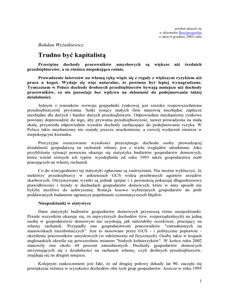 artykuł ukazał się w dzienniku Rzeczpospolita w dniu 6 grudnia 2003 roku Bohdan Wyżnikiewicz Trudno być kapitalistą Przeciętne dochody pracowników umysłowych przedsiębiorców, a ta różnica niepokojąco rośnie. są większe niż średnich Prowadzenie interesów na własną rękę wiąże się z reguły z większym ryzykiem niż praca u kogoś. Wydaje się więc naturalne, że powinno być lepiej wynagradzane. Tymczasem w Polsce dochody drobnych przedsiębiorców bywają mniejsze niż dochody pracowników, co nie pozostaje bez wpływu na skłonność do podejmowania takiej działalności. Jednym z warunków rozwoju gospodarki rynkowej jest szeroko rozpowszechniona przedsiębiorczość prywatna. Setki tysięcy małych firm stanowią niezbędne zaplecze niezbędne dla dużych i bardzo dużych przedsiębiorstw. Odpowiednie mechanizmy rynkowe powinny doprowadzić do tego, aby prywatna przedsiębiorczość, nawet prowadzona na małą skalę, przynosiła odpowiednio wysokie dochody zachęcające do podejmowania ryzyka. W Polsce takie mechanizmy nie zostały jeszcze uruchomione, a rozwój wydarzeń zmierza w niepokojącym kierunku. Precyzyjne oszacowanie wysokości przeciętnego dochodu osoby prowadzącej działalność gospodarczą na rachunek własny jest z wielu względów utrudnione. Jako przybliżenie sytuacji pomocna okazuje się statystyka budżetów gospodarstw domowych, która wśród różnych ich typów wyodrębniła od roku 1993 także gospodarstwa osób pracujących na własny rachunek. Co do wiarygodności tej statystyki zgłaszane są zastrzeżenia. Nie można wykluczyć, że niektórzy przedsiębiorcy w ankieterach GUS widzą przebranych agentów urzędów skarbowych. Otrzymywane wyniki są jednak spójne i z pewnością pokazują długookresowe prawidłowości i trendy w dochodach gospodarstw domowych, które w inny sposób nie byłyby możliwe do uchwycenia. Rotacja losowo wybieranych gospodarstw do prób poddawanych badaniom ogranicza popełnianie systematycznych błędów. Niespodzianki w statystyce Dane statystyki budżetów gospodarstw domowych przynoszą różne niespodzianki. Przede wszystkim okazuje się, że najwyższych dochodów (tzw. rozporządzalnych) na jedną osobę w gospodarstwie domowym nie uzyskują, jak należałoby oczekiwać, pracujący na własny rachunek. Przypadły one gospodarstwom pracowników "zatrudnionych na stanowiskach nierobotniczych". Jest to stosowane przez GUS - i politycznie poprawne określenie pracowników umysłowych (w odróżnieniu od fizycznych). Osoby takie w krajach anglosaskich określa się powszechnie mianem "białych kołnierzyków". W końcu roku 2002 stanowiły one około 44 procent zatrudnionych. Dochody gospodarstw domowych utrzymujących się z działalności na rachunek własny, czyli drobnych przedsiębiorców, znajdują się na drugim miejscu. Kolejnym zaskoczeniem jest fakt, że od drugiej połowy dekady lat 90. zaczęła się powiększać różnica w wysokości dochodów obu tych grup gospodarstw. Jeszcze w roku 1995 1 średnie miesięczne dochody na osobę w rodzinach drobnych przedsiębiorców były niższe o 1,2 proc. niż wśród "białych kołnierzyków", ale w roku 1996 różnica ta wzrosła do 7,4 proc., a w roku 2001 - nawet do 12,3 procent. Poziom dochodu rodzin "białych kołnierzyków" z roku 2000 nie został osiągnięty przez rodziny utrzymujących się z pracy na rachunek własny jeszcze w roku 2002. Faktyczny dystans w czasie wynosi dwa i pół roku. W poprzednich latach to opóźnienie było zaledwie kilkumiesięczne. Trudno tłumaczyć narastanie różnic na niekorzyść przedsiębiorców fazami cyklu koniunkturalnego:. Na lata 1996 i 1997 przypada bowiem szczytowy okres przyspieszenia wzrostu gospodarczego. Gdyby zatem mechanizmy rynkowe działały sprawnie, dochody przedsiębiorców przewyższyłyby w tym czasie dochody utrzymujących się z pracy najemnej. Niższa dynamika wzrostu tych dochodów w czasie rozkwitu koniunktury wręcz przeczy zdrowemu rozsądkowi. Kto pracuje na siebie? Tezy, że osoby utrzymujący się z działalności na rachunek własny zaniżają swoje dochody i korzystają z możliwości włączenia swojej konsumpcji osobistej w koszty działalności, nie należy całkowicie lekceważyć, lecz nie można jej też demonizować. Praktyki takie - jeżeli są stosowane - dotyczą w większej mierze firm dużych niż małych. Przedsiębiorcy prowadzący interesy na dużą skalę, których nazwiska trafiają na listy najbogatszych, z całą pewnością nie dostarczają informacji ankieterom GUS badającym budżety gospodarstw domowych. Uniwersalnym zjawiskiem w skali międzynarodowej jest pomijanie w tych badaniach osób o najwyższych i najniższych dochodach. Dzieje się tak dlatego, że osoby najzamożniejsze nie ujawniają nikomu swoich dochodów i wydatków, a ponadto ich sytuacja materialna nie leży w kręgu zainteresowań polityki społecznej, dla której potrzeb przede wszystkim bada się budżety rodzinne. Z kolei dotarcie do najuboższych gospodarstw domowych jest niezmiernie trudne. Z perspektywy całego kraju działalność na rachunek własny nie prowadzi do osiągania niebotycznych dochodów. Odmienna jest przy tym sytuacja osób działających w dużych miastach i w mniejszych miejscowościach, gdzie poziom dochodów jest znacznie niższy. W wielu przypadkach prowadzenie działalności gospodarczej stanowi ucieczkę przed bezrobociem pozwalającą na uzyskiwanie tylko głodowych dochodów, co jest bardziej akceptowalne niż pozostawanie na utrzymaniu budżetu państwa czy opieki społecznej. Statystyka GUS opisująca ubóstwo pokazuje, że w roku 2001 wśród gospodarstw domowych uzyskujących dochody poniżej minimum socjalnego było 44,5 procent osób z gospodarstw domowych pracujących na rachunek własny (32,3 proc. osób z rodzin "białych kołnierzyków"). Zdumiewa, że aż 5,1 procent osób w rodzinach drobnych przedsiębiorców osiągało dochody poniż