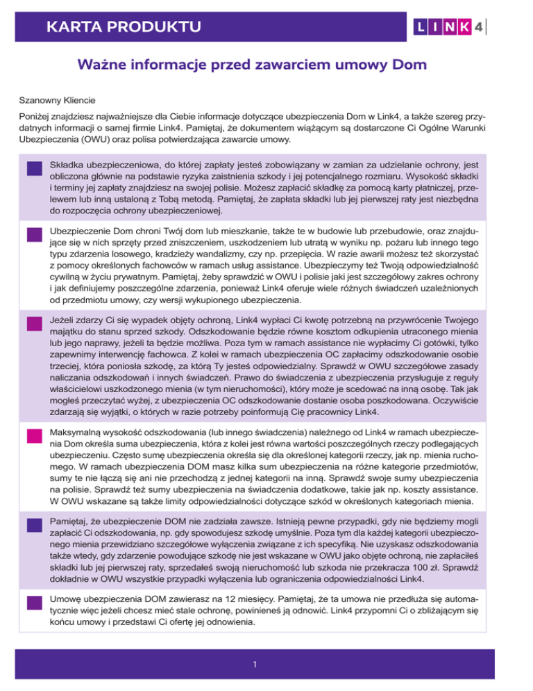 KARTA PRODUKTU Ważne informacje przed zawarciem umowy Dom Szanowny Kliencie Poniżej znajdziesz najważniejsze dla Ciebie informacje dotyczące ubezpieczenia Dom w Link4, a także szereg przydatnych informacji o samej firmie Link4. Pamiętaj, że dokumentem wiążącym są dostarczone Ci Ogólne Warunki Ubezpieczenia (OWU) oraz polisa potwierdzająca zawarcie umowy. Składka ubezpieczeniowa, do której zapłaty jesteś zobowiązany w zamian za udzielanie ochrony, jest obliczona głównie na podstawie ryzyka zaistnienia szkody i jej potencjalnego rozmiaru. Wysokość składki i terminy jej zapłaty znajdziesz na swojej polisie. Możesz zapłacić składkę za pomocą karty płatniczej, przelewem lub inną ustaloną z Tobą metodą. Pamiętaj, że zapłata składki lub jej pierwszej raty jest niezbędna do rozpoczęcia ochrony ubezpieczeniowej. Ubezpieczenie Dom chroni Twój dom lub mieszkanie, także te w budowie lub przebudowie, oraz znajdujące się w nich sprzęty przed zniszczeniem, uszkodzeniem lub utratą w wyniku np. pożaru lub innego tego typu zdarzenia losowego, kradzieży wandalizmy, czy np. przepięcia. W razie awarii możesz też skorzystać z pomocy określonych fachowców w ramach usług assistance. Ubezpieczymy też Twoją odpowiedzialność cywilną w życiu prywatnym. Pamiętaj, żeby sprawdzić w OWU i polisie jaki jest szczegółowy zakres ochrony i jak definiujemy poszczególne zdarzenia, ponieważ Link4 oferuje wiele różnych świadczeń uzależnionych od przedmiotu umowy, czy wersji wykupionego ubezpieczenia. Jeżeli zdarzy Ci się wypadek objęty ochroną, Link4 wypłaci Ci kwotę potrzebną na przywrócenie Twojego majątku do stanu sprzed szkody. Odszkodowanie będzie równe kosztom odkupienia utraconego mienia lub jego naprawy, jeżeli ta będzie możliwa. Poza tym w ramach assistance nie wypłacimy Ci gotówki, tylko zapewnimy interwencję fachowca. Z kolei w ramach ubezpieczenia OC zapłacimy odszkodowanie osobie trzeciej, która poniosła szkodę, za którą Ty jesteś odpowiedzialny. Sprawdź w OWU szczegółowe zasady naliczania odszkodowań i innych świadczeń. Prawo do świadczenia z ubezpieczenia przysługuje z reguły właścicielowi uszkodzonego mienia (w tym nieruchomości), który może je scedować na inną osobę. Tak jak mogłeś przeczytać wyżej, z ubezpieczenia OC odszkodowanie dostanie osoba poszkodowana. Oczywiście zdarzają się wyjątki, o których w razie potrzeby poinformują Cię pracownicy Link4. Maksymalną wysokość odszkodowania (lub innego świadczenia) należnego od Link4 w ramach ubezpieczenia Dom określa suma ubezpieczenia, która z kolei jest równa wartości poszczególnych rzeczy podlegających ubezpieczeniu. Często sumę ubezpieczenia określa się dla określonej kategorii rzeczy, jak np. mienia ruchomego. W ramach ubezpieczenia DOM masz kilka sum ubezpieczenia na różne kategorie przedmiotów, sumy te nie łączą się ani nie przechodzą z jednej kategorii na inną. Sprawdź swoje sumy ubezpieczenia na polisie. Sprawdź też sumy ubezpieczenia na świadczenia dodatkowe, takie jak np. koszty assistance. W OWU wskazane są także limity odpowiedzialności dotyczące szkód w określonych kategoriach mienia. Pamiętaj, że ubezpieczenie DOM nie zadziała zawsze. Istnieją pewne przypadki, gdy nie będziemy mogli zapłacić Ci odszkodowania, np. gdy spowodujesz szkodę umyślnie. Poza tym dla każdej kategorii ubezpieczonego mienia przewidziano szczegółowe wyłączenia związane z ich specyfiką. Nie uzyskasz odszkodowania także wtedy, gdy zdarzenie powodujące szkodę nie jest wskazane w OWU jako objęte ochroną, nie zapłaciłeś składki lub jej pierwszej raty, sprzedałeś swoją nieruchomość lub szkoda nie przekracza 100 zł. Sprawdź dokładnie w OWU wszystkie przypadki wyłączenia lub ograniczenia odpowiedzialności Link4. Umowę ubezpieczenia DOM zawierasz na 12 miesięcy. Pamiętaj, że ta umowa nie przedłuża się automatycznie więc jeżeli chcesz mieć stale ochronę, powinieneś ją odnowić. Link4 przypomni Ci o zbliżającym się końcu umowy i przedstawi Ci ofertę jej odnowienia. 1 KARTA PRODUKTU W ciągu pierwszych 30 dni od zawarcia umowy możesz z niej dobrowolnie zrezygnować. Po upływie tego terminu umowa może się rozwiązać tylko w ściśle określonych przypadkach określonych w OWU. Umowa ulegnie też rozwiązaniu gdy sprzedasz swoją nieruchomość. Pamiętaj, że jeżeli poniesiesz szkodę po rozwiązaniu umowy, nie dostaniesz za nią odszkodowania. Jeżeli zdarzy Ci się szkoda, zadzwoń jak najszybciej pod numer 22 444 44 44. Jeżeli będziesz miał zastrzeżenia w stosunku do usług świadczonych przez Link4 możesz złożyć reklamację: w formie pisemnej (doręczyć osobiście albo przesyłką pocztową na adres Link4), ustnie (telefonicznie albo osobiście) lub w formie elektronicznej za pomocą formularza reklamacyjnego znajdującego się w serwisie internetowym Link4 (www.link4.pl). Reklamację możesz także złożyć agentowi ubezpieczeniowemu działającemu w imieniu lub na rzecz Link4, pod warunkiem złożenia jej w formie pisemnej lub na innym trwałym nośniku. Rozpatrzymy ją bez zbędnej zwłoki, nie później niż w terminie 30 dni od dnia jej otrzymania. W szczególnie skomplikowanych przypadkach reklamacja może być rozpatrzona w terminie dłuższym, przy czym nie może on przekroczyć 60 dni – w takim przypadku poinformujemy Cię o przyczynach opóźnienia, okolicznościach wymagających ustalenia oraz przewidywanym terminie rozpatrzenia reklamacji. O rozpatrzeniu reklamacji powiadomimy Cię w formie pisemnej, wysyłając odpowiedź przesyłką pocztową, chyba że zaznaczysz iż odpowiedź chciałbyś otrzymać za pośrednictwem poczty elektronicznej. Na stronie www. link4.pl możesz znaleźć szczegółowy regulamin. Masz też prawo rozpatrzenia sporów wynikających z umowy ubezpieczenia przez sąd polubowny przy Komisji Nadzoru Finansowego, a w przypadk