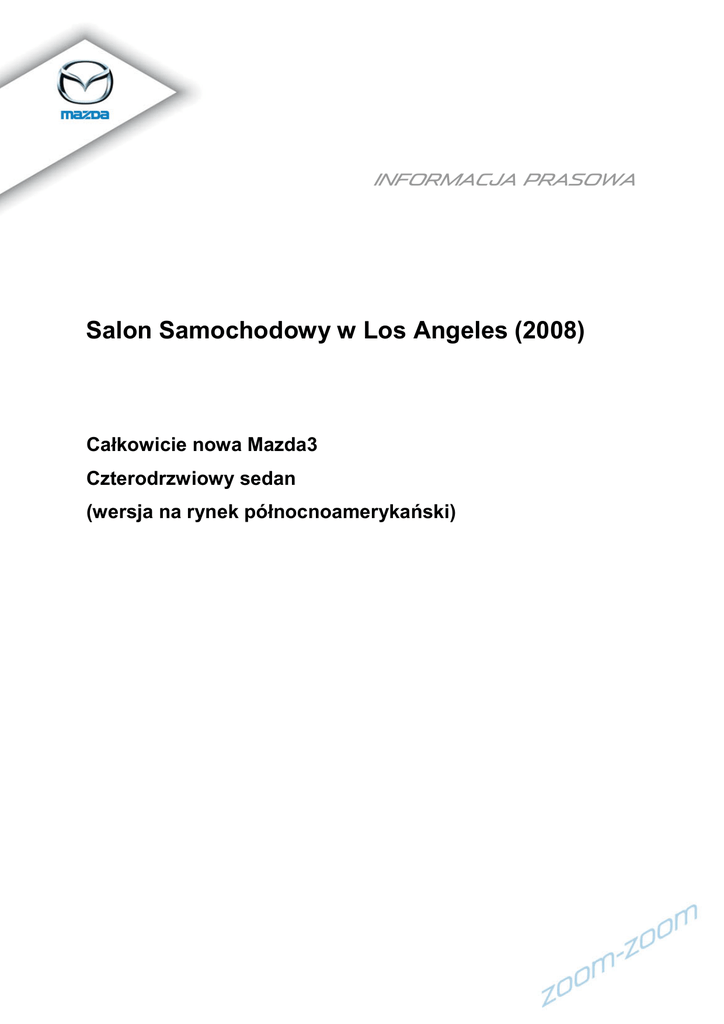 Informacja prasowa Salon Samochodowy w Los Angeles (2008) Ca kowicie nowa Mazda3 Czterodrzwiowy sedan (wersja na rynek pó nocnoameryka#ski) Los Angeles 2008 listopad 2008 www.mazda-press.pl 1/8 Niniejsza informacja prasowa jest podsumowaniem specyfikacji ca kowicie nowej Mazdy3, czterodrzwiowego sedana przygotowanego na rynek ameryka2ski. Wszystkie dane i specyfikacje mog+ by- ró)ne na innych rynkach. Dane mog+ ulec zmianie po homologacji. Zupe nie nowy, czterodrzwiowy sedan Mazda3 Sportowy kompakt, który zapewnia ogromn' przyjemno() z jazdy Ca kowicie nowa Mazda3 to jedna z najbardziej oczekiwanych premier podczas Salonu Samochodowego w Los Angeles 2008. Zosta a opracowana zgodnie z zasadami filozofii Mazdy zrównowa)onego Zoom-Zoom, zak adaj+cej tworzenie samochodów zapewniaj+cych rado,jazdy i przyjaznych dla ,rodowiska. Popularna Mazda3 – bestseller na ca ym ,wiecie – powraca w kompletnie zmienionej, drugiej generacji kompaktowego sedana, oferuj+c: • bogatszy wygl+d, bardziej dynamiczny design zewn1trzny, • wi1ksz+ przyjemno,- z jazdy dzi1ki lepszym osi+gom • przyjazny charakter dla ,rodowiska i bogatszy pakiet bezpiecze2stwa, • wy)szy standard i poziom dost1pnych opcji, • poziom dopracowania wy)szy ni) w jakimkolwiek innym samochodzie w tym segmencie rynku. Nowa Mazda3 jest doskonale przystosowana do szybko zmieniaj+cego si1 rynku samochodowego. Oferuje jako,-, styl, moc, dynamik1 oraz wykonanie, które trafiaj+ w oczekiwania dzisiejszych konsumentów. W sposób typowy dla Mazdy model Mazda3 oferuje wyposa)enie standardowe i opcjonalne, jakiego pró)no szuka- w innych samochodach tej klasy – dok adnie to, czego pragn+ klienci, szukaj+cy wyró)niaj+cego si1 samochodu. Wersja na 2010 rok ma mocn+ podstaw1: w ci+gu pi1ciu lat pierwsza generacja modelu Mazda3 zdoby a 90 nagród i znalaz a 1,8 miliona nabywców na ca ym ,wiecie. Jedna na trzy sprzedane Mazdy to Mazda3. Nawet pod koniec okresu produkcji pierwsza generacja modelu Mazda3 wci+) zdobywa a pochwa y – niedawno jeden z wiod+cych magazynów motoryzacyjnych nada jej tytu jednego z najbardziej niezawodnych kompaktowych sedanów dost1pnych na rynku. Mened)er programu Mazda3, Yoshiyuki Maeda, ustali ambitne cele dla najpopularniejszego modelu Mazdy: „Chcieli,my stworzy- nowy poziom wra)e2 z jazdy Zoom-Zoom, poniewa) to niepowtarzalne odczucie jest kwintesencj+ Mazdy. Korzystaj+c z sukcesu poprzedniego modelu Mazda3, pragn1li,my ponownie znacznie wyprzedzi- oczekiwania klientów na ca ym ,wiecie. Oznacza o to zapewnienie kierowcom poczucia zadowolenia czy to podczas jazdy, we wn1trzu Mazdy3, czy w chwili jej podziwiania z zewn+trz”. O tym, co znaczy skonstruowa- prawdziwie „,wiatowy samochód”, Maeda mówi: „Proces rozwojowy rozpocz+ si1 od uwa)nego zbadania i zidentyfikowania, jakie w a,ciwo,ci i osi+gi b1d+ konieczne. Pocz+tkowy etap zako2czy si1 wnioskiem, )e z ka)dej charakterystyki jazdy mo)na by o zaczerpn+- co,, co przyczyni oby si1 do uzyskania celów Zoom-Zoom. Swój wk ad w rozwój Mazdy3 i powstanie nowego, ,wiatowego samochodu mia y dzia y techniczne oraz dzia y bada2 i rozwoju Mazdy w Japonii, Europie i Stanach Zjednoczonych”. DESIGN ZEWN0TRZNY ROZPOZNAWALNY JAKO Mazda3, ALE BARDZIEJ EKSPRESYJNY I DYNAMICZNY Misj+ g ównego projektanta, Kunihiko Kurisu, by o zachowanie wierno,ci wizualnej to)samo,ci Mazdy3 przy jednoczesnym rozwini1ciu jej wygl+du o bogatsze, ,mielsze motywy. D ugoletni+ tradycj+ Mazdy jest wype nianie ka)dego kolejnego modelu bardziej emocjonaln+ estetyk+. Najwa)niejsze elementy zewn1trznego designu Mazdy3 zas uguj+ce na podkre,lenie to: • Bardziej ujednolicony, globalny wygl+d przodu pojazdu. Los Angeles 2008 listopad 2008 www.mazda-press.pl 2/8 • • • • • • • • Podkre,lenie przodu dzi1ki dolnemu dolotowi powietrza o wyra?niejszej i atwo rozpoznawalnej pi1ciopunktowej kracie wlotu powietrza. Dla wzmocnienia wra)enia mocy i dynamizmu najwa)niejsze elementy designu koncentruj+ si1 na centralnej osi samochodu lub s+ ku niej skierowane. Linie przedniej cz1,ci zbiegaj+ si1 w centralnym punkcie w dolnej cz1,ci kraty wlotu powietrza. Z ty u charakterystycznym elementem jest centralne przet oczenie klapy. Kompaktowe wn1trze, wysoko poprowadzona linia okien i op ywowy s upek tylny s+ efektem inspiracji sylwetk+ klasycznego coupé, widoczn+ np. w modelu MAZDA6 na 2009 rok. Pokrywa silnika i powierzchnie boczne s+ tak skonstruowane, aby odbija- ,wiat o i obraz otoczenia. Subtelna, nawi+zuj+ca do kszta tu klina i ukowata linia boczna, podobna do innych modeli Mazdy, tworzy w modelu Mazda3 mocne wra)enie ruchu Nowy adaptacyjny system o,wietlenia przedniego z samopoziomuj+cymi, biksenonowymi reflektorami, które s+ standardem w wersji Grand Touring. Mazda3 to pierwszy kompakt oferowany w Stanach Zjednoczonych o tak zaawansowanym systemie o,wietlenia. Elementy zewn1trzne stylizacji s+ zwi+zane z funkcjonalno,ci+ samochodu i przyczyniaj+ si1 do zmniejszenia wspó czynnika oporu powietrza, zapewniaj+c przy tym uk adowi nap1dowemu, podwoziu i wn1trzu odpowiedni przep yw powietrza niezb1dnego do kontroli temperatury w kabinie. Uzupe nieniem czterodrzwiowego sedana zaprezentowanego podczas Salonu Samochodowego w Los Angeles w roku 2008 b1dzie Mazda3 hatchback, która pojawi si1 na rynku w pó?niejszym terminie. DESIGN WN0TRZA WYSOKA JAKO , ZAAWANSOWANIE, SPORTOWY CHARAKTER W ,rodku nowa Mazda3 oferuje sportowe, a przy tym bardzo dopracowane wn1trze. Deska rozdzielcza ostro zakr1ca z cz1,ci ,rodkowej ku bocznym ,cianom kabiny. Du)e zestawy wska?ników i konsola centralna s+ rozmieszczone odpowiednio do pozycji kierowcy. Wyniki licznych bada2 pomog y rozmie,ci- wszystkie prze +czniki w atwo dost1pnym miejscu. Najwa)niejsze przyciski i pokr1t a znajduj+ si1 na tym samym poziomie co kierownica i d?wignia zmiany biegów. Wn1trze Mazdy3 na rok 2010 powsta o na bazie koncepcji interfejsu cz owiek– maszyna. Wszystkie potrzebne kierowcy informacje s+ dost1pne w jednym, skoncentrow