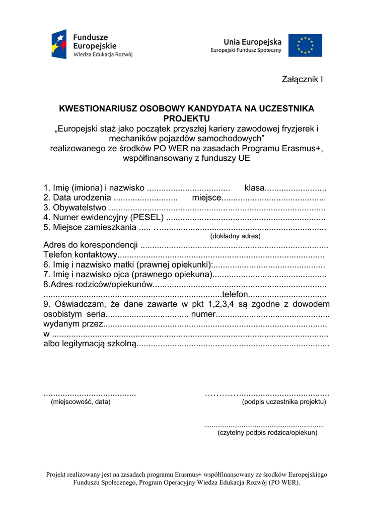Załącznik I KWESTIONARIUSZ OSOBOWY KANDYDATA NA UCZESTNIKA PROJEKTU „Europejski staż jako początek przyszłej kariery zawodowej fryzjerek i mechaników pojazdów samochodowych” realizowanego ze środków PO WER na zasadach Programu Erasmus+, współfinansowany z funduszy UE 1. Imię (imiona) i nazwisko ................................... klasa.......................... 2. Data urodzenia ........................... miejsce............................................ 3. Obywatelstwo ........................................................................................... 4. Numer ewidencyjny (PESEL) ................................................................... 5. Miejsce zamieszkania ..... …..................................................................... (dokładny adres) Adres do korespondencji ............................................................................... Telefon kontaktowy....................................................................................... 6. Imię i nazwisko matki (prawnej opiekunki):............................................... 7. Imię i nazwisko ojca (prawnego opiekuna)................................................ 8.Adres rodziców/opiekunów......................................................................... ...........................................................................telefon................................. 9. Oświadczam, że dane zawarte w pkt 1,2,3,4 są zgodne z dowodem osobistym seria................................... numer................................................ wydanym przez.............................................................................................. w .................................................................................................................... albo legitymacją szkolną................................................................................. ....................................... (miejscowość, data) …………...................................... (podpis uczestnika projektu) ................................................................ (czytelny podpis rodzica/opiekun) Projekt realizowany jest na zasadach programu Erasmus+ współfinansowany ze środków Europejskiego Funduszu Społecznego, Program Operacyjny Wiedza Edukacja Rozwój (PO WER). Załącznik II ZGODA – OŚWIADCZENIE RODZICÓW (OPIEKUNÓW) Ja niżej podpisana(y) wyrażam zgodę na uczestnictwo mojego syna/córki. …………………….......................................................................................... (Imię i nazwisko) Ucznia klasy:............................................................................................................ w projekcie: „Europejski staż jako początek przyszłej kariery zawodowej fryzjerek i mechaników pojazdów samochodowych” realizowanego ze środków PO WER na zasadach Programu Erasmus+, współfinansowany z funduszy UE, który będzie realizowany przez Fundację Możesz Więcej w Ponadgimnazjalnym Zespole Szkół Ekonomicznych w Sandomierzu w okresie od 31 grudnia 2014 do 30 grudnia 2016. Akceptuję zasady udziału w projekcie i oświadczam, że stan zdrowia mojego syna/córki pozwala na uczestnictwo we wszystkich zaplanowanych działaniach, najważniejsze z nich, to: 1) Przygotowanie pedagogiczno - kulturowo- językowego, 2) 3-tygodniowe praktyki zorganizowane w Wielkiej Brytanii. Biorę odpowiedzialność finansową za szkody spowodowane nieodpowiedzialnym zachowaniem mojego syna/córki podczas 3tygodniowego pobytu na terenie Wielkiej Brytanii. W przypadku nie przestrzegania regulaminu przez moje dziecko zobowiązuję się do osobistego odebrania go/jej z Wielkiej Brytanii oraz pokrycia wszystkich kosztów związanych z podróżą. Wyrażam zgodę na podejmowanie decyzji przez opiekunów wyjazdu związanych z leczeniem, hospitalizacją i zabiegami operacyjnymi, w przypadku zagrożenia zdrowia lub życia mojego syna/córki. ................................................... (miejscowość, data) ......................................................................... (czytelny podpis rodzica/opiekuna) Projekt realizowany jest na zasadach programu Erasmus+ współfinansowany ze środków Europejskiego Funduszu Społecznego, Program Operacyjny Wiedza Edukacja Rozwój (PO WER). Załącznik III OŚWIADCZENIE UCZNIA Ja niżej podpisana(y) ......................................................... (imię i nazwisko ucznia) ………………………. (klasa) deklaruję udział w projekcie „Europejski staż jako początek przyszłej kariery zawodowej fryzjerek i mechaników pojazdów samochodowych” realizowanym w Ponadgimnazjalnym Zespole Szkół Ekonomicznych im. E. Kwiatkowskiego w Sandomierzu. Nr projektu: 2014-1-PL01-KA102-0000762 Oświadczam, że zapoznałem się z założeniami projektu oraz regulaminem rekrutacji i uczestnictwa w projekcie: „Europejski staż jako początek przyszłej kariery zawodowej fryzjerek i mechaników pojazdów samochodowych” realizowanego ze środków PO WER na zasadach Programu Erasmus+, współfinansowany z funduszy UE i akceptuję warunki uczestnictwa. W szczególności zobowiązuje się do: 1) przestrzegania „Regulaminu rekrutacji i uczestnictwa w projekcie”, 2)obecności na zajęciach z przygotowania pedagogiczno – kulturowojęzykowego organizowanych poza obowiązkowymi lekcjami (oraz w czasie wolnym od nauki – wakacje, ferie), 3) udziału w zaplanowanych wyjazdach, 4) wypełniania poleceń opiekunów, nauczycieli, przestrzegania wszelkich przepisów dotyczących: bezpieczeństwa, przestrzegania bezwzględnego zakazu spożywania alkoholu, palenia tytoniu i zażywania środków odurzających. ……............................................. (miejscowość, data) ...................................................... (czytelny podpis ucznia) Projekt realizowany jest na zasadach programu Erasmus+ współfinansowany ze środków Europejskiego Fundus