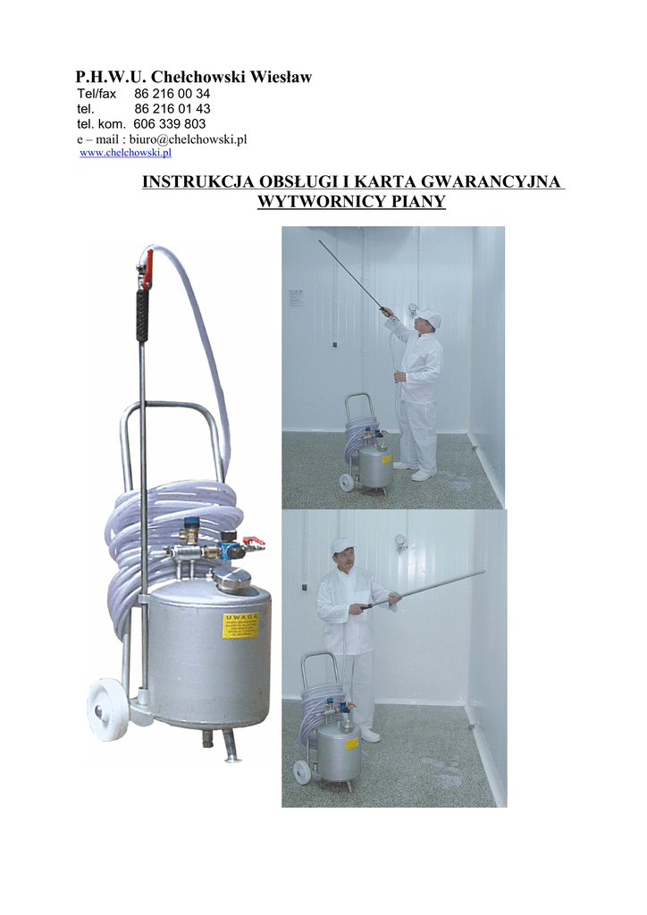 P.H.W.U. Chełchowski Wiesław Tel/fax 86 216 00 34 tel. 86 216 01 43 tel. kom. 606 339 803 e – mail : [email protected] www.chelchowski.pl INSTRUKCJA OBSŁUGI I KARTA GWARANCYJNA WYTWORNICY PIANY WYTWORNICA PIANY Urządzenie jest agregatem pianotwórczym o pojemności 20, 40, 80 litrów wykonanym ze stali nierdzewnej kwasoodpornej. Wytworzona w nim piana służy do mycia i dezynfekcji urządzeń przemysłu spożywczego i przetwórczego (komór chłodniczych, autoklawów itp.) utrzymania w czystości pomieszczeń produkcyjnych a mleczarniach, browarach, zakładach mięsnych, przetwórniach owoców i warzyw itp. 1. OGÓLNY OPIS URZĄDZENIA Wytwornica piany składa się ze zbiornika ciśnieniowego, wykonanego ze stali nierdzewnej kwasoodpornej umieszczonego na kółkach jezdnych z otworem zalewowym umieszczonym centralnie na górnej dennicy. Wyprowadzone są dwa króćce do których podłączona jest armatura doprowadzająca do zbiornika sprężone powietrze z zewnętrznego źródła (np. kompresora), oraz wyprowadzająca ze zbiornika czynnik myjący, który wraz ze sprężonym powietrzem tworzy pianę myjącą. Armatura składa się z: 1. Przyłącze węża ciśnieniowego lancy 2. Zawór odprężający zbiornik ciśnieniowy 3. Przyłącze sprężonego powietrza 4. Zawór regulacyjny dopływ roztworu do lancy natryskowej 5. Reduktor ciśnienia 6. Zawór odcinający zwrotny 7. Ciśnieniomierz 8. Zawór regulujący dopływ powietrza do roztworu 9. Zawór bezpieczeństwa do 0,6Mpa 2. NAPEŁNIENIE ZBIORNIKA Otworzyć zawór odpowietrzający i upewnić się czy w zbiorniku nie panuje ciśnienie wyższe od atmosferycznego. Przez otwór wlewowy napełnić zbiornik zimną wodą do wymaganej ilości. Wlać odliczoną według programu mycia ilości środka myjącego. Otwór wlewowy zakręcić kluczem. UWAGA!!! Przed przystąpieniem do napełniania zbiornika należy sprawdzić prawidłowość stanu technicznego zbiornika ciśnieniowego, instalacji wytwarzającej pianę, lancy natryskowej i węża ciśnieniowego. Elementy niesprawne należy wymienić na nowe. 3. WYTWARZANIE PIANY Zakręcić zawory: spustowy powietrza (2), dopływu powietrza do roztworu (8), dopływu roztworu do lancy (4), zawór odcinający na lancy (1). Przyłączyć szybkozłączkę węża zasilającego zbiornik powietrzem (3). Należy przedmuchać zawór bezpieczeństwa (9), zainstalowany na zbiorniku. Pokrętłem zaworu (5) wyregulować ciśnienie do 0,5 MPa wskazywane na manometrze (7). Odkręcić maksymalnie zawór (4) doprowadzający do lancy. Zdjąć lancę z wieszaka na zbiorniku, otworzyć całkowicie zawór odcinający na lancy zaworem (8) odkręcając go doprowadzić do wymaganej konsystencji piany. Po zakończeniu nakładania piany zamykamy zawór na lancy. Po upływie przewidzianego w programie mycia i dezynfekcji czasu kontaktu piany z elementami mytymi, pianę należy spłukać wodą pod ciśnieniem. 4. DOBÓR SPRĘŻARKI POWIETRZNEJ Do prawidłowego funkcjonowania wytwornicy piany, należy zastosować sprężarkę ze zbiornikiem o pojemności od 50L do 100L. Wydatek powietrza sprężarki powinien wynosić od 170 do 200L na minutę. 5. ZAKOŃCZENIE PRACY Po zakończeniu pracy wytwornicę piany należy rozprężyć w omawiany wyżej sposób, odkręcić zawór wlewowy i wypłukać wodą. Zbiornik pozostawić z otwartym wlewem. W przypadku gdy następują dłuższe przerwy w pracy wytwornicy bez jej opróżniania z roztworu, należy odprężyć zbiornik zaworem (2). Rozpoczynając ponownie pracę, zamykamy zawór odpowietrzenia (2) i otwieramy dopływ powietrza do zbiornika. Lancę kierujemy na powierzchnię przeznaczoną do mycia i otwieramy zawór do Lancy. KARTA GWARANCYJNA 1. Producent udziela gwarancji na wytwornicę piany z blachy nierdzewnej kwasoodpornej na okres 2 lat od daty zakupu. 2. Warunkiem uzyskania gwarancji jest zamontowanie zaworu redukcyjnego na zasilaniu zimnej wody, w przypadku braku tego zaworu wymiennik nie będzie przedmiotem gwarancji 3. W przypadku innych awarii należy powiadomić Producenta i przygotować zbiornik do odbioru. Wymiennik będzie odebrany na koszt Producenta naprawiony i odesłany w ciągu 10 dni roboczych od daty zgłoszenia awarii. Rodzaj wytwornicy .................................................... Data produkcji .............................................................. Data sprzedaży .............................................................. PRODUCENT P.H.W.U. Wiesław Chełchowski ul. Wiśniowa 1, Stare Kupiski 18-400 Łomża tel. 86-216-00-34 kom. 606 339 803 ............................................................................. ( Podpis i pieczęć sprzedawcy )