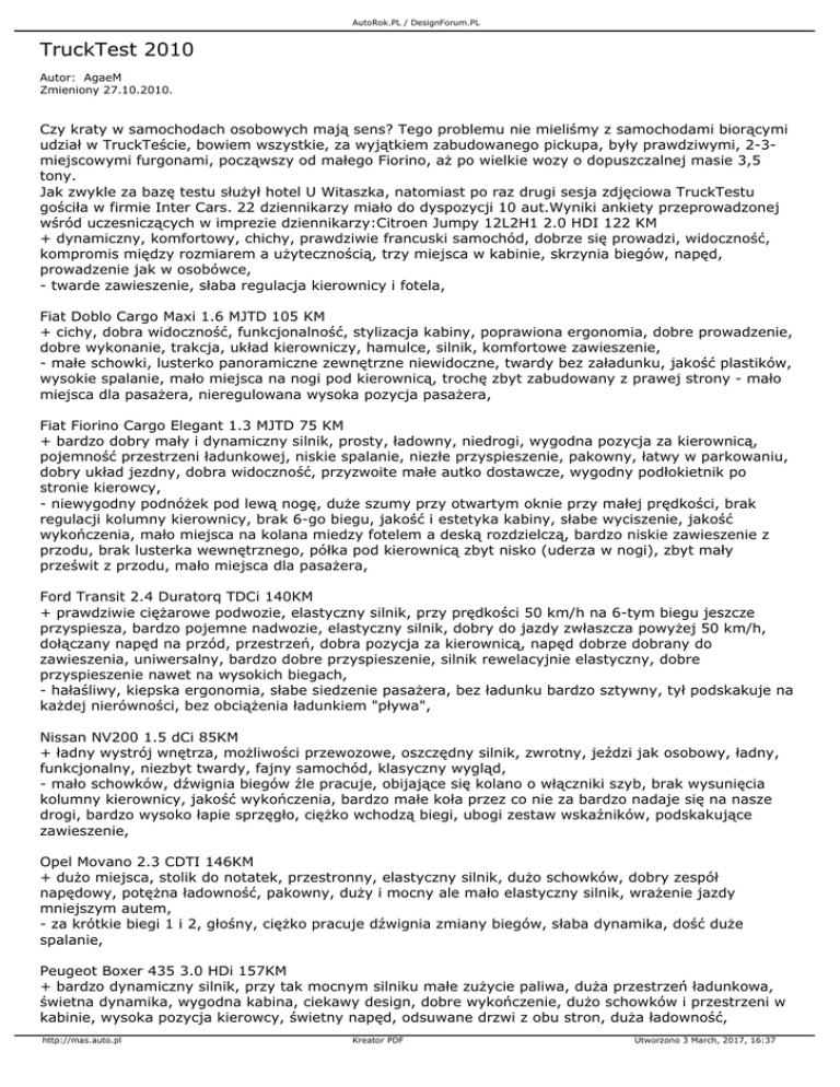 AutoRok.PL / DesignForum.PL TruckTest 2010 Autor: AgaeM Zmieniony 27.10.2010. Czy kraty w samochodach osobowych mają sens? Tego problemu nie mieliśmy z samochodami biorącymi udział w TruckTeście, bowiem wszystkie, za wyjątkiem zabudowanego pickupa, były prawdziwymi, 2-3miejscowymi furgonami, począwszy od małego Fiorino, aż po wielkie wozy o dopuszczalnej masie 3,5 tony. Jak zwykle za bazę testu służył hotel U Witaszka, natomiast po raz drugi sesja zdjęciowa TruckTestu gościła w firmie Inter Cars. 22 dziennikarzy miało do dyspozycji 10 aut.Wyniki ankiety przeprowadzonej wśród uczesniczących w imprezie dziennikarzy:Citroen Jumpy 12L2H1 2.0 HDI 122 KM + dynamiczny, komfortowy, chichy, prawdziwie francuski samochód, dobrze się prowadzi, widoczność, kompromis między rozmiarem a użytecznością, trzy miejsca w kabinie, skrzynia biegów, napęd, prowadzenie jak w osobówce, - twarde zawieszenie, słaba regulacja kierownicy i fotela, Fiat Doblo Cargo Maxi 1.6 MJTD 105 KM + cichy, dobra widoczność, funkcjonalność, stylizacja kabiny, poprawiona ergonomia, dobre prowadzenie, dobre wykonanie, trakcja, układ kierowniczy, hamulce, silnik, komfortowe zawieszenie, - małe schowki, lusterko panoramiczne zewnętrzne niewidoczne, twardy bez załadunku, jakość plastików, wysokie spalanie, mało miejsca na nogi pod kierownicą, trochę zbyt zabudowany z prawej strony - mało miejsca dla pasażera, nieregulowana wysoka pozycja pasażera, Fiat Fiorino Cargo Elegant 1.3 MJTD 75 KM + bardzo dobry mały i dynamiczny silnik, prosty, ładowny, niedrogi, wygodna pozycja za kierownicą, pojemność przestrzeni ładunkowej, niskie spalanie, niezłe przyspieszenie, pakowny, łatwy w parkowaniu, dobry układ jezdny, dobra widoczność, przyzwoite małe autko dostawcze, wygodny podłokietnik po stronie kierowcy, - niewygodny podnóżek pod lewą nogę, duże szumy przy otwartym oknie przy małej prędkości, brak regulacji kolumny kierownicy, brak 6-go biegu, jakość i estetyka kabiny, słabe wyciszenie, jakość wykończenia, mało miejsca na kolana miedzy fotelem a deską rozdzielczą, bardzo niskie zawieszenie z przodu, brak lusterka wewnętrznego, półka pod kierownicą zbyt nisko (uderza w nogi), zbyt mały prześwit z przodu, mało miejsca dla pasażera, Ford Transit 2.4 Duratorq TDCi 140KM + prawdziwie ciężarowe podwozie, elastyczny silnik, przy prędkości 50 km/h na 6-tym biegu jeszcze przyspiesza, bardzo pojemne nadwozie, elastyczny silnik, dobry do jazdy zwłaszcza powyżej 50 km/h, dołączany napęd na przód, przestrzeń, dobra pozycja za kierownicą, napęd dobrze dobrany do zawieszenia, uniwersalny, bardzo dobre przyspieszenie, silnik rewelacyjnie elastyczny, dobre przyspieszenie nawet na wysokich biegach, - hałaśliwy, kiepska ergonomia, słabe siedzenie pasażera, bez ładunku bardzo sztywny, tył podskakuje na każdej nierówności, bez obciążenia ładunkiem "pływa", Nissan NV200 1.5 dCi 85KM + ładny wystrój wnętrza, możliwości przewozowe, oszczędny silnik, zwrotny, jeździ jak osobowy, ładny, funkcjonalny, niezbyt twardy, fajny samochód, klasyczny wygląd, - mało schowków, dźwignia biegów źle pracuje, obijające się kolano o włączniki szyb, brak wysunięcia kolumny kierownicy, jakość wykończenia, bardzo małe koła przez co nie za bardzo nadaje się na nasze drogi, bardzo wysoko łapie sprzęgło, ciężko wchodzą biegi, ubogi zestaw wskaźników, podskakujące zawieszenie, Opel Movano 2.3 CDTI 146KM + dużo miejsca, stolik do notatek, przestronny, elastyczny silnik, dużo schowków, dobry zespół napędowy, potężna ładowność, pakowny, duży i mocny ale mało elastyczny silnik, wrażenie jazdy mniejszym autem, - za krótkie biegi 1 i 2, głośny, ciężko pracuje dźwignia zmiany biegów, słaba dynamika, dość duże spalanie, Peugeot Boxer 435 3.0 HDi 157KM + bardzo dynamiczny silnik, przy tak mocnym silniku małe zużycie paliwa, duża przestrzeń ładunkowa, świetna dynamika, wygodna kabina, ciekawy design, dobre wykończenie, dużo schowków i przestrzeni w kabinie, wysoka pozycja kierowcy, świetny napęd, odsuwane drzwi z obu stron, duża ładowność, http://mas.auto.pl Kreator PDF Utworzono 3 March, 2017, 16:37 AutoRok.PL / DesignForum.PL - brak regulacji wysokości kierownicy, słupek między szybami kierowcy zasłania lusterko zewnętrzne, regulacja el. lusterek wymusza oderwanie pleców od fotela, dla kierowcy o wzroście 180 cm zbyt krótkie siedzenie i niewygodny podnóżek nogi, nienajlepsza ergonomia, dwumiejscowy, skrzypi w kabinie, przedni napęd, Renault Master L4 2.3 dCi 150KM + wygodne fotele, elastyczny, prosty, dobry zespół napędowy, potężna ładowność, świetny pojazd z za drogim wyposażeniem, dużo praktycznych schowków i uchwytów, wrażenie jazdy mniejszym autem, - brak regulacji wysunięcia kierownicy, głośny od prędkości 110 km/h, hałaśliwy, skacze na wybojach, cena tej wersji, Toyota Hilux 3.0 D-4D 171KM + samochód użytkowy o modnym wyglądzie, komfortowy, dzielny w terenie, wystarczająco dynamiczny, wyposażenie, możliwość przewozu 5 osób, wielofunkcyjny, dobra jakość, komfort, wzorowa sprawność na wertepach, duża ilość miejsca w kabinie, zamykana skrzynia, - przestarzały design kabiny, twarde plastiki, mała skrzynia ładunkowa, dość duża masa nie resorowana, kłopoty ze zmianą biegów, znany od lat design, zawieszenie, mało schowków, Volkswagen Caddy 1.6 102KM + bardzo wysoka jakość wykończenia, stworzony do podróży turystycznych, ergonomia, jakość wykończenia i materiałów, łatwy w obsłudze, prowadzenie, przestrzeń, dobrze zrobiony i aż nudny w swojej perfekcji, wyświetlacz, wrażenie jazdy osobowym, łatwe prowadzenie, wyważone zawieszenie, - wysoka cena, dość twarde zawieszenie, smutne wnętrze, brak zamykanego schowka, głośny silnik, Zapraszamy do galerii zdjęć http://mas.auto.pl Kreator PDF Utworzono 3 March, 2017, 16:37