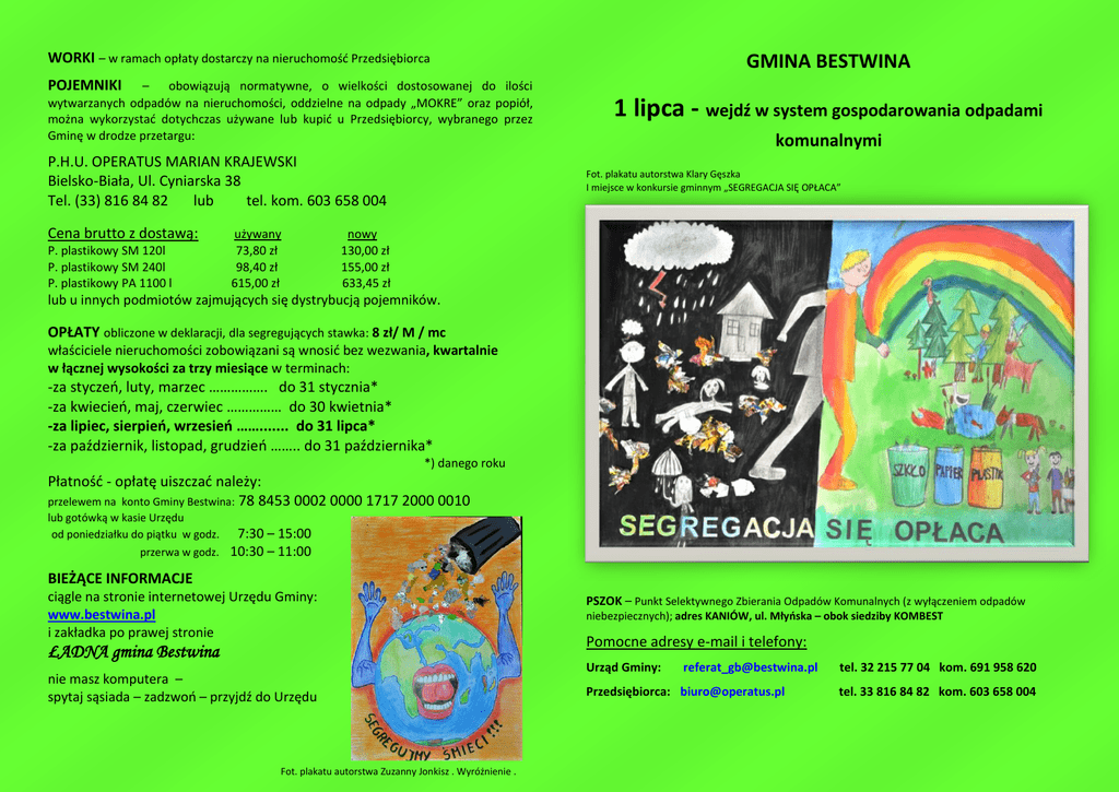 WORKI – w ramach opłaty dostarczy na nieruchomość Przedsiębiorca GMINA BESTWINA POJEMNIKI – obowiązują normatywne, o wielkości dostosowanej do ilości wytwarzanych odpadów na nieruchomości, oddzielne na odpady „MOKRE” oraz popiół, można wykorzystać dotychczas używane lub kupić u Przedsiębiorcy, wybranego przez Gminę w drodze przetargu: P.H.U. OPERATUS MARIAN KRAJEWSKI Bielsko-Biała, Ul. Cyniarska 38 Tel. (33) 816 84 82 lub tel. kom. 603 658 004 Cena brutto z dostawą: P. plastikowy SM 120l P. plastikowy SM 240l P. plastikowy PA 1100 l używany 73,80 zł 98,40 zł 615,00 zł 1 lipca - wejdź w system gospodarowania odpadami komunalnymi Fot. plakatu autorstwa Klary Gęszka I miejsce w konkursie gminnym „SEGREGACJA SIĘ OPŁACA” nowy 130,00 zł 155,00 zł 633,45 zł lub u innych podmiotów zajmujących się dystrybucją pojemników. OPŁATY obliczone w deklaracji, dla segregujących stawka: 8 zł/ M / mc właściciele nieruchomości zobowiązani są wnosić bez wezwania, kwartalnie w łącznej wysokości za trzy miesiące w terminach: -za styczeń, luty, marzec ……………. do 31 stycznia* -za kwiecień, maj, czerwiec …………… do 30 kwietnia* -za lipiec, sierpień, wrzesień ……....... do 31 lipca* -za październik, listopad, grudzień …….. do 31 października* *) danego roku Płatność - opłatę uiszczać należy: przelewem na konto Gminy Bestwina: 78 8453 0002 0000 1717 2000 0010 lub gotówką w kasie Urzędu od poniedziałku do piątku w godz. przerwa w godz. 7:30 – 15:00 10:30 – 11:00 BIEŻĄCE INFORMACJE ciągle na stronie internetowej Urzędu Gminy: www.bestwina.pl i zakładka po prawej stronie ŁADNA gmina Bestwina nie masz komputera – spytaj sąsiada – zadzwoń – przyjdź do Urzędu Fot. plakatu autorstwa Zuzanny Jonkisz . Wyróżnienie . PSZOK – Punkt Selektywnego Zbierania Odpadów Komunalnych (z wyłączeniem odpadów niebezpiecznych); adres KANIÓW, ul. Młyńska – obok siedziby KOMBEST Pomocne adresy e-mail i telefony: Urząd Gminy: [email protected] Przedsiębiorca: [email protected] tel. 32 215 77 04 kom. 691 958 620 tel. 33 816 84 82 kom. 603 658 004 Fot. plakatu autorstwa Wiktorii Lasek . Wyróżnienie. ODPADY SUCHE ODBIÓR TYLKO PEŁNYCH WORKÓW Firmy OPERATUS (wypełnianych wg poniższych zasad). MOŻESZ TAKŻE ODDAĆ DO PSZOK. WTEDY DOSTARCZ WE WŁASNYCH WORKACH. PAPIER 2. worek niebieski 1. ODPADY MOKRE Nie Nie Tak Tak - tłusty papier, - tapety, - ręczniki + papier szkolny i biurowy, + gazety, czasopisma, katalogi i prospekty, + książki, + papier pakowy, karton i tektura. papierowe, - chusteczki higieniczne worek zielony SZKŁO Nie Nie - porcelana, - ceramika, - lustra, - szyby, - szkło żaroodporne - strzykawki, - aerozole, - pojemniki po worek żółty SUCHE pozostałe Nie Nie środkach toksycznych, olejach silnikowych - puszki po farbach UWAGA: jw. gromadź oddzielnie, oddaj jako niebezpieczne UWAGA Usuń zszywki i metalowe części. Tak Tak + szklane opakowania po kosmetykach, + butelki i słoiki po napojach i żywności UWAGA Nie tłucz szkła, opróżnij z zawartości, odkręć nakrętkę i wrzuć ją do żółtego worka Tak Tak + plastikowe opakowania po napojach (np. PET), żywności, kosmetykach i chemii gospodarczej, + foliowe worki, torebki i reklamówki, + plastikowe naczynia jednorazowe, + opakowania wielomateriałowe (np. kartony po sokach, napojach i mleku), + opakowania metalowe (np. puszki po napojach, konserwach), + drobny złom, + sztuczne kwiaty, + odzież i obuwie, + styropian (nie budowlany), + porcelanę i fajans (stłuczone zabezpiecz np. folią), + stłuczone szklanki, kieliszki (zabezpiecz np. folią) UWAGA odkręć nakrętkę, opróżnij z zawartości, zgnieć 1. ODBIÓR Z POJEMNIKÓW WRZUCAJ: + odpadki kuchenne, + obierki z owoców, warzyw, + fusy z kawy i herbaty, + skorupki jajek, + rośliny i ziemia kwiatowa, + zużyte chusteczki higieniczne, + zużyte ręczniki papierowe, + odpady tytoniowe (np. niedopałki papierosów, popiół papierosowy), + pieluchy jednorazowe i inne środki higieny osobistej, + mokry papier i karton, + woreczki i torebki papierowe, + zużyte jednorazowe worki do odkurzaczy, + pozostałości po domowej „hodowli” zwierząt, trociny, + skoszona trawa, liście, pocięte gałęzie/ duże ilości – ODPADY ZIELONE dostarcz do PSZOK UWAGA: większość zagospodaruj w przydomowym kompostowniku Fot. plakatu autorstwa Pauliny Orzeł. Wyróżnienie . POPIÓŁ jeśli wytwarzany: 1. ODBIÓR Z POJEMNIKÓW od 1 października do 30 kwietnia 2. ODDAĆ DO PSZOK od 1 maja do 30 września UWAGA Popiół gromadzony oddzielnie Pojemniki i worki należy umieścić w miejscu dostępnym dla pracowników firmy wywozowej, w dniu odbioru, zgodnie z harmonogramem. NIE deklarujesz segregacji zbierasz razem SUCHE i MOKRE stawka 17zł/M/mc – nie gospodarujesz – płacisz drożej – możesz to zmienić.