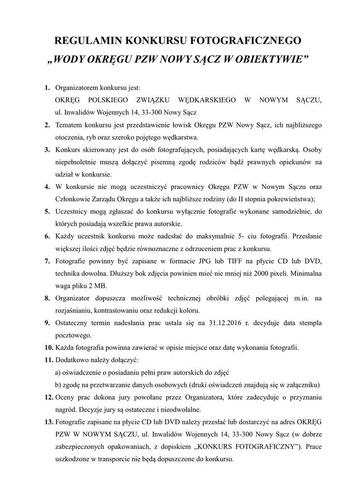 REGULAMIN KONKURSU FOTOGRAFICZNEGO „WODY OKRĘGU PZW NOWY SĄCZ W OBIEKTYWIE” 1. Organizatorem konkursu jest: OKRĘG POLSKIEGO ZWIĄZKU WĘDKARSKIEGO W NOWYM SĄCZU, ul. Inwalidów Wojennych 14, 33-300 Nowy Sącz 2. Tematem konkursu jest przedstawienie łowisk Okręgu PZW Nowy Sącz, ich najbliższego otoczenia, ryb oraz szeroko pojętego wędkarstwa. 3. Konkurs skierowany jest do osób fotografujących, posiadających kartę wędkarską. Osoby niepełnoletnie muszą dołączyć pisemną zgodę rodziców bądź prawnych opiekunów na udział w konkursie. 4. W konkursie nie mogą uczestniczyć pracownicy Okręgu PZW w Nowym Sączu oraz Członkowie Zarządu Okręgu a także ich najbliższe rodziny (do II stopnia pokrewieństwa); 5. Uczestnicy mogą zgłaszać do konkursu wyłącznie fotografie wykonane samodzielnie, do których posiadają wszelkie prawa autorskie. 6. Każdy uczestnik konkursu może nadesłać do maksymalnie 5- ciu fotografii. Przesłanie większej ilości zdjęć będzie równoznaczne z odrzuceniem prac z konkursu. 7. Fotografie powinny być zapisane w formacie JPG lub TIFF na płycie CD lub DVD, technika dowolna. Dłuższy bok zdjęcia powinien mieć nie mniej niż 2000 pixeli. Minimalna waga pliku 2 MB. 8. Organizator dopuszcza możliwość technicznej obróbki zdjęć polegającej m.in. na rozjaśnianiu, kontrastowaniu oraz redukcji koloru. 9. Ostateczny termin nadesłania prac ustala się na 31.12.2016 r. decyduje data stempla pocztowego. 10. Każda fotografia powinna zawierać w opisie miejsce oraz datę wykonania fotografii. 11. Dodatkowo należy dołączyć: a) oświadczenie o posiadaniu pełni praw autorskich do zdjęć b) zgodę na przetwarzanie danych osobowych (druki oświadczeń znajdują się w załączniku) 12. Oceny prac dokona jury powołane przez Organizatora, które zadecyduje o przyznaniu nagród. Decyzje jury są ostateczne i nieodwołalne. 13. Fotografie zapisane na płycie CD lub DVD należy przesłać lub dostarczyć na adres OKRĘG PZW W NOWYM SĄCZU, ul. Inwalidów Wojennych 14, 33-300 Nowy Sącz (w dobrze zabezpieczonych opakowaniach, z dopiskiem „KONKURS FOTOGRAFICZNY”). Prace uszkodzone w transporcie nie będą dopuszczone do konkursu. 14. Organizator dopuszcza możliwość przesyłania zdjęć wraz z wypełnionymi i podpisanymi oświadczeniami na adres mailowy: biuro@ pzwns.info.pl 15. Przewiduje się przyznanie następujących nagród: I nagroda– rocznalicencjanaOS Dunajecna2017 r. orazczterywyróżnienia- 1 dni owelicencjenaOS Dunajecw 2017 r. Od wydawcy magazynu „Sztuka Łowienia”: -trzyroczne, krajowe prenumeratyw/w magazynu na 2017r. -trzy szt. filmu wędkarskiego „Czech Nymph” na DVD w wersji anglojęzycznej 16. Organizator zastrzega sobie możliwość innego podziału nagród 17. Ogłoszenie wyników nastąpi nie później niż 31.01.2017r. 18. Wyniki konkursu ogłoszone zostaną także na stronie internetowej http://www.pzwns.info.pl/ oraz na oficjalnym profilu na Facebooku, tam również zostaną opublikowane nagrodzone prace. 19. W szyscynagrodzeni zostaną powiadomieni o werdykcie jury. 20. Nagrody będzie można odebrać osobiście w terminie 30 dni od daty ogłoszenia wyników w siedzibie Okręgu PZW w Nowym Sączu, ul. Inwalidów Wojennych 14, 33-300 Nowy Sącz od pon. do piątku w godz. 7:30- 15:00 21. Uczestnik konkursu przenosi bezpłatnie na Organizatora autorskie prawa majątkowe do nadesłanych zdjęć, z chwilą ich nadesłania. 22. Przeniesienie praw autorskich, o których mowa w pkt 19, następuje w zakresie wszystkich pól eksploatacji, a w szczególności: 1) zwielokrotnienie i utrwalenie każdą techniką; w szczególności kopiowanie, fotokopiowanie, utrwalanie na płytach CD/DVD, dyskachkomputerowych; 2)publikowanie w Internecie, w tym na witrynachinternetowychoraz na Facebook; 3) wykorzystanie w materiałach promocyjnych, marketingowych, ulotkach, folderach; 4) wprowadzanie do obrotu, w tym w szczególności poprzez sieć Internet. 23. Organizator zastrzega sobie prawo do odwołania konkursu bez podania przyczyny. 24. Udział w konkursie jest równoznaczny z wyrażeniem zgody przez osoby w nim uczestniczące na przetwarzanie przez organizatora ich danych osobowych na potrzeby konkursu oraz w celach marketingowych Organizatora („Ustawa o ochronie danych osobowych” z dnia 29.08.1997r. Dz.U. Nr 133 poz. 833 z póź. zm.). 25. Udział w konkursie jest jednoznaczny z akceptacją wszystkich punktów regulaminu. 26. Ostateczna interpretacja regulaminu należy do Organizatora. ZARZĄD OKRĘGU PZW W NOW YM SĄCZU Załącznik nr 1 …............................................................ imię i nazwisko osoby składającej oświadczenie …......................................................................... ….......................................................................... adres oraz tel. kontaktowy Prawaautorski e OŚW IADCZENIE Niniejszym oświadczam, że zdjęcia przesłane przeze mnie na konkurs fotograficzny „WODY OKRĘGU PZW NOWY SĄCZ W OBIEKTYWIE” , organizowanym przez OKRĘG POLSKIEGO ZWIĄZKU WĘDKARSKIEGO W NOWYM SĄCZU, są mojego wyłącznego autorstwa, co oznacza, że posiadam prawa autorskie do ich eksploatacji na wszystkich polach. Oświadczam, że przenoszę bezpłatnie na Organizatora konkursu autorskie prawa majątkowe do nadesłanych zdjęć, z chwilą ich nadesłania. Przeniesienie następuje w zakresie wszystkich pól eksploatacji, a w szczególności: 1) zwielokrotnienie i utrwalenie każdą techniką; w szczególności kopiowanie, fotokopiowanie, utrwalanie na płytach CD/DVD, dyskach komputerowych; 2)publikowanie w Internecie, w tym na witrynachinternetowychoraz na Facebook; 3) wykorzystanie w materiałach promocyjnych, marketingowych, ulotkach, folderach; 4) wprowadzanie do obrotu, w tym w szczególności poprzez sieć Internet. …..........…........................................................ (podpis osoby składającej oświadczenie) …......