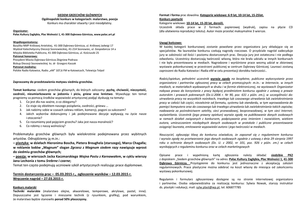 SIEDEM GRZECHÓW GŁÓWNYCH Ogólnopolski konkurs w kategoriach: malarstwo, poezja Konkurs ma charakter otwarty i jest nieodpłatny. Organizator: Pałac Kultury Zagłębia, Plac Wolności 1, 41-300 Dąbrowa Górnicza, www.palac.art.pl Współorganizatorzy: Bazylika NMP Królowej Anielskiej, 41-300 Dąbrowa Górnicza, ul. Królowej Jadwigi 17 Wydział Katechetyczny Diecezji Sosnowieckiej, 41-214 Sosnowiec, ul. Gospodarcza 14 a Miejska Biblioteka Publiczna, 41-300 Dąbrowa Górnicza, ul. Kościuszki 25 Patronat honorowy: Prezydent Miasta Dąbrowa Górnicza Zbigniew Podraza Biskup Diecezji Sosnowieckiej ks. dr Grzegorz Kaszak Patronat medialny: Polskie Radio Katowice, Radio „eM” 107,6 FM w Katowicach, Telewizja Telpol Zapraszamy do przedstawienia motywu siedmiu grzechów. Temat konkursu: siedem grzechów głównych, do których zaliczamy: pychę, chciwość, nieczystość, zazdrość, nieumiarkowanie w jedzeniu i piciu, gniew oraz lenistwo. Wywołując ten temat pragniemy za pomocą środków wypowiedzi artystycznej podjąć dyskusję na tematy: 1. Co jest dla nas ważne, o co zbiegamy? 2. Co staje się obiektem naszego pożądania, zazdrości, gniewu … 3. Jak radzimy sobie w czasach zalewu reklam, komercji, pogoni za sukcesem? 4. Jakich wyborów dokonujemy i jak podejmowane decyzje wpływają na życie nasze i otoczenie? 5. Co rozumiemy pod pojęciem grzechu? Jaka jest nasza moralność? 6. Co robimy z naszą wolnością? Problematyka grzechów głównych była wielokrotnie podejmowana przez wybitnych artystów. Odnajdziemy ją m.in.: – plastyka: w dziełach Hieronima Boscha, Pietera Breughela (starszego), Marca Chagalla; w reklamie lodów „Magnum” slogan Zgrzesz z Magnum siedem razy nawiązuje wprost do siedmiu grzechów głównych; – poezja: w wierszach Jacka Kaczmarskiego Wojna Postu z Karnawałem, w cyklu wierszy Jana Lechonia z tomu Srebrne i czarne; Temat ten często podejmują uczniowie szkół artystycznych realizując prace dyplomowe. Termin dostarczenia prac – 05.03.2015 r., ogłoszenie wyników – 12.03.2015 r. Wręczenie nagród – 27.03.2015 r. Konkurs malarski Techniki malarskie (malarstwo olejne, akwarelowe, temperowe, akrylowe, pastel, inne). Dopuszczalne jest łączenie i mieszanie technik (z rysunkiem, grafiką), pod warunkiem, że malarstwo będzie stanowiło ponad 50% płaszczyzny. Format i forma prac dowolna. Kategorie wiekowe: 6-9 lat, 10-14 lat, 15-25lat. Konkurs poetycki Kategorie wiekowe: 10-14 lat, 15-20 lat, dorośli. Uczestnik składa prace w 2 formach: papierowej (wydruk), zapisu (dla ułatwienia reprodukcji tekstu). Autor może przesłać maksymalnie 3 wiersze. na płycie CD Uwagi końcowe: W każdej kategorii konkursowej zostanie powołane przez organizatora jury składające się ze specjalistów. Na laureatów konkursu czekają nagrody rzeczowe. O przydziale nagród zadecyduje jury w zależności od ilości i poziomu dostarczonych prac. Decyzja jury jest ostateczna i nie podlega odwołaniu. Uczestnicy dostarczają twórczość własną, która nie brała udziału w innych konkursach i nie była prezentowana w mediach. Nagrodzone i wyróżnione prace wezmą udział w zbiorowej wystawie pokonkursowej w przestrzeni publicznej w centrum Dąbrowy Górniczej. Laureaci zostaną zaproszeni do Radia Katowice i Radia eM w celu prezentacji dorobku twórczości.. Rodzic/opiekun, pełnoletni uczestnik wyraża zgodę na bezpłatne, publiczne wykorzystanie przez organizatora i partnerów zgłoszonej pracy w celach promocyjnych: m.in.: w Internecie, w innych mediach, w materiałach wydawanych w druku i w formie elektronicznej, na wystawach Organizator nabywa prawo do korzystania z pracy będącej przedmiotem konkursu zgodnie z ustawą o prawie autorskim i prawach pokrewnych (Dz.U.2006 r. Nr 90, poz. 631 z późn. zm.), w szczególności do: utrwalania pracy na wszystkich nośnikach, trwałego lub czasowego utrwalania lub zwielokrotniania pracy w całości lub części, niezależnie od formatu, systemu lub standardu, w tym wprowadzenia do pamięci komputera oraz do czasowego lub trwałego utrwalania lub zwielokrotniania takich zapisów; nadawania za pośrednictwem satelity, sieci przewodowej, bezprzewodowej, w tym sieci Internet; wyświetlania. Uczestnik (jego prawny opiekun) wyraża zgodę na publikowanie danych osobowych w ramach działań związanych z konkursem, podpisywanie prac imieniem i nazwiskiem, wiekiem autora, umieszczaniem niezbędnych danych osobowych w protokole i publiczne prezentowanie osiągnięć laureata, emitowanie wypowiedzi autora i jego twórczości w mediach. Nauczyciel, zgłaszając klasę do konkursu oświadcza, że zapoznał się z regulaminem konkursu i wyraża zgodę na przetwarzanie jego danych osobowych zgodnie z ustawą z dnia 29 sierpnia 1997 roku o ochronie danych osobowych (Dz. U. z 2002, nr 101, poz. 926 z późn. zm.) w celach wynikających z regulaminu konkursu oraz w celach marketingowych Opisane prace i wypełnioną kartę zgłoszenia należy składać siedzibie PKZ z dopiskiem „Siedem grzechów głównych” na adres: Pałac Kultury Zagłębia, Plac Wolności 1, 41-300 Dąbrowa Górnicza. Przystąpienie do konkursu jest jednoznaczne z akceptacją założeń regulaminowych. Prace plastyczne można odebrać na koszt własny do miesiąca od zakończeniu wystawy pokonkursowej. Regulamin i formularz zgłoszeniowy dostępne są na stronie internetowej organizatora i partnerów. Osoba odpowiedzialna za realizację konkursu: Sylwia Nowak, starszy instruktor ds. plastyki i edukacji, mail: [email protected], tel. 606877785