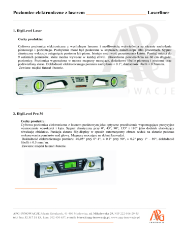 Poziomice elektroniczne z laserem ____________________________ Laserliner ______________________________________________________________ 1. DigiLevel Laser Cechy produktu: Cyfrowa poziomica elektroniczna z wychylnym laserem i możliwością wyświetlenia na ekranie nachylenia pionowego i poziomego. Pochylenie może być podawane w stopniach, calach/stopę albo procentach. Sygnał akustyczny wskazuje osiągnięcie poziomu lub pionu. Istnieje możliwość przenoszenia kątów. Pamięć mieści do 9 ostatnich pomiarów, które można wywołać w każdej chwili. Utwardzona powierzchnia na 60 cm długości poziomicy. Poziomica wyposażona w mocne magnesy mocujące, dodatkowe libelle pionową i poziomą oraz podświetlany ekran. Dokładność elektronicznego pomiaru nachylenia ± 0.1°, dokładność libelli ± 0.5mm/m. Zawiera: miękki futerał i baterie. _________________________ 2. DigiLevel Pro 30 Cechy produktu: Cyfrowa poziomica elektroniczna z laserem punktowym jako optyczne przedłużenie wspomagające precyzyjne wyznaczanie wysokości i kąta. Sygnał akustyczny przy 0°, 45°, 90°, 135° i 180° jako dodatek ułatwiający niwelację obiektów. Funkcja ekranu flip-display w sposób automatyczny obraca widok na ekranie podczas wykonywania pomiarów nad głową. Magnesy mocujące na dolnej krawędzi. Dokładność elektronicznego pomiaru: ±0,05° przy 0°-1°, ± 0.1° przy 90°, ± 0.2° przy 1° – 89°, dokładność libelli ± 0.5 mm / m. Zawiera: miękki futerał i baterie. _________________________ ___________________________________________________________________________________ APG-INNOWACJE Jolanta Góralczyk, 41-400 Mysłowice, ul. Mikołowska 29, NIP 222-016-29-35 tel./ fax: 32 317 31 13, kom. 502 430 657, e-mail: [email protected], www.apg-innowacje.pl ___________________ Poziomice elektroniczne z laserem ____________________________ Laserliner ______________________________________________________________ 3. DigiLevel Pro 60 Cechy produktu: Cyfrowa poziomica elektroniczna z laserem punktowym jako optyczne przedłużenie wspomagające precyzyjne wyznaczanie wysokości i kąta. Sygnał akustyczny przy 0°, 45°, 90°, 135° i 180° jako dodatek ułatwiający niwelację obiektów. Funkcja ekranu flip-display w sposób automatyczny obraca widok na ekranie podczas wykonywania pomiarów nad głową. Magnesy mocujące na dolnej krawędzi. Dokładność elektronicznego pomiaru: ±0,05° przy 0°-1°, ± 0.1° przy 90°, ± 0.2° przy 1° – 89°, dokładność libelli ± 0.5 mm / m. Zawiera: miękki futerał i baterie. _________________________ 3. DigiLevel Pro 120 Cechy produktu: Cyfrowa poziomica elektroniczna z laserem punktowym jako optyczne przedłużenie wspomagające precyzyjne wyznaczanie wysokości i kąta. Sygnał akustyczny przy 0°, 45°, 90°, 135° i 180° jako dodatek ułatwiający niwelację obiektów. Funkcja ekranu flip-display w sposób automatyczny obraca widok na ekranie podczas wykonywania pomiarów nad głową. Magnesy mocujące na dolnej krawędzi. Dokładność elektronicznego pomiaru: ±0,05° przy 0°-1°, ± 0.1° przy 90°, ± 0.2° przy 1° – 89°, dokładność libelli ± 0.5 mm / m. Zawiera: miękki futerał i baterie. _________________________ ___________________________________________________________________________________ APG-INNOWACJE Jolanta Góralczyk, 41-400 Mysłowice, ul. Mikołowska 29, NIP 222-016-29-35 tel./ fax: 32 317 31 13, kom. 502 430 657, e-mail: [email protected], www.apg-innowacje.pl ___________________