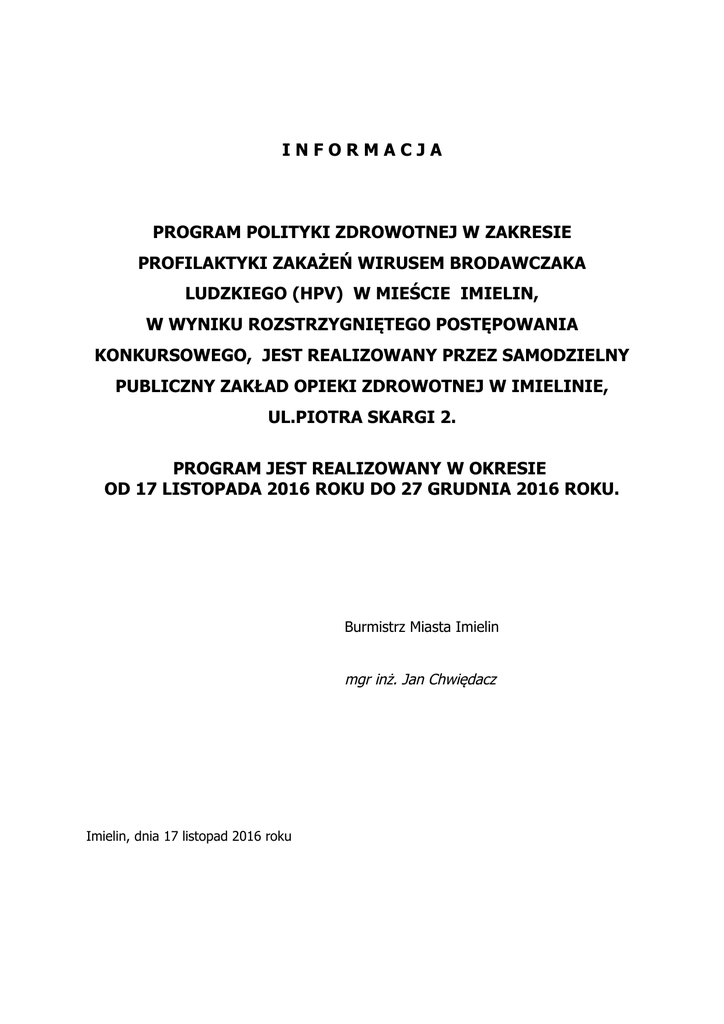 INFORMACJA PROGRAM POLITYKI ZDROWOTNEJ W ZAKRESIE PROFILAKTYKI ZAKAŻEŃ WIRUSEM BRODAWCZAKA LUDZKIEGO (HPV) W MIEŚCIE IMIELIN, W WYNIKU ROZSTRZYGNIĘTEGO POSTĘPOWANIA KONKURSOWEGO, JEST REALIZOWANY PRZEZ SAMODZIELNY PUBLICZNY ZAKŁAD OPIEKI ZDROWOTNEJ W IMIELINIE, UL.PIOTRA SKARGI 2. PROGRAM JEST REALIZOWANY W OKRESIE OD 17 LISTOPADA 2016 ROKU DO 27 GRUDNIA 2016 ROKU. Burmistrz Miasta Imielin mgr inż. Jan Chwiędacz Imielin, dnia 17 listopad 2016 roku