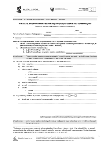 Wyjaśnienie: Po wydrukowaniu formularz należy wypełnić i podpisać. Wniosek o przeprowadzenie badań diagnostycznych ucznia oraz wydanie opinii (wypełnia rodzic/opiekun ucznia lub uczeń pełnoletni) ……………………………………………………………, dnia …………………………………… miejscowość data Poradnia Psychologiczno-Pedagogiczna ……………………………………………………………………………………………………………… nazwa poradni w ………………………………………………………………………………………………………………………………………………………………………… miejscowość Wnoszę o przeprowadzenie badań diagnostycznych oraz wydanie opinii w sprawie: 1. udziału ucznia w systemie wspierania uczniów szczególnie uzdolnionych w zakresie matematyki, fizyki i informatyki w ramach projektu Zdolni z Pomorza, * 2. udzielenia zezwolenia na realizację : a. indywidualnego toku nauki b. indywidualnego programu nauki z przedmiotu: ……………………………………………………………… matematyka, fizyka lub informatyka * Wyjaśnienie: W przypadku uzyskania pozytywnej opinii poradni można wystąpić z wnioskiem do dyrektora 1 szkoły o zezwolenie na indywidualny program lub tok nauki . 1) Wnoszę o przeprowadzenie badań specjalistycznych i wydanie opinii dla: a) imię i nazwisko: ………………………………………………………………………………………………………………………………. b) data urodzenia: ………………………………………………… miejsce urodzenia: …………………………………………….. c) miejsce zamieszkania: d) − ulica: ……………………………………………………………………………………………………………………………………. − numer domu i mieszkania: …………………………………………………………………………………………………… − miejscowość: ……………………………………………………………………………………………………………………….. − kod pocztowy: ……………………………………………………………………………………………………………………… telefon kontaktowy: …………………………………………………………………………………………………………………………. e) e-mail: ……………………………………………………………………………………………………………………………………………… f) szkoła: − nazwa: ………………………………………………………………………………………………………………………………… − klasa: …………………………………………………………………………………………………………………………………… 2) Czy uczeń był badany w poradni psychologiczno-pedagogicznej? Tak: a) Nie: Jeżeli tak, to proszę podać nazwę poradni i numer opinii: ………………………………………………………………… ………………………………………………………………………………………………………………………………………………………………… …………………………………………………… czytelny podpis rodzica/rodziców/opiekuna prawnego/ucznia pełnoletniego Wyjaśnienie: Jeżeli osoba badana jest niepełnoletnia, na badanie musi zgłosić się wraz z rodzicem lub opiekunem prawnym. 1 Podstawa prawna: Rozporządzenie Ministra Edukacji Narodowej i Sportu z dnia 19 grudnia 2001 r. w sprawie warunków i trybu udzielania zezwoleń na indywidualny program lub tok nauki oraz organizacji indywidualnego programu lub toku nauki (Dz. U. z dnia 15 stycznia 2002 r., nr 3, poz. 28). Innowacyjny projekt systemowy Pomorskie – dobry kurs na edukację. Wspieranie uczniów o szczególnych predyspozycjach w zakresie matematyki, fizyki i informatyki jest współfinansowany ze środków Europejskiego Funduszu Społecznego i budżetu państwa w ramach Priorytetu IX Programu Operacyjnego Kapitał Ludzki 2007 - 2013. 1 Arkusz nominacji ucznia szczególnie uzdolnionego do udziału w projekcie Zdolni z Pomorza Wyjaśnienie: Po wydrukowaniu formularz należy wypełnić i podpisać. 1. Imię i nazwisko ucznia: ………………………………………………………………………………………………………………………………… 2. Osoba nominująca: a. nauczyciel ………………………………………………………………………………………………………………………… przedmiot b. pedagog c. rodzic ucznia d. uczeń osobiście e. inna osoba ………………………………………………………………………………………………………………………… proszę wskazać funkcję 3. Uczeń przejawia zdolności w zakresie: a. matematyki b. fizyki c. informatyki Nie: 4. Uczeń czyta nadprogramowo literaturę z dziedziny, w której jest uzdolniony. Tak: 5. Oceny szkolne z przedmiotów: matematyka, fizyka, informatyka z ostatniego półrocza: 6. a. matematyka b. fizyka c. informatyka Największe sukcesy ucznia w konkursach i olimpiadach w ciągu ostatnich 3 lat, otrzymane nagrody, stypendia: ………………………………………………………………………………………………………………………………………………………… ……………………………………………………………………………………………………………………………………………………………………… ……………………………………………………………………………………………