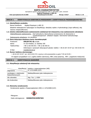 KARTA CHARAKTERYSTYKI Sporządzona zgodnie z Rozporządzeniem (WE) nr 1907/2006 z późn. zmianami Hydrol Premium L-HM 15 Data sporządzenia:29.10.2008 SEKCJA 1. Aktualizacja:01.06.2015 Wersja: 4.0CLP Strona 1 z 10 IDENTYFIKACJA SUBSTANCJI/MIESZANINY I IDENTYFIKACJA PRZEDSIĘBIORSTWA 1.1. Identyfikator produktu Nazwa handlowa: Hydrol Premium L-HM 15 Składniki niebezpieczne wpływające na klasyfikację: destylaty ciężkie z hydrokrakingu (ropa naftowa); olej bazowy niespecyfikowany 1.2. Istotne zidentyfikowane zastosowania substancji lub mieszaniny oraz zastosowania odradzane Zidentyfikowane zastosowania: olej hydrauliczny (bezcynkowy) przeznaczony do stosowania w wysokoobciążonych układach napędu i sterowania hydraulicznego. Zastosowania odradzane: nie określono 1.3. Dane dotyczące dostawcy karty charakterystyki Producent: ORLEN OIL Sp. z o.o. Adres: 31-323 Kraków, ul. Opolska 100 Telefon/Faks: +48 12 66 555 00 / +48 12 66 555 01 Informacje w sprawach dotyczących jakości: telefon + 48 24 201 03 67 lub +48 43 84 415 E-Mail: [email protected] 1.4. Numer telefonu alarmowego: + 48 24 201 03 67 lub +48 43 84 415 ( czynny w dni powszednie w godz 7.00 do15.00 ) W nagłych przypadkach 112 ( ogólny telefon alarmowy), 998 ( straż pożarna), 999 ( pogotowie medyczne) SEKCJA 2. IDENTYFIKACJA ZAGROŻEŃ 2.1. Klasyfikacja substancji lub mieszaniny Klasyfikacja zgodna z rozporządzeniem (WE) nr 1272/2008 (CLP): Zagrożenia wynikające z właściwości fizykochemicznych: Nieklasyfikowana jako niebezpieczna dla człowieka: Asp. Tox. 1, H304 dla środowiska: Nieklasyfikowana jako niebezpieczna 2.2. Elementy oznakowania Oznakowanie zgodne z Rozporządzeniem (WE) nr 1272/2008 (CLP): Piktogram: Hasło ostrzegawcze: NIEBEZPIECZEŃSTWO KARTA CHARAKTERYSTYKI Sporządzona zgodnie z Rozporządzeniem (WE) nr 1907/2006 z późn. zmianami Hydrol Premium L-HM 15 Data sporządzenia:29.10.2008 Aktualizacja:01.06.2015 Wersja: 4.0CLP Strona 2 z 10 Zwroty wskazujące rodzaj zagrożenia: H304 Połknięcie i dostanie się przez drogi oddechowe może grozić śmiercią Zwroty wskazujące środki ostrożności: P301+P310 W PRZYPADKU POŁKNIĘCIA: Natychmiast skontaktować się z OŚRODKIEM ZATRUĆ lub z lekarzem. P331 NIE wywoływać wymiotów. P405 Przechowywać pod zamknięciem. P501 Zawartość/pojemnik usuwać do upoważnionego odbiorcy odpadów. Informacje uzupełniające: Zawiera:fosforan trikrezylu. Może powodować wystąpienie reakcji alergicznej. 2.3. Inne zagrożenia Brak informacji na temat spełnienia kryteriów PBT lub vPvB zgodnie z załącznikiem XIII Rozporządzenia REACH. Brak danych o przeprowadzonych badaniach. SEKCJA 3. SKŁAD/INFORMACJA O SKŁADNIKACH 3.1. Substancje – nie dotyczy 3.2. Mieszaniny: mieszanina olejów bazowych i dodatków uszlachetniających Niebezpieczne składniki, zakresy ich stężeń w mieszaninie: Nazwa substancji Nr rejestracji REACH *Destylaty ciężkie z hydrokrakingu (ropa naftowa)- olej bazowy niespecyfikowany Nr CAS / Nr WE Nr indeksowy % wag. Klasyfikacja wg 1272/2008 (CLP) 64741-76-0/ 265-077-7 649-453-00-1 10<c ≤ 40 Asp. Tox 1 ; H304 1330-78-5/ 215-548-8 015-548-00-3 c<0,15 Acute Tox.4;H312 Acute Tox.4;H302 Repr.2;H361f Skin Sens 1B;H317 STOT SE 1;H370 Aquatic Acute 1;H400 Aquatic Chronic 1,H410 (M=1) 01-2119486951-26-XXXX Fosforan trikrezylu *Na podstawie noty L oleje bazowe niespecyfikowane zawarte w mieszaninie nie są klasyfikowane jako rakotwórcze (zawartość ekstraktu DMSO (wg IP 346) < 3%). Opis zwrotów R i H podano w Sekcji 16. SEKCJA 4. ŚRODKI PIERWSZEJ POMOCY 4.1. Opis środków pierwszej pomocy Wdychanie: Poszkodowanego usunąć (wyprowadzić/wynieść) z miejsca narażenia na świeże powietrze; zapewnić spokój i ciepło. Nieprzytomnego ułożyć w pozycji bocznej ustalonej, rozluźnić uciskające części ubrania; kontrolować KARTA CHARAKTERYSTYKI Sporządzona zgodnie z Rozporządzeniem (WE) nr 1907/2006 z późn. zmianami Hydrol Premium L-HM 15 Data sporządzenia:29.10.2008 Aktualizacja:01.06.2015 Wersja: 4.0CLP Strona 3 z 10 i utrzymywać drożność dróg oddechowych. W przypadku zaburzeń w oddychaniu podawać tlen, w przypadku braku oddechu stosować sztuczne oddychanie. W przypadku utraty przytomności, zaburzeń oddychania lub utrzymującego się złego samopoczucia natychmiast zapewnić pomoc lekarską. Kontakt ze skórą: Natychmiast zdjąć zanieczyszczoną/nasiąkniętą odzież i buty. Zanieczyszczoną skórę umyć dokładnie wodą z mydłem lub łagodnym detergentem, a następnie spłukać wodą. W przypadku wystąpienia i utrzymywania się objawów podrażnienia skonsultować się z lekarzem. UWAGA: Zanieczyszczoną/nasiąkniętą odzież usunąć w bezpieczne miejsce z dala od źródeł ciepła i źródeł zapłonu. Kontakt z oczami: Zanieczyszczone oczy natychmiast płukać ciągłym strumieniem wody, usunąć szkła kontaktowe (jeśli są) i kontynuować płukanie przez ok. 15 minut. Podczas płukania trzymać powieki szeroko rozwarte i poruszać gałką oczną. W przypadku wystąpienia i utrzymywania się dolegliwości skonsultować się z lekarzem. UWAGA: Nie stosować zbyt silnego strumienia wody, aby nie uszkodzić rogówki. Połknięcie: Natychmiast zapewnić pomoc medyczną. NIE prowokować wymiotów – zwiększone ryzyko zachłyśnięcia. W przypadku wystąpienia samoistnych wymiotów trzymać poszkodowanego w pozycji nachylonej do przodu z twarzą skierowaną do ziemi. Nigdy nie podawać niczego do ust osobie nieprzytomnej. Skontaktować się z lekarzem. 4.2. Najważniejsze ostre i opóźnione objawy oraz skutki narażenia Nie określono. 4.3. Wskazania dotyczące wszelkiej natychmiastowej pomocy lekarskiej i szczególnego postępowania z poszkodowanym Nie prowokować wymiotów i nie podawać niczego doustnie osobie nieprzytomnej. Pokazać kartę charakterystyki lub etykietę/opakowanie personelowi medycznemu udzielającemu pomocy. Osoby udzielające pomocy w obszarze o nieznanym stężeniu par/mgły powinny b