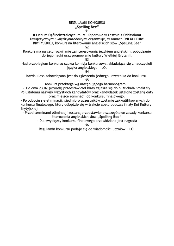 REGULAMIN KONKURSU „Spelling Bee” §1 II Liceum Ogólnokształcące im. M. Kopernika w Lesznie z Oddziałami Dwujęzycznymi i Międzynarodowymi organizuje, w ramach DNI KULTURY BRYTYJSKIEJ, konkurs na literowanie angielskich słów „Spelling Bee” §2 Konkurs ma na celu rozwijanie zainteresowania językiem angielskim, pobudzanie do jego nauki oraz promowanie kultury Wielkiej Brytanii. §3 Nad przebiegiem konkursu czuwa komisja konkursowa, składająca się z nauczycieli języka angielskiego II LO. §4 Każda klasa zobowiązana jest do zgłoszenia jednego uczestnika do konkursu. §5 Konkurs przebiega wg następującego harmonogramu: - Do dnia 23.02 (wtorek) przedstawiciel klasy zgłasza się do p. Michała Smektały. Po ustaleniu nazwisk wszystkich kandydatów oraz kandydatek ustalone zostaną daty oraz miejsce eliminacji do konkursu finałowego. - Po odbyciu się eliminacji, siedmioro uczestników zostanie zakwalifikowanych do konkursu finałowego, który odbędzie się w trakcie apelu podczas finały Dni Kultury Brytyjskiej - Przed terminami eliminacji zostaną przedstawione szczegółowe zasady konkursu literowania angielskich słów „Spelling Bee” - Dla zwycięzcy konkursu finałowego przewidziana jest nagroda §6 Regulamin konkursu podaje się do wiadomości uczniów II LO.