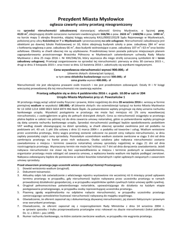 Prezydent Miasta Mysłowice ogłasza czwarty ustny przetarg nieograniczony na sprzedaż nieruchomości zabudowanej stanowiącej własność Gminy Mysłowice, o łącznej pow. 2 2 2 4123 m , obejmującej działki oznaczone numerami ewidencyjnymi 566/96 o pow. 2633 m i 1469/96 o pow. 1490 m , na karcie mapy 5 obrębu Brzezinka, objętej księgą wieczystą KA1L/00021352/8 Sądu Rejonowego w Mysłowicach, położonej przy ulicy Kościelnej nr 7 w Mysłowicach i przeznaczonej na cele usługowe. Nieruchomość zabudowana jest 2 obiektami po dawnej Szkole Podstawowej nr 10, które obejmują budynek szkoły o pow. zabudowy 284 m wraz 2 2 2 z kotłownią węglową o pow. zabudowy 66 m , dwa budynki wolnostojące o pow. zabudowy 107 m i 63 m oraz boisko asfaltowe. Obiekty w chwili obecnej nie są użytkowane. Przedmiotowy teren posiada pokrycie miejscowym planem zagospodarowania przestrzennego Brzezinka Północna w Mysłowicach zatwierdzonym uchwałą Rady Miasta Mysłowice z dnia 25 maja 2016 r. Nr XXII/346/16, który wyznacza dla niego strefę oznaczoną symbolem U – teren zabudowy usługowej. Przetargi zorganizowane na sprzedaż tej nieruchomości: pierwszy w dniu 30 czerwca 2015 r., drugi w dniu 3 listopada 2015 r. oraz trzeci w dniu 12 kwietnia 2016 r. zakończyły się wynikami negatywnymi. Cena wywoławcza nieruchomości wynosi 900.000,- zł (słownie złotych: dziewięćset tysięcy), w tym cena składnika budowlanego wynosi 500.000,- zł cena gruntu wynosi 400.000,- zł Nieruchomość nie jest obciążona prawami osób trzecich i nie jest przedmiotem zobowiązań. Działy III i IV księgi wieczystej prowadzonej dla tej nieruchomości nie zawierają wpisów. Przetarg odbędzie się w dniu 4 października 2016 r. o godz. 10.00 w sali nr 204 Urzędu Miasta Mysłowice przy ul. Powstańców 1 W przetargu mogą wziąć udział osoby fizyczne i prawne, które najpóźniej do dnia 28 września 2016 r. wniosą w formie pieniężnej wadium w wysokości 180.000,- zł (słownie złotych: sto osiemdziesiąt tysięcy) na konto Miasta Mysłowice Nr 13 1050 1214 1000 0023 5654 6974 ING Bank Śląski. Za potwierdzenie wpłaty przyjmuje się datę uznania rachunku bankowego urzędu. Wysokość postąpienia w przetargu nie może być mniejsza niż 1% ceny wywoławczej nieruchomości, z zaokrągleniem w górę do pełnych dziesiątek złotych. Cena za nieruchomość osiągnięta w przetargu płatna będzie w całości nie później niż do dnia zawarcia umowy notarialnej, gdzie za potwierdzenie wpłaty przyjmuje się datę uznania rachunku bankowego urzędu. Sprzedaż nieruchomości podlegać będzie opodatkowaniu podatkiem VAT według stawki obowiązującej na dzień sprzedaży, w chwili obecnej sprzedaż zwolniona jest od podatku na podstawie art. 43 ust. 1 pkt 10a ustawy z dnia 11 marca 2004 r. o podatku od towarów i usług. Wadium wniesione przez uczestnika przetargu, który wygra przetarg zostanie zaliczone na poczet ceny nabycia nieruchomości, w dniu zapłaty pozostałej części ceny sprzedaży. Pozostałym uczestnikom wadium zostanie zwrócone w ciągu 3 dni od dnia zamknięcia przetargu na konto przez nich wskazane. Osoba ustalona jako nabywca nieruchomości zostanie zawiadomiona o miejscu i terminie zawarcia notarialnej umowy sprzedaży najpóźniej w ciągu 21 dni od dnia rozstrzygnięcia przetargu. Wyznaczony termin nie może być krótszy niż 7 dni od dnia doręczenia zawiadomienia. Jeżeli nabywca nieruchomości nie stawi się bez usprawiedliwienia w miejscu i terminie podanych w zawiadomieniu, organizator przetargu może odstąpić od zawarcia umowy, a wpłacona kwota wadium nie będzie podlegać zwrotowi. Nabywca zobowiązany będzie do poniesienia w całości kosztów notarialnych i opłat sądowych związanych z zawarciem umowy sprzedaży. Przed otwarciem przetargu jego uczestnik winien przedłożyć Komisji Przetargowej: 1. Dowód wniesienia wadium (oryginał). 2. Dokument tożsamości. 3. Aktualny odpis lub zaświadczenie z właściwego rejestru wystawione nie wcześniej niż 6 miesięcy przed upływem terminu przetargu w przypadku, gdy nieruchomość będzie nabywana przez uczestnika przetargu w ramach prowadzonej działalności gospodarczej, a w przypadku wspólników spółek cywilnych także umowę spółki cywilnej. 4. Oryginał pełnomocnictwa potwierdzonego notarialnie, upoważniającego do działania na każdym etapie postępowania przetargowego, w przypadku osoby reprezentującej uczestnika przetargu. 5. Pisemną zgodę współmałżonka na odpłatne nabycie nieruchomości, w przypadku uczestnika przetargu zamierzającego samodzielnie licytować nieruchomość nabywaną do majątku wspólnego. 6. Oświadczenie, że oferent zapoznał się z dokumentacją zbywanej nieruchomości, jej stanem faktycznym i prawnym oraz warunkami przetargu. 7. Oświadczenie, że oferent zapoznał się z rozporządzeniem Rady Ministrów z dnia 14 września 2004 r. w sprawie sposobu i trybu przeprowadzania przetargów oraz rokowań na zbycie nieruchomości (tekst jednolity Dz. U. z 2014 r. poz.1490). 8. Numer rachunku bankowego, na które zostanie zwrócone wadium, w przypadku nie wygrania przetargu. Cudzoziemcy mogą nabywać nieruchomości zgodnie z obowiązującymi przepisami ustawy o nabywaniu nieruchomości przez cudzoziemców. Informacje dotyczące zbywanej nieruchomości oraz warunki realizacji zamierzeń inwestycyjnych: • Nieruchomość położona jest w dzielnicy Brzezinka, posiada nieregularny kształt zbliżony do dwóch prostokątów. Teren jest ogrodzony, utwardzony i porośnięty pojedynczymi drzewami ozdobnymi oraz uporządkowaną zielenią. W sąsiedztwie znajduje się zabudowa mieszkaniowa jednorodzinna i wielorodzinna oraz tereny kościelne. Na przedmiotowym gruncie usytuowany jest: 2 2 murowany budynek dawnej szkoły o pow. zabudowy 284 m , pow. użytkowej 1555 m , wolnostojący, trzykondygnacyjny, nie podpiwniczony, o 50% stopniu zużycia technicznego, pobudowany w latach 30-