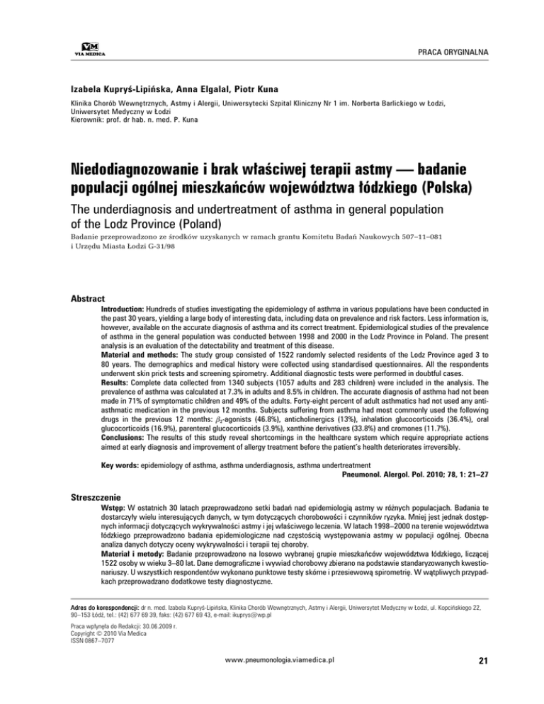 PRACA ORYGINALNA Izabela Kupryś-Lipińska, Anna Elgalal, Piotr Kuna Klinika Chorób Wewnętrznych, Astmy i Alergii, Uniwersytecki Szpital Kliniczny Nr 1 im. Norberta Barlickiego w Łodzi, Uniwersytet Medyczny w Łodzi Kierownik: prof. dr hab. n. med. P. Kuna Niedodiagnozowanie i brak właściwej terapii astmy — badanie populacji ogólnej mieszkańców województwa łódzkiego (Polska) The underdiagnosis and undertreatment of asthma in general population of the Lodz Province (Poland) Badanie przeprowadzono ze środków uzyskanych w ramach grantu Komitetu Badań Naukowych 507–11–081 i Urzędu Miasta Łodzi G-31/98 Abstract Introduction: Hundreds of studies investigating the epidemiology of asthma in various populations have been conducted in the past 30 years, yielding a large body of interesting data, including data on prevalence and risk factors. Less information is, however, available on the accurate diagnosis of asthma and its correct treatment. Epidemiological studies of the prevalence of asthma in the general population was conducted between 1998 and 2000 in the Lodz Province in Poland. The present analysis is an evaluation of the detectability and treatment of this disease. Material and methods: The study group consisted of 1522 randomly selected residents of the Lodz Province aged 3 to 80 years. The demographics and medical history were collected using standardised questionnaires. All the respondents underwent skin prick tests and screening spirometry. Additional diagnostic tests were performed in doubtful cases. Results: Complete data collected from 1340 subjects (1057 adults and 283 children) were included in the analysis. The prevalence of asthma was calculated at 7.3% in adults and 8.5% in children. The accurate diagnosis of asthma had not been made in 71% of symptomatic children and 49% of the adults. Forty-eight percent of adult asthmatics had not used any antiasthmatic medication in the previous 12 months. Subjects suffering from asthma had most commonly used the following drugs in the previous 12 months: b2-agonists (46.8%), anticholinergics (13%), inhalation glucocorticoids (36.4%), oral glucocorticoids (16.9%), parenteral glucocorticoids (3.9%), xanthine derivatives (33.8%) and cromones (11.7%). Conclusions: The results of this study reveal shortcomings in the healthcare system which require appropriate actions aimed at early diagnosis and improvement of allergy treatment before the patient’s health deteriorates irreversibly. Key words: epidemiology of asthma, asthma underdiagnosis, asthma undertreatment Pneumonol. Alergol. Pol. 2010; 78, 1: 21–27 Streszczenie Wstęp: W ostatnich 30 latach przeprowadzono setki badań nad epidemiologią astmy w różnych populacjach. Badania te dostarczyły wielu interesujących danych, w tym dotyczących chorobowości i czynników ryzyka. Mniej jest jednak dostępnych informacji dotyczących wykrywalności astmy i jej właściwego leczenia. W latach 1998–2000 na terenie województwa łódzkiego przeprowadzono badania epidemiologiczne nad częstością występowania astmy w populacji ogólnej. Obecna analiza danych dotyczy oceny wykrywalności i terapii tej choroby. Materiał i metody: Badanie przeprowadzono na losowo wybranej grupie mieszkańców województwa łódzkiego, liczącej 1522 osoby w wieku 3–80 lat. Dane demograficzne i wywiad chorobowy zbierano na podstawie standaryzowanych kwestionariuszy. U wszystkich respondentów wykonano punktowe testy skórne i przesiewową spirometrię. W wątpliwych przypadkach przeprowadzano dodatkowe testy diagnostyczne. Adres do korespondencji: dr n. med. Izabela Kupryś-Lipińska, Klinika Chorób Wewnętrznych, Astmy i Alergii, Uniwersytet Medyczny w Łodzi, ul. Kopcińskiego 22, 90–153 Łódź, tel.: (42) 677 69 39, faks: (42) 677 69 43, e-mail: [email protected] Praca wpłynęła do Redakcji: 30.06.2009 r. Copyright © 2010 Via Medica ISSN 0867–7077 www.pneumonologia.viamedica.pl 21 Pneumonologia i Alergologia Polska 2010, tom 78, nr 1, strony 21–27 Wyniki: Kompletne dane zebrane od 1340 osób (1057 dorosłych i 283 dzieci) zostały włączone do dalszej analizy. Częstość występowania astmy oskrzelowej u osób dorosłych oszacowano na 7,3%, a u dzieci — na 8,5%. Właściwa diagnoza astmy nie była wcześniej postawiona u 71% dzieci i u 49% badanych dorosłych z objawami tej choroby. Czterdzieści osiem procent osób dorosłych chorujących na astmę w ostatnich 12 miesiącach nie stosowało żadnych leków przeciwastmatycznych. Osoby chorujące na astmę w ciągu ostatnich 12 miesięcy najczęściej stosowały leki z grupy b2-agonistów — 46,8%, 13% — leki cholinolityczne, 36,4% — wziewne glikokortykosteroidy, 16,9% — doustne glikokortykosteroidy, 3,9% — parenteralne glikokortykosteroidy, 33,8% — ksantyny i 11,7% — kromony. Wnioski: Wyniki tego badania ujawniają braki w systemie opieki zdrowotnej. Taka sytuacja wymaga wprowadzania stosownych zmian. Powinny być one nakierowane na wczesną diagnostykę i poprawę leczenia alergii, zanim jeszcze dojdzie do nieodwracalnego pogorszenia stanu zdrowia. Słowa kluczowe: epidemiologia astmy, niedodiagnozowanie astmy, niewłaściwe leczenie astmy Pneumonol. Alergol. Pol. 2010; 78, 1: 21–27 Wstęp W ostatnich 30 latach obserwowany jest gwałtowny wzrost zapadalności na astmę oskrzelową [1, 2]. Liczne badania prowadzone w różnych populacjach dostarczają interesujących danych dotyczących epidemiologii tej choroby, w tym określają wskaźniki chorobowości [3] i identyfikują czynniki ryzyka [4]. Mniej jest dostępnych danych na temat wykrywalności astmy i adekwatności terapii. Powszechnie uważa się, że wczesne rozpoznanie, edukacja chorych i optymalne leczenie są głównymi metodami walki z tą chorobą [5]. W kilku opublikowanych ostatnio badaniach wykazano, że mniej niż połowa osób chorujących na astmę ma właściwie postawioną diagnozę [6–8], podobnie mniej niż 50% otrzymuje leki przeci