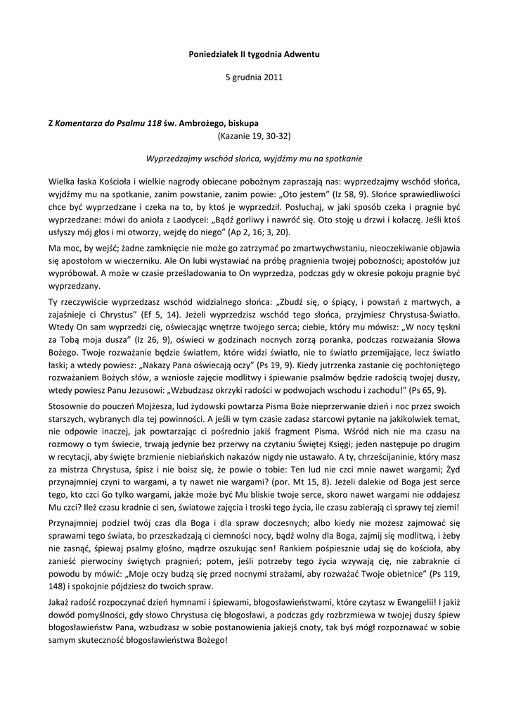 Poniedziałek II tygodnia Adwentu 5 grudnia 2011 Z Komentarza do Psalmu 118 św. Ambrożego, biskupa (Kazanie 19, 30-32) Wyprzedzajmy wschód słońca, wyjdźmy mu na spotkanie Wielka łaska Kościoła i wielkie nagrody obiecane pobożnym zapraszają nas: wyprzedzajmy wschód słońca, wyjdźmy mu na spotkanie, zanim powstanie, zanim powie: „Oto jestem” (Iz 58, 9). Słońce sprawiedliwości chce być wyprzedzane i czeka na to, by ktoś je wyprzedził. Posłuchaj, w jaki sposób czeka i pragnie być wyprzedzane: mówi do anioła z Laodycei: „Bądź gorliwy i nawróć się. Oto stoję u drzwi i kołaczę. Jeśli ktoś usłyszy mój głos i mi otworzy, wejdę do niego” (Ap 2, 16; 3, 20). Ma moc, by wejść; żadne zamknięcie nie może go zatrzymać po zmartwychwstaniu, nieoczekiwanie objawia się apostołom w wieczerniku. Ale On lubi wystawiać na próbę pragnienia twojej pobożności; apostołów już wypróbował. A może w czasie prześladowania to On wyprzedza, podczas gdy w okresie pokoju pragnie być wyprzedzany. Ty rzeczywiście wyprzedzasz wschód widzialnego słońca: „Zbudź się, o śpiący, i powstań z martwych, a zajaśnieje ci Chrystus” (Ef 5, 14). Jeżeli wyprzedzisz wschód tego słońca, przyjmiesz Chrystusa-Światło. Wtedy On sam wyprzedzi cię, oświecając wnętrze twojego serca; ciebie, który mu mówisz: „W nocy tęskni za Tobą moja dusza” (Iz 26, 9), oświeci w godzinach nocnych zorzą poranka, podczas rozważania Słowa Bożego. Twoje rozważanie będzie światłem, które widzi światło, nie to światło przemijające, lecz światło łaski; a wtedy powiesz: „Nakazy Pana oświecają oczy” (Ps 19, 9). Kiedy jutrzenka zastanie cię pochłoniętego rozważaniem Bożych słów, a wzniosłe zajęcie modlitwy i śpiewanie psalmów będzie radością twojej duszy, wtedy powiesz Panu Jezusowi: „Wzbudzasz okrzyki radości w podwojach wschodu i zachodu!” (Ps 65, 9). Stosownie do pouczeń Mojżesza, lud żydowski powtarza Pisma Boże nieprzerwanie dzień i noc przez swoich starszych, wybranych dla tej powinności. A jeśli w tym czasie zadasz starcowi pytanie na jakikolwiek temat, nie odpowie inaczej, jak powtarzając ci pośrednio jakiś fragment Pisma. Wśród nich nie ma czasu na rozmowy o tym świecie, trwają jedynie bez przerwy na czytaniu Świętej Księgi; jeden następuje po drugim w recytacji, aby święte brzmienie niebiańskich nakazów nigdy nie ustawało. A ty, chrześcijaninie, który masz za mistrza Chrystusa, śpisz i nie boisz się, że powie o tobie: Ten lud nie czci mnie nawet wargami; Żyd przynajmniej czyni to wargami, a ty nawet nie wargami? (por. Mt 15, 8). Jeżeli dalekie od Boga jest serce tego, kto czci Go tylko wargami, jakże może być Mu bliskie twoje serce, skoro nawet wargami nie oddajesz Mu czci? Ileż czasu kradnie ci sen, światowe zajęcia i troski tego życia, ile czasu zabierają ci sprawy tej ziemi! Przynajmniej podziel twój czas dla Boga i dla spraw doczesnych; albo kiedy nie możesz zajmować się sprawami tego świata, bo przeszkadzają ci ciemności nocy, bądź wolny dla Boga, zajmij się modlitwą, i żeby nie zasnąć, śpiewaj psalmy głośno, mądrze oszukując sen! Rankiem pośpiesznie udaj się do kościoła, aby zanieść pierwociny świętych pragnień; potem, jeśli potrzeby tego życia wzywają cię, nie zabraknie ci powodu by mówić: „Moje oczy budzą się przed nocnymi strażami, aby rozważać Twoje obietnice” (Ps 119, 148) i spokojnie pójdziesz do twoich spraw. Jakaż radość rozpoczynać dzień hymnami i śpiewami, błogosławieństwami, które czytasz w Ewangelii! I jakiż dowód pomyślności, gdy słowo Chrystusa cię błogosławi, a podczas gdy rozbrzmiewa w twojej duszy śpiew błogosławieństw Pana, wzbudzasz w sobie postanowienia jakiejś cnoty, tak byś mógł rozpoznawać w sobie samym skuteczność błogosławieństwa Bożego!