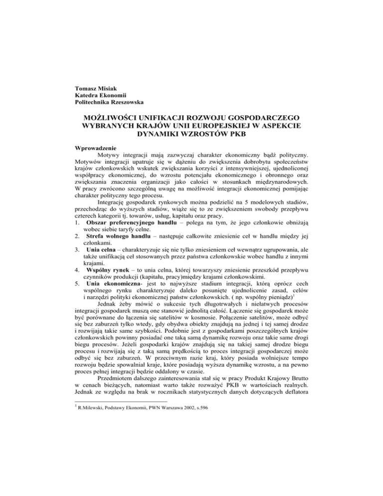 Tomasz Misiak Katedra Ekonomii Politechnika Rzeszowska MOŻLIWOŚCI UNIFIKACJI ROZWOJU GOSPODARCZEGO WYBRANYCH KRAJÓW UNII EUROPEJSKIEJ W ASPEKCIE DYNAMIKI WZROSTÓW PKB Wprowadzenie Motywy integracji mają zazwyczaj charakter ekonomiczny bądź polityczny. Motywów integracji upatruje się w dążeniu do zwiększenia dobrobytu społeczeństw krajów członkowskich wskutek zwiększania korzyści z intensywniejszej, ujednoliconej współpracy ekonomicznej, do wzrostu potencjału ekonomicznego i obronnego oraz zwiększania znaczenia organizacji jako całości w stosunkach międzynarodowych. W pracy zwrócono szczególną uwagę na możliwość integracji ekonomicznej pomijając charakter polityczny tego procesu. Integrację gospodarek rynkowych można podzielić na 5 modelowych stadiów, przechodząc do wyższych stadiów, wiąże się to ze zwiększeniem swobody przepływu czterech kategorii tj. towarów, usług, kapitału oraz pracy. 1. Obszar preferencyjnego handlu – polega na tym, że jego członkowie obniżają wobec siebie taryfy celne. 2. Strefa wolnego handlu – następuje całkowite zniesienie ceł w handlu między jej członkami. 3. Unia celna – charakteryzuje się nie tylko zniesieniem ceł wewnątrz ugrupowania, ale także unifikacją ceł stosowanych przez państwa członkowskie wobec handlu z innymi krajami. 4. Wspólny rynek – to unia celna, której towarzyszy zniesienie przeszkód przepływu czynników produkcji (kapitału, pracy)między krajami członkowskimi. 5. Unia ekonomiczna- jest to najwyższe stadium integracji, którą oprócz cech wspólnego rynku charakteryzuje daleko posunięte ujednolicenie zasad, celów i narzędzi polityki ekonomicznej państw członkowskich. ( np. wspólny pieniądz)1 Jednak żeby mówić o sukcesie tych długotrwałych i niełatwych procesów integracji gospodarek muszą one stanowić jednolitą całość. Łączenie się gospodarek może być porównane do łączenia się satelitów w kosmosie. Połączenie satelitów, może odbyć się bez zaburzeń tylko wtedy, gdy obydwa obiekty znajdują na jednej i tej samej drodze i rozwijają takie same szybkości. Podobnie jest z gospodarkami poszczególnych krajów członkowskich powinny posiadać one taką samą dynamikę rozwoju oraz takie same drogi biegu procesów. Jeżeli gospodarki krajów znajdują się na takiej samej drodze biegu procesu i rozwijają się z taką samą prędkością to proces integracji gospodarczej może odbyć się bez zaburzeń. W przeciwnym razie kraj, który posiada wolniejsze tempo rozwoju będzie spowalniał kraje, które posiadają wyższa dynamikę wzrostu, a na pewno proces pełnej integracji będzie oddalony w czasie. Przedmiotem dalszego zainteresowania stał się w pracy Produkt Krajowy Brutto w cenach bieżących, natomiast warto także rozważyć PKB w wartościach realnych. Jednak ze względu na brak w rocznikach statystycznych danych dotyczących deflatora 1 R.Milewski, Podstawy Ekonomii, PWN Warszawa 2002, s.596 PKB, który jest potrzebny do obliczenia PKB w wartościach realnych, w pracy analizowano Produkt Krajowy Brutto w wartościach nominalnych. Produkt Krajowy Brutto stanowi barometr makroekonomiczny gospodarki danego kraju. Jest miernikiem aktywności gospodarczej, który odnosi się do produkcji w określonym czasie, najczęściej w ciągu roku lub kwartału. PKB jest, więc strumieniem nowych produktów mierzonych w dolarach, a po uwzględnieniu inflacji otrzymujemy realny PKB, będący miernikiem fizycznej produkcji. PKB jest określony dla konkretnych obszarów geograficznych, zwykle krajów, ale może być także określany dla regionu, miasta czy grupy krajów jak Unia Europejska. Dane empiryczne Dane empiryczne uznane za wiarygodne uzyskano z roczników statystycznych Głównego Urzędu Statystycznego z lat1995 –2002. Wartości Produktu Krajowego Brutto analizowanych krajów wyrażono w dolarach amerykańskich. Ułatwia to ich analizę a także porównywanie w czasie i przestrzeni2. Wiele danych empirycznych ma charakter skokowy. W takim przypadku nie byłaby możliwa ocena przyjętej w tej pracy definicji dynamiki. W związku z tym szeregi skokowe miar Jt transformowano do szeregów St uznanych za ciągłe, następująco: n St= ∑J t =1 t (1) Wprowadzona do opracowań wielkość Pk wskazuje, jaki procent stanowi wartość końcowa szeregu Sk w stosunku do wartości początkowej Sp: Pk= 100S k [%] Sp (2) Sk – oznacza ostatnią wartość szeregu St w analizowanych przypadkach jest to wartość S6 analizowanych procesów. Badano też szeregi Pt wyznaczono z wzoru: Pt= S t ⋅ 100 [%] S0 (3) Metody analizy danych empirycznych: Szeregi Jt procesów, zebrane z roczników statystycznych GUS nie mogą stanowić podstawy do oceny dynamiki procesów, gdyż są uznawane za skokowe, zwłaszcza w świetle definicji dynamiki. Dla lepszego wyjaśnienia danego zjawiska przyjęto dwie definicje dynamiki: -dynamikę absolutną rozumianą jako szybkość chwilowa i przyśpieszenie chwilowe osiągane na ściśle określonej drodze zmian wartości miary, względnie też na ściśle określonej drodze biegu procesu. 2 Roczniki Statystyczne GUS, Warszawa 1996-2002 r. -dynamika względna procesów ekonomicznych nazywana dynamiką właściwą i rozumianą jako szybkość chwilowa właściwa i przyspieszenie chwilowe właściwe osiągane na ściśle określonej drodze zmian wartości miary.3 W pracy rozpatrzono proste modele dynamiki ruchu. W tym też celu warto przytoczyć także definicję modelu ekonomicznego. -model ekonomiczny – jest to pewne celowe uproszczenie rzeczywistości ekonomicznej (zdarzeń ekonomicznych, procesów ekonomicznych) w celu lepszego poznania oraz analizowania badanego zjawiska ekonomicznego. W obliczeniach skoncentrowano się na krzywych dw gdyż poniższe procesy opisane są tego typu krzywymi. Krzywe aw cechują się narastaniem szybkości w czasie, a dw jej spadkiem. Procesy układają się w kolejności malejącej dyna