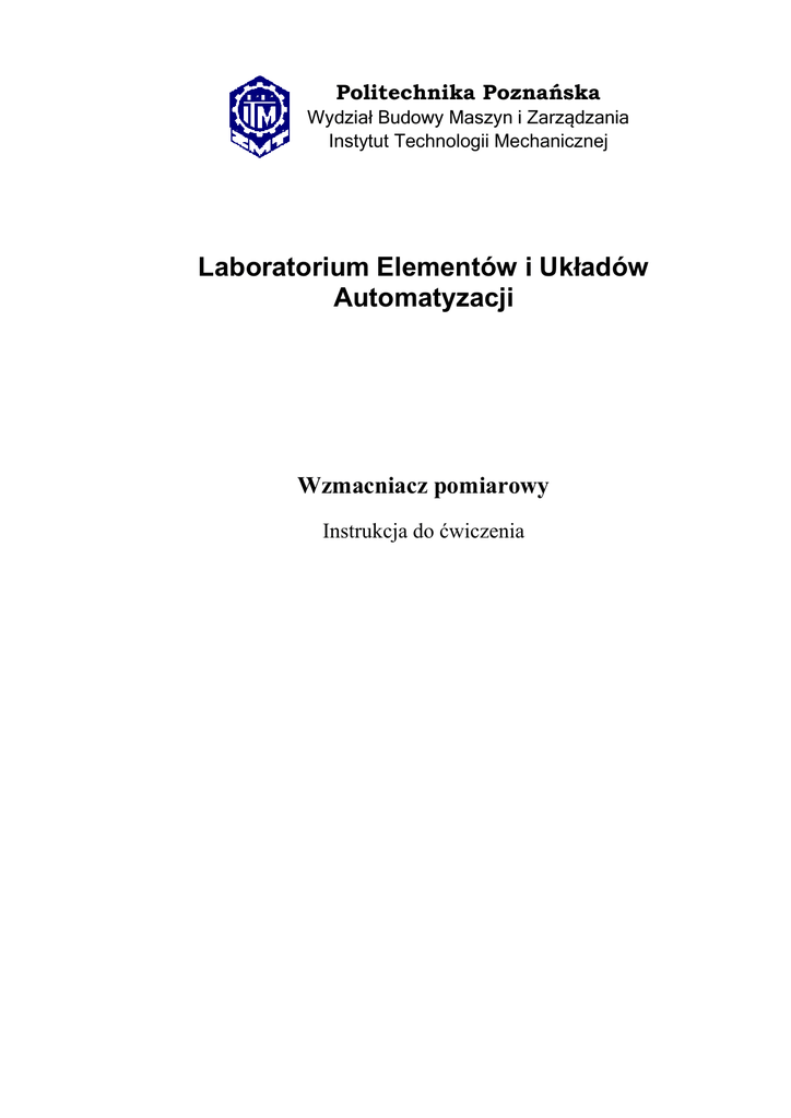 Politechnika Poznańska Wydział Budowy Maszyn i Zarządzania Instytut Technologii Mechanicznej Laboratorium Elementów i Układów Automatyzacji Wzmacniacz pomiarowy Instrukcja do ćwiczenia OGÓLNE ZASADY BEZPIECZEŃSTWA PODCZAS WYKONYWANIA ĆWICZEŃ LABORATORYJNYCH ! Przed przystąpieniem do ćwiczenia należy zapoznać się z instrukcją dydaktyczną. ! Dokonać oględzin urządzeń, przyrządów i przewodów używanych podczas ćwiczenia. W przypadku zauważenia nieprawidłowości lub uszkodzeń bezzwłocznie powiadomić prowadzącego. ! Zabrania się samodzielnego załączania stanowiska bez sprawdzenia połączeń i wydaniu zgody przez prowadzącego. ! Zmian parametrów lub konfiguracji stanowiska przy użyciu dostępnych przełączników i potencjometrów można dokonywać po uprzednim przeanalizowaniu skutków takich działań. ! Zmian w konfiguracji obwodów elektrycznych polegających na zmianie połączeń przewodów lub wymianie przyrządów, należy dokonywać po uprzednim wyłączeniu zasilania stanowiska. ! Zabrania się wykonywania przełączeń (przewodów, urządzeń) w układzie znajdującym się pod napięciem. ! Przy obsłudze stanowisk, które zawierają elementy zasilane napięciem elektrycznym wyższym niż napięcie bezpieczne, należy zachować szczególną ostrożność w celu uniknięcia porażenia prądem elektrycznym. ! Stosowanie ustawień i procedur innych niż opisane w instrukcji lub zalecone przez prowadzącego może spowodować nieprzewidziane działanie, a nawet uszkodzenie stanowiska. ! Przekroczenie dopuszczalnych parametrów (napięć, prądów) może doprowadzić do uszkodzenia elementów stanowiska, pożaru lub porażenia prądem. ! W przypadku nieprawidłowego działania urządzeń lub wystąpienia objawów uszkodzeń (np. iskrzenie, zapach spalenizny) należy natychmiast wyłączyć stanowisko i powiadomić prowadzącego. 2 1. Cel ćwiczenia Celem ćwiczenia jest zapoznanie się z działaniem i możliwościami aplikacyjnymi wzmacniacza pomiarowego HBM typu MVD 2555 z wybranym czujnikiem pomiarowym. 2. Wstęp teoretyczny Wzmacniacz pomiarowy MVD 2555 pod zabudowę panelową może być wykorzystany do odczytu i obróbki sygnałów z pasywnych czujników pomiarowych. Cechy charakterystyczne wzmacniacza: do zastosowania w instalacjachprocesów technologicznych i systemach pomiarowych; wzmacniacz częstotliwości nośnej 4,8 kHz dla czujników tensometrycznych w układzie pełnego mostka i półmostka, czujników indukcyjnych w układzie pełnego mostka i półmostka, LVDT, przetworników piezorezystywnych oraz potencjometrów; łatwa nastawa wszystkich parametrów na płycie czołowej przy pomocy systemu menu; cztery przełączniki graniczne; skalowane wyjścia analogowe (+/-10V, +/-20mA, 4...20mA); dwie pamięci wartości szczytowych (min./max., wartości chwilowa, obwiednia); interfejs szeregowy dla nastawy wszystkich parametrów i wyjścia pomiarowego. 2.1. Podstawowe dane techniczne Częstotliwość nośna J.m. Hz MVD2555 4800+/-0,32 Napięcie zasilania mostka UB (+/-5%) Vrms 1 lub 2,5 Przetwornik pomiarowy: tensometryczny pół- i Om pełny mostek mH indukcyjny pół- i pełny mostek, LVDT UB = 1V 40...5000 6...19 Błąd nieliniowości % 0,05 Klasa dokładności - 0,1 Dopuszczalna długość kabla pomiędzy mostkiem a wzm. m max. 500 UB = 2,5V 80...5000 2,5...20 3 Zakresy pomiarowe (1dB) Hz 0,05...200 Wyjście analogowe: napięcie przyłożone prąd przyłożony V mA +/-10 (asymetryczne) +/-20; 4...20 Napięcie zasilania< V 115 / 230, +6%, -10% Pobór mocy VA 8 Rys. 1. Schemat ideowy wzmacniacza pomiarowego MVD 2555 3. Przebieg ćwiczenia Na stanowisku laboratoryjnym dostępne są: - wzmacniacz pomiarowy firmy HBM typu MVD 2555 z wybranym czujnikiem pomiarowym, - miernik uniwersalny. W celu wykonania ćwiczenia należy: 1. Zapoznać się ze wzmacniaczem oraz z podłączonym czujnikiem pomiarowym, 2. Zapoznać się ze sposobem podłączenia czujnika do wzmacniacza pomiarowego. 3. Zapoznać się ze sposobem obsługi i programowania wzmacniacza. 4. Podłączyć do wyjść wzmacniacza miernik uniwersalny. 5. Załączyć zasilanie stanowiska oraz nastawić wg wskazań prowadzącego parametry pracy falownika, przykładowo: - parametry konfiguracyjne czujnika (typ, zakres napięcia zasilającego, czułość czujnika, zakres sygnału mierzonego) - parametry konfiguracyjne wskaźnika wzmacniacza (np. jednostka, liczba cyfr, sposób zaokrąglania liczb), - konfigurację wyjścia sygnału analogowego, 4 - parametry graniczne czujek alarmowych. 6. Podczas pracy wzmacniacza sprawdzić poprawność przyjętych parametrów. 7. Sprawdzić działanie wyjść alarmowych dla podanego zakresu mierzonych sygnałów. 4. Sprawozdanie z ćwiczenia W sprawozdaniu należy zamieścić opis czynności wykonanych podczas ćwiczenia, krótką charakterystykę wzmacniacza, schemat układu, nastawy wzmacniacza oraz własne uwagi, komentarze i wnioski. 5. Literatura [1] www.hbm.com.pl 5
