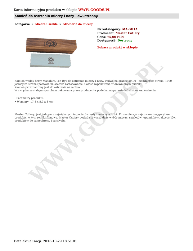 Karta informacyjna produktu w sklepie WWW.GOODS.PL Kamień do ostrzenia mieczy i noży - dwustronny Kategoria: » Miecze i szable » Akcesoria do mieczy Nr katalogowy: MA-SH1A Producent: Master Cutlery Cena: 75,00 PLN Dostępność: Dostępny S. PL Zobacz produkt w sklepie Parametry produktu: • Wymiary: 17,8 x 5,9 x 3 cm O D Kamień wodny firmy Masahiro/Ten Ryu do ostrzenia mieczy i noży. Podwójna gradacja(400 - ciemniejsza strona, 1000 jaśniejsza strona) pozwala na szersze zastosowanie. Całość zapakowana w drewnianym pudełku. Kamień przeznaczony jest do ostrzenia na mokro. W związku ze słabym sposobem pakowania przez producenta pudełka mogą posiadać drobne uszkodzenia. W W W .G O Master Cutlery, jest jednym z największych importerów noży i mieczy w USA. Firma oferuje najnowsze i najgorętsze produkty, w tym repliki filmowe. Master Cutlery posiada również duży wybór mieczy, sztyletów, upominków, akcesoriów, produktów do samoobrony i survivalu. Data aktualizacji: 2016-10-29 18:51:01