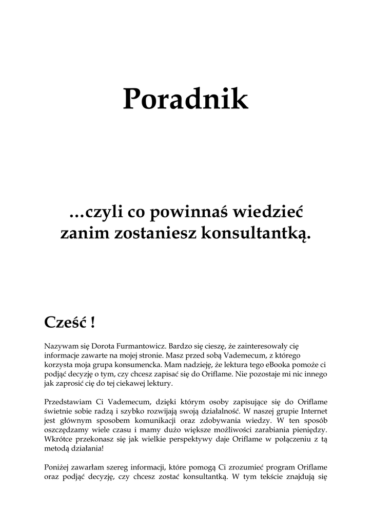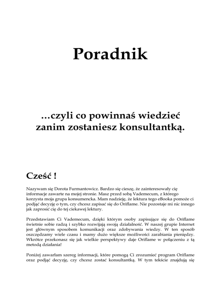 Poradnik …czyli co powinnaś wiedzieć zanim zostaniesz konsultantką. Cześć ! Nazywam się Dorota Furmantowicz. Bardzo się cieszę, że zainteresowały cię informacje zawarte na mojej stronie. Masz przed sobą Vademecum, z którego korzysta moja grupa konsumencka. Mam nadzieję, że lektura tego eBooka pomoże ci podjąć decyzję o tym, czy chcesz zapisać się do Oriflame. Nie pozostaje mi nic innego jak zaprosić cię do tej ciekawej lektury. Przedstawiam Ci Vademecum, dzięki którym osoby zapisujące się do Oriflame świetnie sobie radzą i szybko rozwijają swoją działalność. W naszej grupie Internet jest głównym sposobem komunikacji oraz zdobywania wiedzy. W ten sposób oszczędzamy wiele czasu i mamy dużo większe możliwości zarabiania pieniędzy. Wkrótce przekonasz się jak wielkie perspektywy daje Oriflame w połączeniu z tą metodą działania! Poniżej zawarłam szereg informacji, które pomogą Ci zrozumieć program Oriflame oraz podjąć decyzję, czy chcesz zostać konsultantką. W tym tekście znajdują się jedynie podstawowe informacje, szczegółową wiedzę otrzymasz w Vademecum numer 2 i 3, kiedy już się zarejestrujesz. Gdyby jednak jakiś temat zainteresował Cię bardziej i chciałabyś wiedzieć więcej – pisz do mnie., Odpowiem na każde Twoje pytanie. Gdy uznasz, że warto zapisać się do klubu Oriflame – na końcu tego dokumentu znajduje się link do formularza rejestracyjnego. Wpisz tam swoje dane – a ja zajmie się resztą. A więc czas na pierwsze kroki. To co? Zaczynamy? Kosmetyki Kosmetyki Oriflame są bardzo wysokiej jakości. Składniki i skuteczność wielu z nich są porównywalne z takimi firmami jak Vichy czy Helena Rubinstein. Jak wiesz są to kosmetyki z najwyższej cenowej półki. Ceny w Oriflame są dużo niższe, gdyż system ich sprzedaży i promocji jest oparty na innych zasadach. Chodzi o to, że kupujemy bezpośrednio od producenta – wobec tego nie płacimy marży: przewoźnikowi, hurtownikowi, sklepowi itd. Dzięki temu, tak doskonałe kosmetyki mogą kosztować niewiele. Jakość i skuteczność kosmetyków Oriflame jest naprawdę znakomita! Katalogi i składanie zamówienia Co trzy tygodnie firma Oriflame wydaje nowy katalog. Ważność oferty z katalogu wynosi dokładnie 21 dni. W katalogu umieszczone są głównie (choć nie tylko) super promocje, jakie w tym czasie obowiązują. Generalnie w ofercie jest około 900 produktów, także rozumiesz że wszystkie nie mogą się zmieścić w katalogu. Do katalogu dla konsultanta dołączony jest osobny cennik ( inne osoby nie będące konsultantami nie mają wglądu do cennika), w którym znajdziesz listę wszystkich produktów i ich ceny. Ponadto wszystkie produkty możesz zobaczyć na oficjalnej stronie Oriflame. Ten katalog to podstawa, bo najbardziej opłaca się kupować kosmetyki w promocji. Jeżeli się zapiszesz do Oriflame, produkt objęty przykładowo 50% promocją kupisz z dodatkowym rabatem 23%. Na przykład: woda toaletowa, która normalnie kosztuje 89 złotych, w katalogu jest w promocji za 44.90. Po 23% rabacie uzyskanym jako konsultantka kupisz ją za 34.54 złote. Jak zamawiać? To bardzo proste. Wybierasz sobie z katalogu kosmetyki, które chcesz zamówić, możesz to zrobić on-line wchodzisz na oficjalną stronę Oriflame i wypełniasz formularz zamówienia (szczegółowo te i inne rzeczy wyjaśnię Ci w następnych mailach, gdy zdecydujesz się zostać konsultantką). Fajną rzeczą w Oriflame jest też to, że nie musisz płacić za swoje kosmetyki od razu. Masz na to dwa tygodnie. Także jeśli chwilowo nie masz kasy, albo gdy zamawiasz również dla koleżanek – nie musisz płacić z góry – a dopiero wtedy, gdy odbierzesz od nich pieniądze. Paczkę z kosmetykami możesz odebrać w najbliżej filii, biurze regionalnym lub może Ci ją dostarczyć kurier do domu. Punkty Każdy kosmetyk, który zamówisz jest punktowany. W cenniku i na stronie Oriflame możesz sprawdzić ile punktów przysługuje na dany produkt. Oczywiście te droższe mają więcej punktów niż te tańsze. Po co są te punkty? Mają one kilka zastosowań, ale na początku najważniejsza dla Ciebie jest jedna kwestia: jeśli w okresie obowiązywania katalogu uzbierasz odpowiednią ilość punktów, oprócz rabatu możesz czerpać z programu także inne korzyści Np. jeżeli zbierzesz 80 punktów (co nie jest trudne) – nie płacisz opłat za paczkę, możesz mieć darmowego kuriera do domu, bierzesz też udział w specjalnych programach dla Konsultantów takich jak Program Witamy czy Program Lojalnościowy i otrzymujesz dodatkowe nagrody! Opłaty za przesyłkę Możesz złożyć zamówienie o dowolnej wartości. Jednak dopiero jak zbierzesz 80 punktów przesyłka jest gratis. Jeśli nie przekroczysz tego pułapu do Twojego zamówienia zostanie doliczone 11,90zł- jest to opłata za przygotowanie paczki. Możesz nie ponosić tych kosztów, gdy wybierzesz sobie promocyjny produkt za 15,90zł. To w przypadku gdybyś chciała kuriera do domu. Możesz rzecz jasna odebrać swoją paczkę osobiście i nie korzystać z kuriera. W takim przypadku opłata za paczkę poniżej 80 punktów wyniesie 7,90zł lub 11,90zł za produkt promocyjny. Oczywiście jeśli będzie to zamówienie na 80 punktów lub więcej dostawa jest bezpłatna. Jak wiesz, w ciągu jednego katalogu możesz składać zamówienia dowolną ilość razy, 24 godziny na dobę i 7 dni w tygodniu. Jeśli składasz kolejne zamówienie w tym samym okresie katalogowym, będzie ono zwolnione z opłaty za przygotowanie paczki wtedy gdy wartość punktowa zamówienia będzie wynosiła co najmniej 40 punktów i jeśli zsumowane punkty z Twoich zamówień w danym katalogu wyniosą co najmniej 80pp. Wtedy odbierzesz swoją paczkę bezpłatnie w oddziale, filii, biurze regionalnym. Jednak aby mieć kuriera za darmo to konkretne zamówienie musi mieć 80 punktów! Sposób Zamówienie od 80 PP Zamówienie poniżej 80PP dostarc