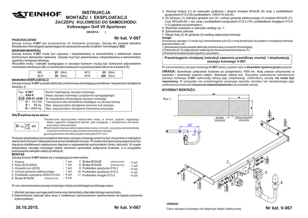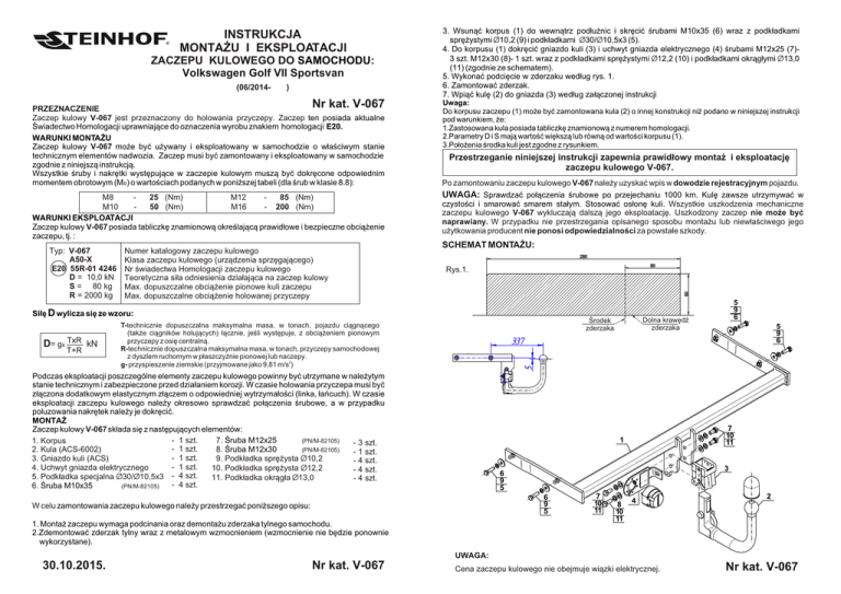 ZACZEPU KULOWEGO DO SAMOCHODU: Volkswagen Golf VII Sportsvan (06/2014- ® ) Nr kat. V-067 PRZEZNACZENIE Zaczep kulowy V-067 jest przeznaczony do holowania przyczepy. Zaczep ten posiada aktualne Œwiadectwo Homologacji uprawniaj¹ce do oznaczenia wyrobu znakiem homologacji E20. WARUNKI MONTA¯U Zaczep kulowy V-067 mo¿e byæ u¿ywany i eksploatowany w samochodzie o w³aœciwym stanie technicznym elementów nadwozia. Zaczep musi byæ zamontowany i eksploatowany w samochodzie zgodnie z niniejsz¹ instrukcj¹. Wszystkie œruby i nakrêtki wystêpuj¹ce w zaczepie kulowym musz¹ byæ dokrêcone odpowiednim momentem obrotowym (Mo) o wartoœciach podanych w poni¿szej tabeli (dla œrub w klasie 8.8): M8 25 (Nm) M12 85 (Nm) M10 50 (Nm) M16 - 200 (Nm) WARUNKI EKSPLOATACJI Zaczep kulowy V-067 posiada tabliczkê znamionow¹ okreœlaj¹c¹ prawid³owe i bezpieczne obci¹¿enie zaczepu, tj. : Typ: V-067 A50-X E20 55R-01 4246 D = 10,0 kN S = 80 kg R = 2000 kg Numer katalogowy zaczepu kulowego Klasa zaczepu kulowego (urz¹dzenia sprzêgaj¹cego) Nr œwiadectwa Homologacji zaczepu kulowego Teoretyczna si³a odniesienia dzia³aj¹ca na zaczep kulowy Max. dopuszczalne obci¹¿enie pionowe kuli zaczepu Max. dopuszczalne obci¹¿enie holowanej przyczepy 3. Wsun¹æ korpus (1) do wewn¹trz pod³u¿nic i skrêciæ œrubami M10x35 (6) wraz z podk³adkami sprê¿ystymi Ø10,2 (9) i podk³adkami Ø30/Ø10,5x3 (5). 4. Do korpusu (1) dokrêciæ gniazdo kuli (3) i uchwyt gniazda elektrycznego (4) œrubami M12x25 (7)3 szt. M12x30 (8)- 1 szt. wraz z podk³adkami sprê¿ystymi Ø12,2 (10) i podk³adkami okr¹g³ymi Ø13,0 (11) (zgodnie ze schematem). 5. Wykonaæ podciêcie w zderzaku wed³ug rys. 1. 6. Zamontowaæ zderzak. 7. Wpi¹æ kulê (2) do gniazda (3) wed³ug za³¹czonej instrukcji Uwaga: Do korpusu zaczepu (1) mo¿e byæ zamontowana kula (2) o innej konstrukcji ni¿ podano w niniejszej instrukcji pod warunkiem, ¿e: 1.Zastosowana kula posiada tabliczkê znamionow¹ z numerem homologacji. 2.Parametry D i S maj¹ wartoœæ wiêksz¹ lub równ¹ od wartoœci korpusu (1). 3.Po³o¿enia œrodka kuli jest zgodne z rysunkiem. Przestrzeganie niniejszej instrukcji zapewnia prawid³owy monta¿ i eksploatacjê zaczepu kulowego V-067. Po zamontowaniu zaczepu kulowego V-067 nale¿y uzyskaæ wpis w dowodzie rejestracyjnym pojazdu. UWAGA: Sprawdzaæ po³¹czenia œrubowe po przejechaniu 1000 km. Kulê zawsze utrzymywaæ w czystoœci i smarowaæ smarem sta³ym. Stosowaæ os³onê kuli. Wszystkie uszkodzenia mechaniczne zaczepu kulowego V-067 wykluczaj¹ dalsz¹ jego eksploatacjê. Uszkodzony zaczep nie mo¿e byæ naprawiany. W przypadku nie przestrzegania opisanego sposobu monta¿u lub niew³aœciwego jego u¿ytkowania producent nie ponosi odpowiedzialnoœci za powsta³e szkody. SCHEMAT MONTA¯U: 280 80 Rys.1. 60 INSTRUKCJA MONTA¯U I EKSPLOATACJI Si³ê D wylicza siê ze wzoru: T+R 5 9 6 337 5 D= gx TxR kN Dolna krawêdŸ zderzaka Œrodek zderzaka T-technicznie dopuszczalna maksymalna masa, w tonach, pojazdu ci¹gn¹cego (tak¿e ci¹gników holuj¹cych) ³¹cznie, jeœli wystêpuje, z obci¹¿eniem pionowym przyczepy z osiê centraln¹. R-technicznie dopuszczalna maksymalna masa, w tonach, przyczepy samochodowej z dyszlem ruchomym w p³aszczyŸnie pionowej lub naczepy. g- przyspieszenie ziemskie (przyjmowane jako 9,81 m/s2) 5 9 6 Podczas eksploatacji poszczególne elementy zaczepu kulowego powinny byæ utrzymane w nale¿ytym stanie technicznym i zabezpieczone przed dzia³aniem korozji. W czasie holowania przyczepa musi byæ z³¹czona dodatkowym elastycznym z³¹czem o odpowiedniej wytrzyma³oœci (linka, ³añcuch). W czasie eksploatacji zaczepu kulowego nale¿y okresowo sprawdzaæ po³¹czenia œrubowe, a w przypadku poluzowania nakrêtek nale¿y je dokrêciæ. MONTA¯ Zaczep kulowy V-067 sk³ada siê z nastêpuj¹cych elementów: - 1 szt. 7. Œruba M12x25 (PN/M-82105) 1. Korpus - 3 szt. - 1 szt. 8. Œruba M12x30 (PN/M-82105) 2. Kula (ACS-6002) - 1 szt. - 1 szt. 3. Gniazdo kuli (ACS) 9. Podk³adka sprê¿ysta Ø10,2 - 4 szt. - 1 szt. 4. Uchwyt gniazda elektrycznego 10. Podk³adka sprê¿ysta Ø12,2 - 4 szt. 5. Podk³adka specjalna Ø30/Ø10,5x3 - 4 szt. 11. Podk³adka okr¹g³a Ø13,0 - 4 szt. - 4 szt. 6. Œruba M10x35 (PN/M-82105) 7 10 11 1 3 6 9 5 6 9 5 W celu zamontowania zaczepu kulowego nale¿y przestrzegaæ poni¿szego opisu: 1. Monta¿ zaczepu wymaga podcinania oraz demonta¿u zderzaka tylnego samochodu. 2.Zdemontowaæ zderzak tylny wraz z metalowym wzmocnieniem (wzmocnienie nie bêdzie ponownie wykorzystane). 7 10 11 8 10 11 4 2 UWAGA: 30.10.2015. Nr kat. V-067 Cena zaczepu kulowego nie obejmuje wi¹zki elektrycznej. Nr kat. V-067 TOW BAR FOR Volkswagen Golf VII Sportsvan (06/2014- ® ) FITTING AND OPERATION MANUAL Cat. No.V-067 DESTINATION Tow bar V-067 is designed for towing a trailer. This ball hook has a current certification of approval authorizing the product with E20 certification sign. FITTING CONDITIONS Tow bar V-067 can be used and operated in a car with proper technical conditions of body elements. Those parts cannot be mechanically damaged . The ball hook has to be installed and operated in a car according to this instruction . All bolts and nuts in ball hook have to be screwed down with proper torque (Mo) . Torque values are given below : M8 M10 - 25 (Nm) 50 (Nm) M12 M16 - After assembling of the tow bar V-067 you have to get entry in cars registration book. CAUTION : Check if all bolts and nuts are correctly tightened after 1000km. Keep tow ball clean, grease and cased. All mechanical damages of tow bar excludes its further exploitation . Damaged ball hook cannot be repaired. In case of braking the rules of montage or unproper usage manufacturer do not take responsibility for arised damages . 85 (Nm) 200 (Nm) OPERATION CONDITIONS The tow bar V-067 has a rating plate describing correct and safe loads of the hook : MONTAGE DIAGRAM : Tow bar catalogue number. Tow bar class ( compressing device ) Tow bar