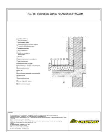 Rys. 35: 1 cienkowarstwowy tynk strukturalny 1 2 3 4 5 5 zaprawa klejowa 6 7 termoizolacji 12 13 14 15 16 18 9 zaprawa klejowa T50 11 hydroizolacja - zaprawa uszczelniajaca 8 9 12 warstwa dociskowa 10 13 folia PE 11 14 termoizolacja (polistyren ekstrudowany) 15 paroizolacja 16 warstwa spadkowa u 17 UWAGI: z AT i ETA CHEMIA BUDOWLANA 9)"zaprawa klejowa" Greinplast PE lub PME 12)"warstwa dociskowa " Greinplast JP 16)"warstwa spadkowa" Greinplast JWF Greinplast ITU