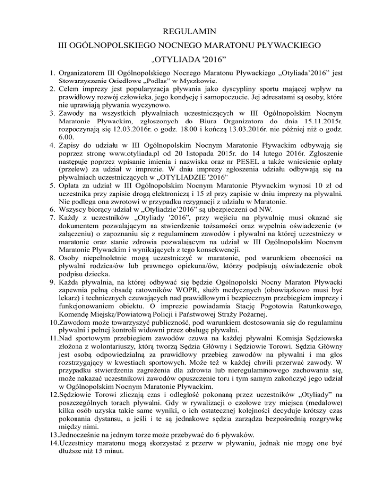 REGULAMIN III OGÓLNOPOLSKIEGO NOCNEGO MARATONU PŁYWACKIEGO „OTYLIADA '2016” 1. Organizatorem III Ogólnopolskiego Nocnego Maratonu Pływackiego „Otyliada’2016” jest Stowarzyszenie Osiedlowe „Podlas” w Myszkowie. 2. Celem imprezy jest popularyzacja pływania jako dyscypliny sportu mającej wpływ na prawidłowy rozwój człowieka, jego kondycję i samopoczucie. Jej adresatami są osoby, które nie uprawiają pływania wyczynowo. 3. Zawody na wszystkich pływalniach uczestniczących w III Ogólnopolskim Nocnym Maratonie Pływackim, zgłoszonych do Biura Organizatora do dnia 15.11.2015r. rozpoczynają się 12.03.2016r. o godz. 18.00 i kończą 13.03.2016r. nie później niż o godz. 6.00. 4. Zapisy do udziału w III Ogólnopolskim Nocnym Maratonie Pływackim odbywają się poprzez stronę www.otyliada.pl od 20 listopada 2015r. do 14 lutego 2016r. Zgłoszenie następuje poprzez wpisanie imienia i nazwiska oraz nr PESEL a także wniesienie opłaty (przelew) za udział w imprezie. W dniu imprezy zgłoszenia udziału odbywają się na pływalniach uczestniczących w „OTYLIADZIE '2016” 5. Opłata za udział w III Ogólnopolskim Nocnym Maratonie Pływackim wynosi 10 zł od uczestnika przy zapisie drogą elektroniczą i 15 zł przy zapisie w dniu imprezy na pływalni. Nie podlega ona zwrotowi w przypadku rezygnacji z udziału w Maratonie. 6. Wszyscy biorący udział w „Otyliadzie’2016” są ubezpieczeni od NW. 7. Każdy z uczestników „Otyliady '2016”, przy wejściu na pływalnię musi okazać się dokumentem pozwalającym na stwierdzenie tożsamości oraz wypełnia oświadczenie (w załączeniu) o zapoznaniu się z regulaminem zawodów i pływalni na której uczestniczy w maratonie oraz stanie zdrowia pozwalającym na udział w III Ogólnopolskim Nocnym Maratonie Pływackim i wynikających z tego konsekwencji. 8. Osoby niepełnoletnie mogą uczestniczyć w maratonie, pod warunkiem obecności na pływalni rodzica/ów lub prawnego opiekuna/ów, którzy podpisują oświadczenie obok podpisu dziecka. 9. Każda pływalnia, na której odbywać się będzie Ogólnopolski Nocny Maraton Pływacki zapewnia pełną obsadę ratowników WOPR, służb medycznych (obowiązkowo musi być lekarz) i technicznych czuwających nad prawidłowym i bezpiecznym przebiegiem imprezy i funkcjonowaniem obiektu. O imprezie powiadamia Stację Pogotowia Ratunkowego, Komendę Miejską/Powiatową Policji i Państwowej Straży Pożarnej. 10.Zawodom może towarzyszyć publiczność, pod warunkiem dostosowania się do regulaminu pływalni i pełnej kontroli widowni przez obsługę pływalni. 11.Nad sportowym przebiegiem zawodów czuwa na każdej pływalni Komisja Sędziowska złożona z wolontariuszy, którą tworzą Sędzia Główny i Sędziowie Torowi. Sędzia Główny jest osobą odpowiedzialną za prawidłowy przebieg zawodów na pływalni i ma głos rozstrzygający w kwestiach sportowych. Może też w każdej chwili przerwać zawody. W przypadku stwierdzenia zagrożenia dla zdrowia lub nieregulaminowego zachowania się, może nakazać uczestnikowi zawodów opuszczenie toru i tym samym zakończyć jego udział w Ogólnopolskim Nocnym Maratonie Pływackim. 12.Sędziowie Torowi zliczają czas i odległość pokonaną przez uczestników „Otyliady” na poszczególnych torach pływalni. Gdy w rywalizacji o czołowe trzy miejsca (medalowe) kilka osób uzyska takie same wyniki, o ich ostatecznej kolejności decyduje krótszy czas pokonania dystansu, a jeśli i te są jednakowe sędzia zarządza bezpośrednią rozgrywkę między nimi. 13.Jednocześnie na jednym torze może przebywać do 6 pływaków. 14.Uczestnicy maratonu mogą skorzystać z przerw w pływaniu, jednak nie mogę one być dłuższe niż 15 minut. 15.Każdy uczestnik III Ogólnopolskiego Nocnego Maratonu Pływackiego bierze udział w zawodach w kostiumie kąpielowym i czepku (jeśli tak stanowi regulamin pływalni). 16.Uczestnicy maratonu pływają według wyznaczonego harmonogramu dostępnego u Sędziego Głównego. 17.Komisja Sędziowska sporządza protokół zawodów (wzór w załączeniu), zawierający obok imion i nazwisk uczestników także nr PESEL oraz dystans jaki przepłynęli i czas. Protokół z wyszczególnieniem pływaków, którzy przepłynęli najdłuższy dystans, najliczniejszej rodziny (jeżeli rodzina liczy 5 osób i powyżej, a także jej łącznego dystansu) oraz najstarszego i najmłodszego uczestnika Komisja Sędziowska przesyła drogą elektroniczną w ciągu godziny od zakończenia zawodów do organizatora Ogólnopolskiego Nocnego Maratonu Pływackiego – Stowarzyszenia Osiedlowego „Podlas” na adres mailowy [email protected]. Organizator zastrzega sobie prawo do imiennej publikacji wyników na stronie www.otyliada.pl i przekazania ich mediom. 18.Wszyscy uczestnicy „Otyliady’2016” otrzymają identyfikator i certyfikat uczestnictwa, a specjalnymi nagrodami na każdej pływalni uhonorowani zostaną pływacy, którzy przepłynęli najdłuższy dystans, najstarsi, najmłodsi i najliczniejsze rodziny (liczące co najmniej pięć osób). 19.W czasie trwania III Ogólnopolskiego Nocnego Maratonu Pływackiego obligatoryjnie na pływalniach i w materiałach informacyjnych „Otyliady’2016” umieszczone będą loga sponsorów i patronów imprezy. 20.Organizator zastrzega sobie prawo do zmian w regulaminie, publikację ich na stronie www.otyliada.pl i powiadomienie o tych zmianach pływalni biorących udział w maratonie. Komitet Organizacyjny III Ogólnopolskiego Nocnego Maratonu Pływackiego „Otyliada 2016”