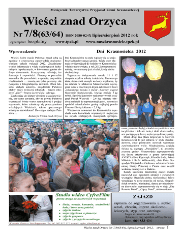 Miesięcznik Towarzystwa Przyjaciół Ziemi Krasnosielckiej Wieści znad Orzyca Nr 7/8(63/64) ISSN 2080-024X lipiec/sierpień 2012 rok egzemplarz bezpłatny www.tpzk.pl Wprowadzenie Wieści, które macie Państwo przed sobą są zgodnie z czerwcową zapowiedzią podsumowaniem całych wakacji 2012. Znajdziemy w nich informacje o wielu wydarzeniach kulturalnych i społecznych, w które nasza gmina obfituje nieustannie. Przeczytamy refleksje, informacje i zapowiedzi. Piszemy o potrzebie szacunku dla przeszłości, o sporcie, przyrodzie i kulinariach … zresztą nie tylko piszemy, ale rysujemy i fotografujemy również. Obok tekstów stałych autorów, znajdziecie Państwo efekty pracy twórczej młodych i bardzo młodych „piór” – brawo za wysiłek i odwagę. Zachęcając do lektury prosimy o zastanowienie, czy samo czytanie, aby na pewno Państwu wystarcza? Może warto zaryzykować i podjąć wyzwanie, które zakończy się przeczytaniem w kolejnych Wieściach, tekstu opatrzonego własnym nazwiskiem? Do czego zachęca Państwa … Redakcja Wieści znad Orzyca www.naszkrasnosielc.tpzk.pl Dni Krasnosielca 2012 Dni Krasnosielca na stałe wpisały się w krajobraz kulturalny naszej gminy. Wiele osób planuje swój przyjazd do rodziny w Krasnosielcu właśnie na to święto, a rok 2012 przypomnieć należy, to czternasty już z kolei, kiedy dni te obchodzimy. Tegoroczne świętowanie trwało 11 i 12 sierpnia, czyli w sobotę i niedzielę. Pierwszego dnia, skoro świt, ruszyli na łowy wędkarze, by na zalewie w Makowie Mazowieckim wyciągnąć wraz z moczonym kijem rekordowe ilości „smacznego mięska z ością”. Zawody wygrał Sławomir Kubaszewski, łowiąc prawie 5 kg rybki. Spośród juniorów najlepszy wynik osiągnął Paweł Wysocki – 2,6 kg, niestety obydwaj należeli do reprezentacji gości, natomiast spośród mieszkańców gminy najlepiej poszło Piotrowi Święcickiemu – 2,1 kg. Wieczorem natomiast do Krasnosielca zajechała cała kawalkada wspaniałych mężczyzn na swych szalejących maszynach (przepra- szam, panie też były), chodzi oczywiście o motocyklistów i ich nie tanią i dość ekstremalną, acz pociągającą duszę mężczyzny-łowcy pasję. Dzień drugi (na placu targowym w Nowym Krasnosielcu) to już zabawa w stylu standardowym, choć pomysłów nowych wdrożono z powodzeniem wiele. Niedocenioną częścią święta są występy „Swojaków”, tj. artystów z terenu gminy. Niezawodnie zaprezentowały się dusze artystyczne z grupy śpiewającej AVISTA (Ewa Kęszczyk, Klaudia Łada, Jakub Mikulak i Rafał Wilkowski), chór Koła Gospodyń Wiejskich z Grabowa, orkiestra Ochotniczej Straży Pożarnej z Pienic oraz zespół wokalny nauczycieli z Raków. Każdy uczestnik niedzielnej części święta nacieszył oko ogromem atrakcji i ciekawych występów. Brzmiała dobra, różnorodna i łatwo wpadająca w ucho muzyka od rocka, hiszpańskich rytmów, biesiadnej, dance po nieodzowne disco polo, zaprezentowały się w niej: „The Roxette Band”, „Gipsy Band”, niekwestiono- ZAJAZD zaprasza do organizowania u siebie: wesel, chrzcin, imprez okolicznościowych, styp oraz cateringu. Stegna ul. Warszawska 26 /Jednorożec przy wjeździe od Drążdżewa/ kom. 664 833 434 Wieści znad Orzyca Nr 7/8(63/64), lipiec/sierpień 2012, strona 1 wana gwiazda wieczoru zespół „Akcent” i grupa „Helios”, która do późnych godzin nocnych bawiła przybyłych na zabawie tanecznej. Rozśmieszał kabaret „Szuje” z Ostrołęki, a w odległe czasy Mieszka I przeniosła nas Drużyna Wojów Piastowskich „Jantar”. Towarzystwo Przyjaciół Ziemi Krasnosielckiej zorganizowało krótki (ale wcale nie łatwy) test ze znajomości historii i teraźniejszości gminy Krasnosielc, twórcy ludowi i artyści plastycy zaprezentowali swoje prace, a panie z naszych Kół Gospodyń pokazały co umieją wyczarować w swoich kuchniach. A gdy nastał zmrok, w górę poszybowało krasnosielckie „światełko do nieba”, czyli dwieście kolorowych lampionów puszczonych przez mieszkańców gminy i przybyłych gości. Wszyscy byli sympatyczni, radośni, pogodni i uśmiechnięci. Wszak to Nasze Święto! Pewien policjant-uczestnik w rozmowie ze mną powiedział: W porównaniu z dotychcza- sowymi imprezami plenerowymi w powiecie, nawet w Makowie i w Różanie, Wy w Krasnosielcu macie taki niepowtarzalny klimat. Tu widzę, że jest najwięcej uczestniczących ludzi, no i jest bezpiecznie – żadnej interwencji, chyba dobrzy ludzie tu mieszkają. Przerażenie budziły jedynie ubywające „dutki” z portfela. Tu dyszka, tam dwie – i już trzy stówki wyfrunęły, a dzieciom trudno odmówić” – rzekł napotkany znajomy – Impreza fajna, ale strach całą rodziną przyjechać, bo szkoła za pasem, a wypłata wcale nie bogata”. Tym bardziej cieszy zapobiegliwość organizatorów, którzy zapewnili 3 darmowe godziny takich atrakcji jak: zapasy sumo, zjeżdżalnia z przeszkodami, euro-bungee czy byk rodeo. Jednak nawet konkurencje z nagrodami rzeczowymi od GOK-u nie zrekompensują poniesionych wydatków. - Cieszę się z pogody, która choć niepewna, to okazała się dla nas bardzo życzliwa – podsumowała Dni Krasnosielca Pani Beata Heromińska, szefowa Gminnego Ośrodka Kultury Przybyli ludzie mogli skorzystać z tych wszystkich atrakcji, które dla nich wspólnie przygotowaliśmy. Jeden z moich współpracowników nerwowo w przeddzień przeglądał internetowe prognozy pogody, i podminowany czekał co będzie, a ja, spokojnie poszłam pomodlić się do kościoła – i kto miał rację? Widzę, że niektórzy ludzie czekają cały rok na Dni Krasnosielca, impreza ta stała się naszą fajną wizytówką. Dziękuję wszystkim, dzięki którym zrobiliśmy to, co zrobiliśmy. Bogu podziękuję osobno. Gdy „Coś” się udaje, trzeba podziękować tym, dzięki którym to „Coś” się udało. Jednak gdy następuje zgrzyt, niepowodzenie czy jakaś wpadka, zawsze winna jest