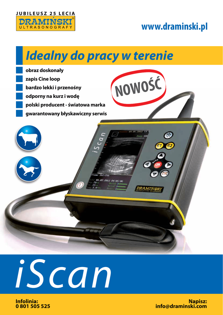 JUBILEUSZ 25 LECIA www.draminski.pl PREMIERE 2012 do pracy w terenie Idealny obraz doskonały zapis Cine loop bardzo lekki i przenośny odporny na kurz i wodę Ć Ś O W O N polski producent - światowa marka gwarantowany błyskawiczny serwis iScan Infolinia:Napisz: 0 801 505 525 [email protected] JUBILEUSZ 25 LECIA www.draminski.pl iScan 2012 przenośny ultrasonograf weterynaryjny z rektalną sondą liniową PREMIERE Obraz doskonały W pełni cyfrowa technika obrazowania (B, B+B) jest niezawodna w precyzyjnej diagnozie m. in. – pełnej reprodukcji krów i klaczy – ścięgien i gałki ocznej u koni • pionowy ekran LCD LED 5” • jasny kontrastowy obraz • Gamma, Focus, Gain Zapis Cine loop • Cine loop 256 klatek (ok. 20 sekund wideo) • pamięć 200 obrazów, 50 sekwencji Cine loop • transmisja danych do PC przez złącze USB Dzięki unikalnej pętli Cine loop możesz odtworzyć 20. sekundowe sekwencje wideo i sprawdzić bez pośpiechu jak dokładnie wygląda badany narząd. Naprawdę przenośne USG Duraluminiowa obudowa Bardzo lekki, w pełni mobilny i zasilany wyjątkowo trwałą baterią iScan zapewni komfort podczas wielogodzinnej pracy. Wodoodporna obudowa iScan’a pozwala na mycie aparatu nawet myjką ciśnieniową. Wystarczy odpiąć baterię i skierować strumień wody bezpośrednio na urządzenie. • waga 1720 g bez akumulatora, akumulator 280 g • wymiary 17 cm (dł.) x 17 cm (szer.) x 6,5 cm (wys.) • z asilanie – bateria zewnętrzna, czas pracy 5 h, czas ładowania 2h 30min DRAMIŃSKI ul. Owocowa 17, 10-860 Olsztyn, Poland infolinia: 0 801 505 525, [email protected] • uproszczona klawiatura i przejrzyste menu w wielu językach • wodoodporna sonda rektalna liniowa 7,5 MHz (szerokopasmowa od 4,0 MHz do 9,0 MHz) • głębokość penetracji od 4 cm do 12 cm KONSTRUUJEMY PRODUKUJEMY SPRZEDAJEMY SERWISUJEMY