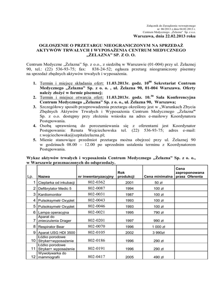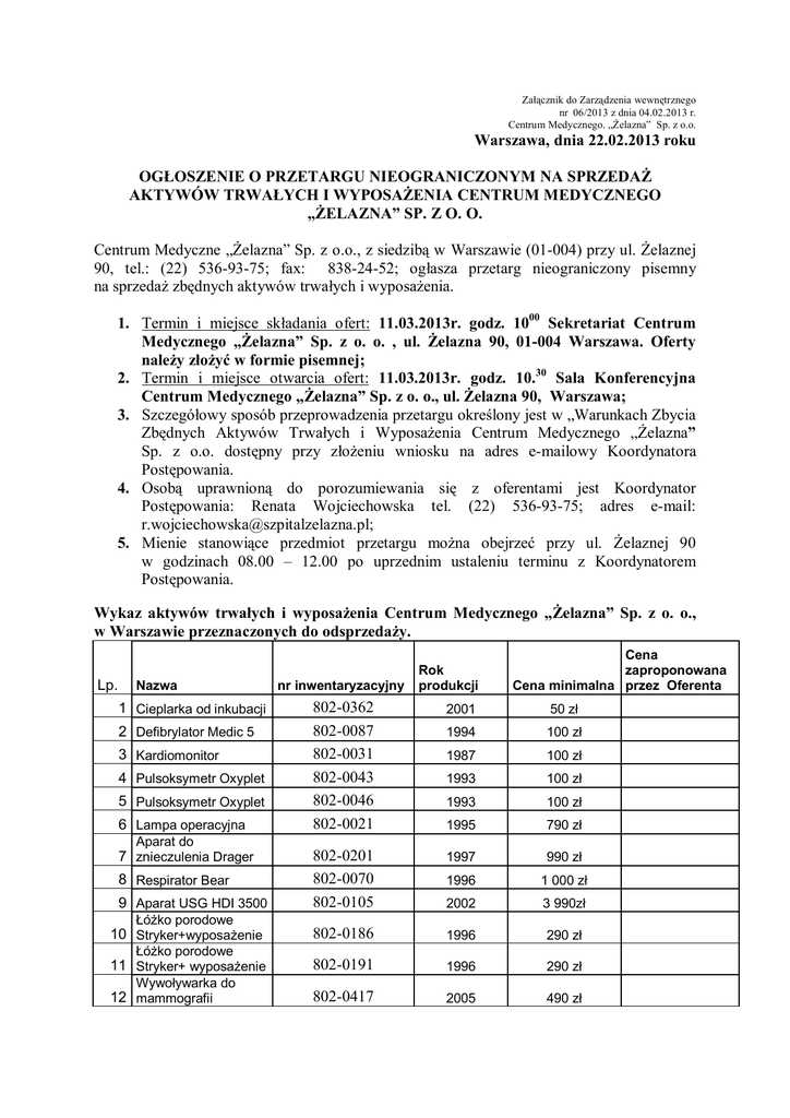 Załącznik do Zarządzenia wewnętrznego nr 06/2013 z dnia 04.02.2013 r. Centrum Medycznego. „Żelazna” Sp. z o.o. Warszawa, dnia 22.02.2013 roku OGŁOSZENIE O PRZETARGU NIEOGRANICZONYM NA SPRZEDAŻ AKTYWÓW TRWAŁYCH I WYPOSAŻENIA CENTRUM MEDYCZNEGO „ŻELAZNA” SP. Z O. O. Centrum Medyczne „Żelazna” Sp. z o.o., z siedzibą w Warszawie (01-004) przy ul. Żelaznej 90, tel.: (22) 536-93-75; fax: 838-24-52; ogłasza przetarg nieograniczony pisemny na sprzedaż zbędnych aktywów trwałych i wyposażenia. 1. Termin i miejsce składania ofert: 11.03.2013r. godz. 1000 Sekretariat Centrum Medycznego „Żelazna” Sp. z o. o. , ul. Żelazna 90, 01-004 Warszawa. Oferty należy złożyć w formie pisemnej; 2. Termin i miejsce otwarcia ofert: 11.03.2013r. godz. 10.30 Sala Konferencyjna Centrum Medycznego „Żelazna” Sp. z o. o., ul. Żelazna 90, Warszawa; 3. Szczegółowy sposób przeprowadzenia przetargu określony jest w „Warunkach Zbycia Zbędnych Aktywów Trwałych i Wyposażenia Centrum Medycznego „Żelazna” Sp. z o.o. dostępny przy złożeniu wniosku na adres e-mailowy Koordynatora Postępowania. 4. Osobą uprawnioną do porozumiewania się z oferentami jest Koordynator Postępowania: Renata Wojciechowska tel. (22) 536-93-75; adres e-mail: [email protected]; 5. Mienie stanowiące przedmiot przetargu można obejrzeć przy ul. Żelaznej 90 w godzinach 08.00 – 12.00 po uprzednim ustaleniu terminu z Koordynatorem Postępowania. Wykaz aktywów trwałych i wyposażenia Centrum Medycznego „Żelazna” Sp. z o. o., w Warszawie przeznaczonych do odsprzedaży. Lp. Nazwa 1 Cieplarka od inkubacji 2 Defibrylator Medic 5 3 Kardiomonitor 4 Pulsoksymetr Oxyplet 5 Pulsoksymetr Oxyplet 6 Lampa operacyjna Aparat do 7 znieczulenia Drager 8 Respirator Bear 9 Aparat USG HDI 3500 Łóżko porodowe 10 Stryker+wyposażenie Łóżko porodowe 11 Stryker+ wyposażenie Wywoływarka do 12 mammografii nr inwentaryzacyjny Rok produkcji Cena zaproponowana Cena minimalna przez Oferenta 802-0362 802-0087 802-0031 802-0043 802-0046 802-0021 2001 50 zł 1994 100 zł 1987 100 zł 1993 100 zł 1993 100 zł 1995 790 zł 802-0201 802-0070 802-0105 1997 990 zł 1996 1 000 zł 2002 3 990zł 802-0186 1996 290 zł 802-0191 1996 290 zł 802-0417 2005 490 zł Wywoływarka do błon RTG w konfiguracji IX 13 typ Compact 14 Aparat RTG Philips 15 Łóżko porodowe 16 Łóżko porodowe 17 18 19 20 Nagetoskop mammograficzny Negatoskop diagnostyczny Wózek na aparaturę medyczną Respirator CHIROLOG 21 Kaseta RTG 22 Kaseta RTG 23 Kaseta RTG 24 Kaseta RTG 25 Kaseta RTG 26 Kaseta RTG 802-0200 802-0360 802-0423 802-0424 1997 290 zł 1999 4 500zł 2005 590 zł 2005 590 zł 802-0486 2008 990 zł 6901/01 2000 490 zł 802-0025 1994 390 zł 802-0353 69/0001 69/0002 69/0003 69/0004 69/0005 69/0006 2001 790 zł 1999 1999 30 zł 1999 1999 1999 1999 PREZES ZARZĄDU Wojciech Puzyna dr n. med. Załącznik nr 1 – zdjęcia przedmiotów przeznaczonych do zbycia. 30 zł 30 zł 50 zł 50 zł 50 zł