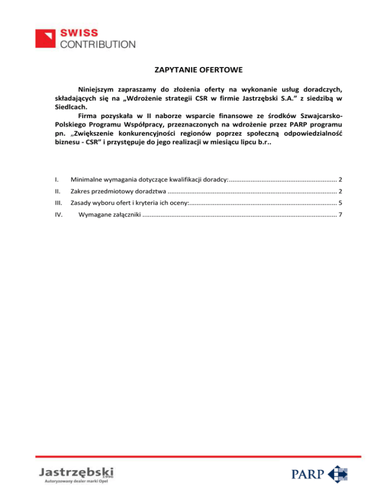 ZAPYTANIE OFERTOWE Niniejszym zapraszamy do złożenia oferty na wykonanie usług doradczych, składających się na „Wdrożenie strategii CSR w firmie Jastrzębski S.A.” z siedzibą w Siedlcach. Firma pozyskała w II naborze wsparcie finansowe ze środków SzwajcarskoPolskiego Programu Współpracy, przeznaczonych na wdrożenie przez PARP programu pn. „Zwiększenie konkurencyjności regionów poprzez społeczną odpowiedzialność biznesu - CSR” i przystępuje do jego realizacji w miesiącu lipcu b.r.. I. Minimalne wymagania dotyczące kwalifikacji doradcy: ............................................................ 2 II. Zakres przedmiotowy doradztwa .............................................................................................. 2 III. Zasady wyboru ofert i kryteria ich oceny:.................................................................................. 5 IV. Wymagane załączniki ............................................................................................................ 7 I. Minimalne wymagania dotyczące kwalifikacji doradcy: Doradca musi posiadać doświadczenie w świadczeniu usług w zakresie co najmniej trzech usług doradczych z obszarów CSR: środowisko naturalne, relacje z personelem przedsiębiorstwa zaangażowanie społeczne, a w tym dwóch usług doradczych świadczonych na rzecz przedsiębiorców. Doradca/doradcy: Imię i Nazwisko Doświadczenie w wymaganym zakresie podlegającym ocenie – kryterium 3. i 4.: Opis sposobu realizacji usług (forma, etapy, zasady współpracy): II. Zakres przedmiotowy doradztwa Opracowanie strategii CSR dla firmy Jastrzębski S.A. w tym: zaplanowanie i wdrożenie zmian zwiększających ekologiczność procesu świadczenia usług przy wykorzystaniu np. standardu EMAS Easy opracowanie i stworzenie programu wolontariatu pracowniczego jako kluczowego elementu służącego wzmocnieniu komunikacji firmy z otoczeniem wdrożenie raportowania wg standardu GRI.4 zaprojektowanie systemu dwukierunkowej komunikacji wewnętrznej (dialogowej) pomiędzy pracownikami a kierownictwem i właścicielami z wykorzystaniem standardu AA1000 stworzenie koncepcji realizacyjnej strategii CSR (dokument do przyjęcia przez zarząd spółki) Poniżej znajduje się formularz ofertowy w którym wyspecyfikowane zostały zadania cząstkowe, które zostały uwzględnione we wniosku o dotację. Zakłada się, że wykonawca określi nakład czasowy w godzinach niezbędny do ich wykonania. Opis zadań jest na tyle szczegółowy na ile pozwalają wstępne opisy, które zostały zawarte we wniosku. To oznacza, że wykonawca powinien przyjąć założenia pomocnicze dotyczące wizji realizacyjnej i je przedstawić w opisie sposobu realizacji usług doradczych. FORMULARZ OFERTOWY Dane składającego ofertę Termin ważności oferty Opis zakres usług: Usługi doradcze w obszarze I – Środowisko naturalne 1. Opracowanie strategii CSR w zakresie oddziaływania na środowisko naturalne na podstawie dokonanego audytu 2. Wdrożenie standardu EMAS Easy w celu uporządkowania polityki firmy w aspekcie wpływu na środowisko, który obejmie m.in. - wprowadzenie czytelnego systemu oznakowania obiektu pod kątem przestrzegania norm ochrony środowiska - określenie wskaźników oddziaływania na środowisko poszczególnych etapów świadczenia 4 procesów usług (sprzedaży i serwisowania samochodów oraz wykonywania napraw powypadkowych oraz świadczenia usług lakierniczych na zlecenie) - zintegrowanie przestrzegania norm zużycia energii i innych zasobów z systemem nagradzania pracowników 3. Zrealizowanie inwestycji prowadzącej do zwiększenia ekologiczności świadczonych usług (poprawa bilansu energetycznego firmy, ograniczenie emisyjności CO2) Zaplanowane działania mają na celu: - zwiększyć efektywność materiałową i energetyczną 4 usług w całym procesie ich realizacji (mniejsze zużycie papieru, prądu, wody) - zredukować ilość odpadów ponaprawczych – wyższy udział elementów poddawanych utylizacji - zminimalizować negatywny wpływ usług serwisowych na środowisko poprzez redukcję emisji gazów cieplarnianych (emitowanych w trakcie świadczenia) Czas ogółem Stawka godzinowa w PLN Nakład czasu w roboczogodzinach dla poszczególnych pozycji działań Usługi doradcze w obszarze III - Zaangażowanie społeczne 1.Wykonanie audytu przez doradcę CSR obszaru zaangażowania społecznego w aspekcie kształtowania właściwych relacji z otoczeniem biznesowym, instytucjami publicznymi i samorządowymi oraz lokalną społecznością 2. Opracowanie strategii CSR w zakresie zaangażowania społecznego na podstawie dokonanego audytu, w tym: - opracowanie mapy interesariuszy - stworzenie jawnej polityki wspierania inicjatyw społecznych w ramach wolontariatu pracowniczego, którego celem jest zwiększenie bezpieczeństwa na drodze (wdrożenie idei systemu edukacji klientów i potencjalnych klientów oraz budowania świadomości zagrożeń u dzieci) - stworzenie programu stażowego dla uczniów techników, szkół zawodowych oraz członków OHP 3. Opracowanie narzędzi do wdrożenia raportowania GRI.4 i jego wdrożenie 4. Zorganizowanie konferencji dla klientów i kontrahentów oraz przedstawicieli społeczności lokalnej dotyczącej wpływu wdrażania strategii CSR na warunki współpracy firmy z otoczeniem Czas ogółem Stawka godzinowa w PLN Nakład czasu w roboczogodzinach dla poszczególnych pozycji działań Usługi doradcze w obszarze III - Zaangażowanie społeczne 1.Wykonanie audytu przez doradcę CSR obszaru zaangażowania społecznego w aspekcie kształtowania właściwych relacji z otoczeniem biznesowym, instytucjami publicznymi i samorządowymi oraz lokalną społecznością 2. Opracowanie strategii CSR w zakresie zaangażowania społecznego na podstawie dokonanego audytu, w tym: - opracowanie mapy interesariuszy - stworzenie jawnej polityki wspierania inicjatyw społecznych w ramach wolontariatu pracowniczego, k