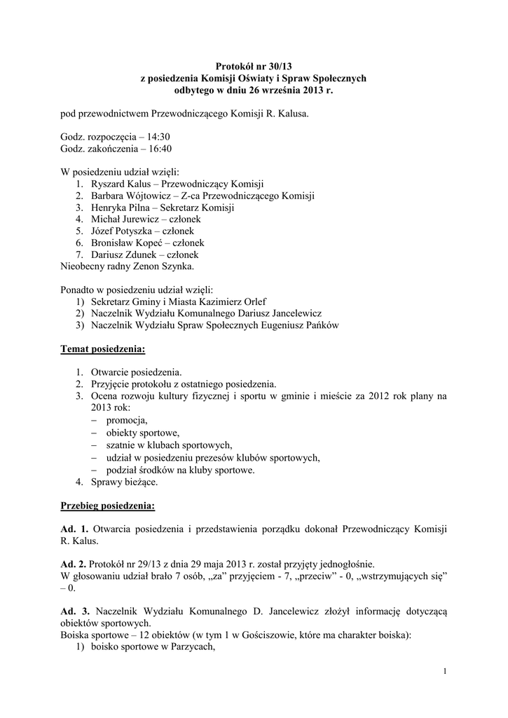 Protokół nr 30/13 z posiedzenia Komisji Oświaty i Spraw Społecznych odbytego w dniu 26 września 2013 r. pod przewodnictwem Przewodniczącego Komisji R. Kalusa. Godz. rozpoczęcia – 14:30 Godz. zakończenia – 16:40 W posiedzeniu udział wzięli: 1. Ryszard Kalus – Przewodniczący Komisji 2. Barbara Wójtowicz – Z-ca Przewodniczącego Komisji 3. Henryka Pilna – Sekretarz Komisji 4. Michał Jurewicz – członek 5. Józef Potyszka – członek 6. Bronisław Kopeć – członek 7. Dariusz Zdunek – członek Nieobecny radny Zenon Szynka. Ponadto w posiedzeniu udział wzięli: 1) Sekretarz Gminy i Miasta Kazimierz Orlef 2) Naczelnik Wydziału Komunalnego Dariusz Jancelewicz 3) Naczelnik Wydziału Spraw Społecznych Eugeniusz Pańków Temat posiedzenia: 1. Otwarcie posiedzenia. 2. Przyjęcie protokołu z ostatniego posiedzenia. 3. Ocena rozwoju kultury fizycznej i sportu w gminie i mieście za 2012 rok plany na 2013 rok: promocja, obiekty sportowe, szatnie w klubach sportowych, udział w posiedzeniu prezesów klubów sportowych, podział środków na kluby sportowe. 4. Sprawy bieżące. Przebieg posiedzenia: Ad. 1. Otwarcia posiedzenia i przedstawienia porządku dokonał Przewodniczący Komisji R. Kalus. Ad. 2. Protokół nr 29/13 z dnia 29 maja 2013 r. został przyjęty jednogłośnie. W głosowaniu udział brało 7 osób, „za” przyjęciem - 7, „przeciw” - 0, „wstrzymujących się” – 0. Ad. 3. Naczelnik Wydziału Komunalnego D. Jancelewicz złożył informację dotyczącą obiektów sportowych. Boiska sportowe – 12 obiektów (w tym 1 w Gościszowie, które ma charakter boiska): 1) boisko sportowe w Parzycach, 1 2) boisko sportowe poł. na terenie Gościszowa, a użytkowane przez Klub Sportowy w Milikowie; 3) boisko sportowe w Kierżnie; 4) stadion w Nowogrodźcu; 5) boisko sportowe w Godzieszowie; 6) boisko sportowe w Gościszowie; 7) boisko sportowe w Wykrotach; 8) boisko sportowe w Zabłociu; 9) boisko sportowe w Czernej; 10) boisko sportowe w Zebrzydowej; 11) boisko sportowe w Gierałtowie; 12) boisko sportowe w Nowogrodźcu tzw. boisko boczne. Wszystkie obiekty sportowe są użyczone Gminnemu Centrum Kultury i Sportu w Nowogrodźcu. Boisko sportowe w Wykrotach i Zebrzydowej są wyposażone w szatnie sportowe. Boiska utrzymywane są w ramach umowy na utrzymanie zieleni w mieście i gminie Nowogrodziec. Boiska, na których są rozgrywki utrzymywane są w standardzie takim, że jest większa ilość koszenia i pielęgnacji. Przewodniczący Komisji R. Kalus zadał pytanie, czy jest przewidziana rekultywacja boisk w Wykrotach i Zebrzydowej? Naczelnik Wydziału Komunalnego D. Jancelewicz odpowiedział, że rekultywacja to zadanie inwestycyjne. W tym roku była przeprowadzona w Nowogrodźcu. Wymiana całej murawy wiąże się z dużymi kosztami. Radny D. Zdunek stwierdził, że nie opłaca się wymieniać płyty, która jest dużo trwalsza niż boisko z nową murawą. Natomiast proste zabiegi jak napowietrzanie, czy piaskowanie to jak najbardziej. Wiceprzewodnicząca Rady H. Pilna poinformowała, że Pan Fr. Doliński z Klubu Sportowego w Gierałtowie zwrócił się z interwencją, że boisko w Gierałtowie jest źle utrzymywane. Również stwierdził, że boisko (stadion) w Nowogrodźcu jest nie takie jak powinno być. Ponadto poinformowała, że nie wszystkie drużyny w Nowogrodźcu są odpowiednio wyposażone (buty, dresy) i na zawodach jest to zauważalne. Następna sprawa, o której słyszy to uczniowie po zawodach muszą jeszcze wracać na lekcje. Radny Br. Kopeć stwierdził, ze boisko w Parzycach jest w opłakanym stanie i należałoby to uporządkować. Następnie Naczelnik Wydziału Spraw Społecznych E. Pańków przedstawił informację o wysokości przyznanych kwot na wsparcie realizacji zadań publicznych dla organizacji pozarządowych oraz dla innych podmiotów uprawnionych do prowadzenia działalności w sferze pożytku publicznego na 2013 r. Klub Sportowy Orzeł Gościszów zadanie I – upowszechnianie kultury fizycznej i sportu, w tym prowadzenie szkolenia sportowego dzieci, młodzieży i seniorów oraz udział drużyn we współzawodnictwie sportowy, organizowanym przez związki sportowe odpowiednie dla danej dyscypliny – 13.000,00 zł, Klub Sportowy „Granit” Gierałtów zadanie I – 13.000,00 zł, Towarzystwo Sportowe „PARZYCE” zadanie I – 13.000,00 zł, Miejski Klub Sportowy „Chrobry” Nowogrodziec zadanie I – 24.000,00 zł, 2 Ludowy Zespół Sportowy „COSMOS” Milików zadanie I – 24.000,00 zł, Ludowy Klub Sportowy „SPARTA” Zebrzydowa zadanie I – 40.130,00 zł, Klub Sportowy „PIAST” Wykroty zadanie I – 50.130,00 zł, Gminny Szkolny Związek Sportowy Nowogrodziec zadanie I – 16.000,00 zł oraz zadanie II – organizacja imprez rekreacyjno – sportowych dla dzieci, młodzieży i mieszkańców w ramach upowszechniania kultury fizycznej i sportu – 10.000,00 zł, Uczniowski Klub Sportowy Nowogrodziec zadanie I – 16.000,00 zł, Uczniowski Klub Sportowy „Orlik” Gościszów zadanie I – 5.740,00 zł, Integracja i Przyszłość Sołectw Zagajnik i Wykroty zadanie III – organizacja obozów, kolonii, półkolonii i innych spotkań realizujących zadania profilaktyczno wychowawcze – 5.740,00 zł, Związek Harcerstwa Polskiego zadanie III – 15.000,00 zł, Polskie Towarzystwo Krajoznawcze Zielona Góra zadanie III – 27.000,00 zł, Towarzystwo Przyjaciół Dzieci Oddział Miejski w Bolesławcu zadanie IV – pomoc społeczna rodzinom i osobom w trudnej sytuacji życiowej poprzez dożywienie – 12.000,00 zł. Wiceprzewodnicząca Rady H. Pilna poprosiła o omówienie zadań III i IV. Naczelnik Wydziału Spraw Społecznych E. Pańków odpowiedział: odnośnie zadania IV – zadanie realizowane jest przez Miejsko Gminny Ośrodek Pomocy Społecznej w Nowogrodźcu (pomoc poprzez dożywianie), odnośnie zadania III – zadanie finansowane jest ze środków z profilaktyki, czyli są to środki, które gmina po