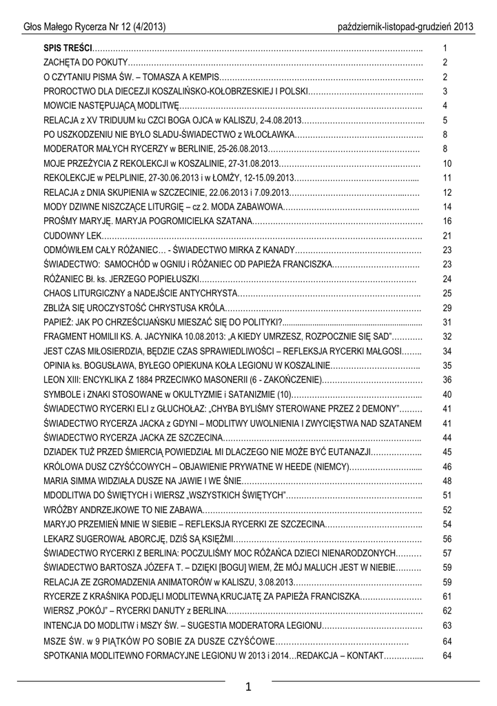 Głos Małego Rycerza Nr 12 (4/2013) październik-listopad-grudzień 2013 SPIS TREŚCI……………………………………………………………………………………………………………….. 1 ZACHĘTA DO POKUTY…………………………………………………………………………………………………… 2 O CZYTANIU PISMA ŚW. – TOMASZA A KEMPIS……………………………………………………………………. 2 PROROCTWO DLA DIECEZJI KOSZALIŃSKO-KOŁOBRZESKIEJ I POLSKI……………………………………... 3 MOWCIE NASTĘPUJĄCĄ MODLITWĘ…………………………………………………………………………………. 4 RELACJA z XV TRIDUUM ku CZCI BOGA OJCA w KALISZU, 2-4.08.2013………………………………………... 5 PO USZKODZENIU NIE BYŁO SLADU-ŚWIADECTWO z WŁOCŁAWKA………………………………………….. 8 MODERATOR MAŁYCH RYCERZY w BERLINIE, 25-26.08.2013……………………………………….…………. 8 MOJE PRZEŻYCIA Z REKOLEKCJI w KOSZALINIE, 27-31.08.2013……………………………………….……… 10 REKOLEKCJE w PELPLINIE, 27-30.06.2013 i w ŁOMŻY, 12-15.09.2013……………………………………….... 11 RELACJA z DNIA SKUPIENIA w SZCZECINIE, 22.06.2013 i 7.09.2013……………………………………...…… 12 MODY DZIWNE NISZCZĄCE LITURGIĘ – cz 2. MODA ZABAWOWA…………………………………………….. 14 PROŚMY MARYJĘ. MARYJA POGROMICIELKA SZATANA………………………………………………………… 16 CUDOWNY LEK……………………………………………………………………………………………………………. 21 ODMÓWIŁEM CAŁY RÓŻANIEC… - ŚWIADECTWO MIRKA Z KANADY…………………………………………. 23 ŚWIADECTWO: SAMOCHÓD w OGNIU i RÓŻANIEC OD PAPIEŻA FRANCISZKA……………………………. 23 RÓŻANIEC Bł. ks. JERZEGO POPIEŁUSZKI………………………………………………………………………… 24 CHAOS LITURGICZNY a NADEJŚCIE ANTYCHRYSTA…………………………………………………………….. 25 ZBLIŻA SIĘ UROCZYSTOŚĆ CHRYSTUSA KRÓLA…………………………………………………………………. 29 PAPIEŻ: JAK PO CHRZEŚCIJAŃSKU MIESZAĆ SIĘ DO POLITYKI?................................................................. 31 FRAGMENT HOMILII KS. A. JACYNIKA 10.08.2013: „A KIEDY UMRZESZ, ROZPOCZNIE SIĘ SAD”………… 32 JEST CZAS MIŁOSIERDZIA, BĘDZIE CZAS SPRAWIEDLIWOŚCI – REFLEKSJA RYCERKI MAŁGOSI…….. 34 OPINIA ks. BOGUSŁAWA, BYŁEGO OPIEKUNA KOŁA LEGIONU W KOSZALINIE…………………………….. 35 LEON XIII: ENCYKLIKA Z 1884 PRZECIWKO MASONERII (6 - ZAKOŃCZENIE)………………………………… 36 SYMBOLE i ZNAKI STOSOWANE w OKULTYZMIE i SATANIZMIE (10)…………………………………………... 40 ŚWIADECTWO RYCERKI ELI z GŁUCHOŁAZ: „CHYBA BYLIŚMY STEROWANE PRZEZ 2 DEMONY”……… 41 ŚWIADECTWO RYCERZA JACKA z GDYNI – MODLITWY UWOLNIENIA I ZWYCIĘSTWA NAD SZATANEM 41 ŚWIADECTWO RYCERZA JACKA ZE SZCZECINA………………………………………………………………….. 44 DZIADEK TUŻ PRZED ŚMIERCIĄ POWIEDZIAŁ MI DLACZEGO NIE MOŻE BYĆ EUTANAZJI……………….. 45 KRÓLOWA DUSZ CZYŚĆCOWYCH – OBJAWIENIE PRYWATNE W HEEDE (NIEMCY)……………………..... 46 MARIA SIMMA WIDZIAŁA DUSZE NA JAWIE I WE ŚNIE……………………………………………………………. 48 MDODLITWA DO ŚWIĘTYCH i WIERSZ „WSZYSTKICH ŚWIĘTYCH”…………………………………………….. 51 WRÓŻBY ANDRZEJKOWE TO NIE ZABAWA…………………………………………………………………………. 52 MARYJO PRZEMIEŃ MNIE W SIEBIE – REFLEKSJA RYCERKI ZE SZCZECINA……………………………….. 54 LEKARZ SUGEROWAŁ ABORCJĘ, DZIŚ SĄ KSIĘŻMI………………………………………………………………. 56 ŚWIADECTWO RYCERKI Z BERLINA: POCZULIŚMY MOC RÓŻAŃCA DZIECI NIENARODZONYCH………. 57 ŚWIADECTWO BARTOSZA JÓZEFA T. – DZIĘKI [BOGU] WIEM, ŻE MÓJ MALUCH JEST W NIEBIE………. 59 RELACJA ZE ZGROMADZENIA ANIMATORÓW w KALISZU, 3.08.2013………………………………………….. 59 RYCERZE Z KRAŚNIKA PODJĘLI MODLITEWNĄ KRUCJATĘ ZA PAPIEŻA FRANCISZKA…………………… 61 WIERSZ „POKÓJ” – RYCERKI DANUTY z BERLINA…………………………………………………………………. 62 INTENCJA DO MODLITW i MSZY ŚW. – SUGESTIA MODERATORA LEGIONU………………………………… 63 MSZE ŚW. w 9 PIĄTKÓW PO SOBIE ZA DUSZE CZYŚĆOWE………………………………………….. 64 SPOTKANIA MODLITEWNO FORMACYJNE LEGIONU W 2013 i 2014…REDAKCJA – KONTAKT………….... 64 1 Głos Małego Rycerza Nr 12 (4/2013) październik-listopad-grudzień 2013 ZACHĘTA DO POKUTY (MADROŚĆ SYRACHA) Nawróć się do Pana, porzuć grzechy, błagaj przed obliczem [Jego], umniejsz zgorszenie! 26 Wróć do Najwyższego, a odwróć się od niesprawiedliwości i miej występek w wielkiej nienawiści! 27 Któż w Szeolu wielbić będzie Najwyższego, zamiast żyjących, którzy mogą oddawać Mu chwałę? 28 Zmarły, jako ten, którego nie ma, nie może składać dziękczynienia, żyjący i zdrowy wychwala Pana11. 29 Jakże wielkie jest miłosierdzie Pana i przebaczenie dla tych, którzy się do Niego nawracają, 30 albowiem ludzie nie wszystko mogą i żaden człowiek nie jest nieśmiertelny. 31 Cóż bardziej świecącego nad słońce? A przecież i ono ulega zaćmieniu; tak też ciało i krew skłania się do złego. 32 On odbywa przegląd sił nieba wysokiego, a wszyscy ludzie są ziemią i prochem. (Syr 17,25-32) 25 TOMASZ A KEMPIS „O CZYTANIU PISMA ŚWIĘTEGO” 1. W Piśmie świętym szukajmy prawdy, a nie stylu. Biblia powinna