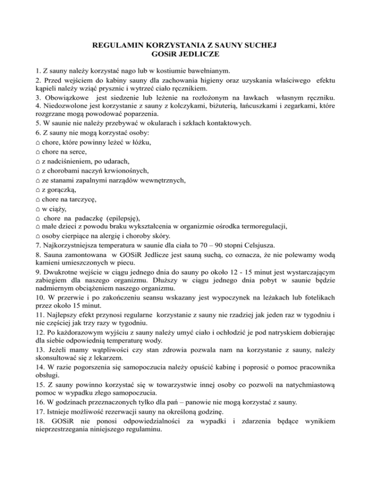 REGULAMIN KORZYSTANIA Z SAUNY SUCHEJ GOSiR JEDLICZE 1. Z sauny należy korzystać nago lub w kostiumie bawełnianym. 2. Przed wejściem do kabiny sauny dla zachowania higieny oraz uzyskania właściwego efektu kąpieli należy wziąć prysznic i wytrzeć ciało ręcznikiem. 3. Obowiązkowe jest siedzenie lub leżenie na rozłożonym na ławkach własnym ręczniku. 4. Niedozwolone jest korzystanie z sauny z kolczykami, biżuterią, łańcuszkami i zegarkami, które rozgrzane mogą powodować poparzenia. 5. W saunie nie należy przebywać w okularach i szkłach kontaktowych. 6. Z sauny nie mogą korzystać osoby: ⌂ chore, które powinny leżeć w łóżku, ⌂ chore na serce, ⌂ z nadciśnieniem, po udarach, ⌂ z chorobami naczyń krwionośnych, ⌂ ze stanami zapalnymi narządów wewnętrznych, ⌂ z gorączką, ⌂ chore na tarczycę, ⌂ w ciąży, ⌂ chore na padaczkę (epilepsję), ⌂ małe dzieci z powodu braku wykształcenia w organizmie ośrodka termoregulacji, ⌂ osoby cierpiące na alergię i choroby skóry. 7. Najkorzystniejsza temperatura w saunie dla ciała to 70 – 90 stopni Celsjusza. 8. Sauna zamontowana w GOSiR Jedlicze jest sauną suchą, co oznacza, że nie polewamy wodą kamieni umieszczonych w piecu. 9. Dwukrotne wejście w ciągu jednego dnia do sauny po około 12 - 15 minut jest wystarczającym zabiegiem dla naszego organizmu. Dłuższy w ciągu jednego dnia pobyt w saunie będzie nadmiernym obciążeniem naszego organizmu. 10. W przerwie i po zakończeniu seansu wskazany jest wypoczynek na leżakach lub fotelikach przez około 15 minut. 11. Najlepszy efekt przynosi regularne korzystanie z sauny nie rzadziej jak jeden raz w tygodniu i nie częściej jak trzy razy w tygodniu. 12. Po każdorazowym wyjściu z sauny należy umyć ciało i ochłodzić je pod natryskiem dobierając dla siebie odpowiednią temperaturę wody. 13. Jeżeli mamy wątpliwości czy stan zdrowia pozwala nam na korzystanie z sauny, należy skonsultować się z lekarzem. 14. W razie pogorszenia się samopoczucia należy opuścić kabinę i poprosić o pomoc pracownika obsługi. 15. Z sauny powinno korzystać się w towarzystwie innej osoby co pozwoli na natychmiastową pomoc w wypadku złego samopoczucia. 16. W godzinach przeznaczonych tylko dla pań – panowie nie mogą korzystać z sauny. 17. Istnieje możliwość rezerwacji sauny na określoną godzinę. 18. GOSiR nie ponosi odpowiedzialności za wypadki i zdarzenia będące wynikiem nieprzestrzegania niniejszego regulaminu.