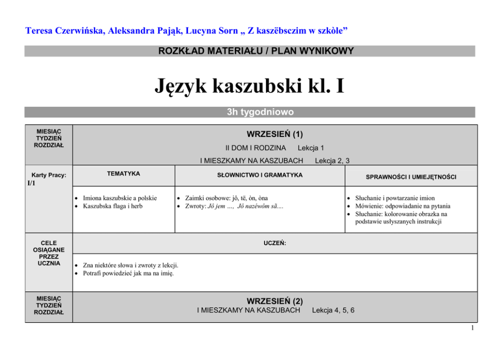 Teresa Czerwińska, Aleksandra Pająk, Lucyna Sorn „ Z kaszëbsczim w szkòle” ROZKŁAD MATERIAŁU / PLAN WYNIKOWY Język kaszubski kl. I 3h tygodniowo MIESIĄC TYDZIEŃ ROZDZIAŁ WRZESIEŃ (1) II DOM I RODZINA Lekcja 1 I MIESZKAMY NA KASZUBACH Karty Pracy: TEMATYKA Lekcja 2, 3 SŁOWNICTWO I GRAMATYKA SPRAWNOŚCI I UMIEJĘTNOŚCI I/1 Imiona kaszubskie a polskie Kaszubska flaga i herb CELE OSIĄGANE PRZEZ UCZNIA MIESIĄC TYDZIEŃ ROZDZIAŁ Zaimki osobowe: jô, të, òn, òna Zwroty: Jô jem …, Jô nazéwôm sã.... Słuchanie i powtarzanie imion Mówienie: odpowiadanie na pytania Słuchanie: kolorowanie obrazka na podstawie usłyszanych instrukcji UCZEŃ: Zna niektóre słowa i zwroty z lekcji. Potrafi powiedzieć jak ma na imię. WRZESIEŃ (2) I MIESZKAMY NA KASZUBACH Lekcja 4, 5, 6 1 Materiał: Legenda Franciszka Sędzickiego Pochodzenie gryfa CELE OSIĄGANE PRZEZ UCZNIA TEMATYKA Pochodzenie gryfa kaszubskiego Spacer po najbliższej okolicy Mówienie: zadawanie pytań i odpowiadanie na nie; wymiana informacji Słuchanie i odpowiadanie na pytania do wysłuchanego tekstu Franciszka Sędzickiego Pochodzenie gryfa Zna niektóre słowa i zwroty z lekcji. Potrafi opowiedzieć legendę. Z pomocą nauczyciela potrafi zadawać pytania, używając podanych wskazówek. Potrafi odpowiedzieć na pytania dotyczące swojej miejscowości. WRZESIEŃ (3) I MIESZKAMY NA KASZUBACH MATERIAŁ CELE OSIĄGANE PRZEZ UCZNIA Powtórzenie materiału gramatycznego. Zwroty: Òn je czôrny, òn je ... SPRAWNOŚCI I UMIEJĘTNOŚCI UCZEŃ: MIESIĄC TYDZIEŃ ROZDZIAŁ Legendy związane z historią swojej miejscowości SŁOWNICTWO I GRAMATYKA TEMATYKA Historia mojej miejscowości Moja miejscowość – praca plastyczna SŁOWNICTWO I GRAMATYKA Powtórzenie materiału gramatycznego. Zwroty – powtórzenie. Zwroty: Jô mieszkóm w ... Lekcja 7, 8, 9 SPRAWNOŚCI I UMIEJĘTNOŚCI Słuchanie: ustalanie kolejności zdarzeń w wysłuchanej legendzie Mówienie: odpowiadanie na pytania UCZEŃ: Opanował podstawowe słowa i zwroty z lekcji 1-6 Używa zwrotu: Jô mieszkóm w ... Potrafi opowiedzieć w kilku prostych zdaniach historię swojej miejscowości Wybraną legendę przedstawia w formie pracy plastycznej. 2 MIESIĄC TYDZIEŃ ROZDZIAŁ WRZESIEŃ (4) V PRZYRODA MATERIAŁ Karty Pracy: V/16 V/17 Wycieczka CELE OSIĄGANE PRZEZ UCZNIA SŁOWNICTWO I GRAMATYKA TEMATYKA Rozróżnianie grzybów: grzyby jadalne i trujące Wycieczka do lasu Odliczanka: Jeden, dwa – pòj le sa Rzeczowniki Liczebniki główne: 1 -10 Zwroty: To je ... SPRAWNOŚCI I UMIEJĘTNOŚCI Słuchanie: przyporządkowywanie pojęć Mówienie: odpowiadanie na pytania Słuchanie: wyszukiwanie informacji, wybór prawidłowego obrazka i podpisu do niego Pisanie: przyporządkowywanie nazw grzybów odpowiednim ilustracjom UCZEŃ: Opanował podstawowe słowa i zwroty z lekcji. Podaje nazwy poznanych grzybów. Opanował na pamięć odliczankę: Jeden, dwa – pòj le sa. Przy pomocy nauczyciela liczy do 10. MIESIĄC TYDZIEŃ ROZDZIAŁ MATERIAŁ Lekcja 10, 11, 12 PAŹDZIERNIK (1) V PRZYRODA SŁOWNICTWO I GRAMATYKA TEMATYKA Karty Pracy: Pory roku V/8 Kolory jesieni V/9 Warzywa i owoce V/10 V/13a V/13b V/13c LEKCJA 13, 14, 15 Rzeczowniki – nazwy warzyw i owoców Przymiotniki – określenia barw: biôłi, zelony ... Utrwalanie liczebników Zwroty – powtórzenie Stosowanie rzeczowników i przymiotników SPRAWNOŚCI I UMIEJĘTNOŚCI Słuchanie: przyporządkowywanie pojęć Mówienie: odpowiadanie na pytania, powtarzanie nazw owoców, warzyw Pisanie: wyszukiwanie ukrytych wyrazów 3 CELE OSIĄGANE PRZEZ UCZNIA UCZEŃ: Opanował podstawowe słowa i zwroty z lekcji. Stosuje przymiotniki poznane podczas lekcji. Umie wymienić poszczególne pory roku i przyporządkować im odpowiednie kolory. Odpowiada na pytanie : Co to je? MIESIĄC TYDZIEŃ ROZDZIAŁ PAŹDZIERNIK (2) V PRZYRODA MATERIAŁ CELE OSIĄGANE PRZEZ UCZNIA MIESIĄC TYDZIEŃ ROZDZIAŁ SŁOWNICTWO I GRAMATYKA TEMATYKA Karty Pracy: W ogrodzie – warzywa V/11 W sadzie - owoce V/12 LEKCJA 16, 17, 18 SPRAWNOŚCI I UMIEJĘTNOŚCI Przymiotniki: môłô, wiôlgô Przymiotniki: biôłô, zelonô ... Utrwalanie liczebników. Zwroty – powtórzenie Stosowanie rzeczowników i przymiotników w liczbie pojedynczej i mnogiej Słuchanie: wybór właściwego obrazka Mówienie: odpowiadanie na pytania Słuchanie / Czytanie: powtarzanie nowych słów, uzupełnianie zdań, przyporządkowywanie podpisów do odpowiednich ilustracji UCZEŃ: Opanował podstawowe słowa i zwroty z lekcji. Stosuje przymiotniki poznane podczas lekcji. Umie stworzyć zbiory warzyw i owoców – ògardowizna, brzôd. Odpowiada na pytanie : Co to je? PAŹDZIERNIK (3) I MIESZKAMY NA KASZUBACH LEKCJA 19, 20, 21 4 MATERIAŁ TEMATYKA Karty Pracy: Kaszubskie nuty – obrazkowa I/2 budowa Nauka śpiewania Pomysł na kaszubskie nuty CELE OSIĄGANE PRZEZ UCZNIA Przymiotniki – konstrukcja To je krótczi, to je dłudżi ... Zwroty: To je ... Zabawa językiem – wielokrotne powtarzanie poznanych słów SPRAWNOŚCI I UMIEJĘTNOŚCI Słuchanie: rozumienie sensu ogólnego oraz wybór właściwego obrazka Mówienie: śpiewanie Kaszubskich nut Mówienie: odpowiadanie na pytania Co to je? To je... Słuchanie / Czytanie: powtarzanie nowych słów, uzupełnianie zdań, przyporządkowywanie podpisów do odpowiednich ilustracji UCZEŃ: Opanował podstawowe słowa i zwroty z lekcji. Odpowiada na pytanie : Co to je? Umie razem z grupą zaśpiewać Kaszubskie nuty. Stosuje przymiotniki poznane podczas lekcji. Wykorzystując zdobytą wiedzę tworzy w formie pracy plastycznej Kaszubskie nuty według własnego pomysłu. MIESIĄC TYDZIEŃ ROZDZIAŁ MATERIAŁ SŁOWNICTWO I GRAMATYKA PAŹDZIERNIK (4) II DOM I RODZINA TEMATYKA Karty Pracy: Moja rodzina II/1 Drzewo genealogiczne II/2 LEKCJA 22, 23, 24 SŁOWNICTWO I GRAMATYKA Zaimki osobowe – utrwalenie Zaimki dzierżawcze: mòja, mój, twòja, twój. Zwroty: To je mòja ..., To je twòja... SPRAWNOŚCI I UMIEJĘTNOŚCI Mówienie: odpo