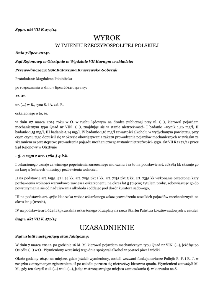 Sygn. akt VII K 471/14 WYROK W IMIENIU RZECZYPOSPOLITEJ POLSKIEJ Dnia 7 lipca 2014r. Sąd Rejonowy w Olsztynie w Wydziale VII Karnym w składzie: Przewodniczący: SSR Katarzyna Kruszewska-Sobczyk Protokolant: Magdalena Połubińska po rozpoznaniu w dniu 7 lipca 2014r. sprawy: M. M. ur. (...) w B., syna S. i A. z d. R. oskarżonego o to, że: w dniu 07 marca 2014 roku w O. w ruchu lądowym na drodze publicznej przy ul. (...), kierował pojazdem mechanicznym typu Quad nr VIN (...), znajdując się w stanie nietrzeźwości- I badanie –wynik 1,26 mg/l, II badanie-1,15 mg/l, III badanie-1,14 mg/l, IV badanie-1,16 mg/l zawartości alkoholu w wydychanym powietrzu, przy czym czynu tego dopuścił się w okresie obowiązywania zakazu prowadzenia pojazdów mechanicznych w związku ze skazaniem za przestępstwo prowadzenia pojazdu mechanicznego w stanie nietrzeźwości- sygn. akt VII K 1272/12 przez Sąd Rejonowy w Olsztynie - tj. o czyn z art. 178a § 4 k.k. I oskarżonego uznaje za winnego popełnienia zarzucanego mu czynu i za to na podstawie art. 178a§4 kk skazuje go na karę 4 (czterech) miesięcy pozbawienia wolności, II na podstawie art. 69§1, §2 i §4 kk, art. 70§1 pkt 1 kk, art. 72§1 pkt 5 kk, art. 73§1 kk wykonanie orzeczonej kary pozbawienia wolności warunkowo zawiesza oskarżonemu na okres lat 5 (pięciu) tytułem próby, zobowiązując go do powstrzymania się od nadużywania alkoholu i oddając pod dozór kuratora sądowego, III na podstawie art. 42§2 kk orzeka wobec oskarżonego zakaz prowadzenia wszelkich pojazdów mechanicznych na okres lat 3 (trzech), IV na podstawie art. 624§1 kpk zwalnia oskarżonego od zapłaty na rzecz Skarbu Państwa kosztów sadowych w całości. Sygn. akt VII K 471/14 UZASADNIENIE Sąd ustalił następujący stan faktyczny: W dniu 7 marca 2014r. po godzinie 16 M. M. kierował pojazdem mechanicznym typu Quad nr VIN (...), jeżdżąc po Osiedlu (...) w O.. Wymieniony wcześniej tego dnia spożywał alkohol w postaci piwa i wódki. Około godziny 16:40 na miejsce, gdzie jeździł wymieniony, zostali wezwani funkcjonariusze Policji: P. P. i R. J. w związku z otrzymanym zgłoszeniem, iż po osiedlu porusza się nietrzeźwy kierowca quada. Wymienieni zauważyli M. M., gdy ten skręcił z ul. (...) w ul. (...), jadąc w stronę swojego miejsca zamieszkania tj. w kierunku na S.. Funkcjonariusze kilkakrotnie użyli sygnałów dźwiękowych i świetlnych, wzywając wymienionego do zatrzymania się, na co on nie reagował, zatrzymując się dopiero po przejechaniu około 300-400 metrów, na wysokości parkingu przy ogródkach działkowych. Funkcjonariusze podeszli do niego i przystąpili do przeprowadzenia kontroli drogowej. M. M. twierdził, iż nie może zgasić silnika w pojeździe, więc silnik ten zgasił P. P.. Na miejsce wezwano też patrol ruchu drogowego z K. w O.. M. M. został poddany dwukrotnemu badaniu na urządzeniu typu A.. Pierwsze badanie przeprowadzone o godz. 17:03 wykazało u niego 1,26 mg/l alkoholu w wydychanym powietrzu, kolejne o godzinie 17:18 – 1,15 mg/l alkoholu w wydychanym powietrzu. Następne badania przeprowadzone urządzeniem (...) (...) nr (...) o godzinie 18:12 i 18:14 wykazały u wymienionego odpowiednio 1,14 i 1,16 mg/l alkoholu w wydychanym powietrzu. Wyrokiem Rejonowego w Olsztynie z dnia 11 grudnia 2012r. w sprawie VII K 127212 M. M. został skazany m.in. za czyn z art. 178a§4 kk na karę łączną 1 roku i 2 miesięcy pozbawienia wolności z warunkowym zawieszeniem jej wykonania na okres lat 2 tytułem próby oraz orzeczono wobec niego na podstawie art. 42§2 kk zakaz prowadzenia wszelkich pojazdów mechanicznych na okres lat 2, który to wyrok uprawomocnił się w dniu 19 grudnia 2012r. (dowód: częściowo wyjaśnienia M. M. k:15-16, 65v, protokoły użycia urządzenia kontrolno-pomiarowego do ilościowego oznaczania alkoholu w wydychanym powietrzu k.3,4, odpis wyroku w sprawie VII K 1272/12 k: 46, zeznania P. P. k: 9v-10, 31v, R. J. k: 32v-33). Oskarżony M. M. zarówno w toku postępowania przygotowawczego, jak i w czasie rozprawy przyznał się do popełnienia zarzuconego mu czynu. W postępowaniu przygotowawczym wyjaśnił, iż w dniu 7 marca 2014r. około godz. 15 naprawiał quada swojego syna. Syn chciał się nim przejechać. Zgodził się. Syn pojechał polną ścieżką w stronę ogrodów działkowych. W pewnym momencie coś zaczęło rzęzić w silniku. Wtedy oskarżony zaczął prowadzić quada. Zadzwonił do konkubiny, aby zabrała syna. W międzyczasie spotkał znajomych, z którymi wypił piwo i we trójkę wypili pół litra wódki. Na ul. (...) czekał na kolegów, którzy poszli do sklepu. Długo nie wracali, a konkubina chciała żeby wrócił. Wsiadł na quada, nie odpalając silnika i zjeżdżał nim z górki, Na dole zatrzymała go Policja. W czasie rozprawy oskarżony również przyznał się do popełnienia zarzucanego mu czynu. Potwierdził dotychczasowe wyjaśnienia. Dodatkowo podał, iż bardzo żałuje tego czynu. Podał, iż w domu mieli tragedię, zmarła mu córka. Teraz podjął terapię w związku z uzależnieniem od alkoholu i przemocy w rodzinie, która trwa już 5 miesiąc. Teraz w ogóle nie pije. Na utrzymaniu ma dwoje dzieci, zamierzają też adoptować trzecie dziecko, postępowanie w sądzie rodzinnym jest w toku. To córka siostry żony. Ta dziewczynka mieszka z nimi już jakiś czas, była wychowywana bez ojca, a jej matka pije. On jest jedynym żywicielem rodziny. (wyjaśnienia oskarżonego k: 15-16, 65v). Sąd zważył, co następuje: W ocenie Sądu wyjaśnienia oskarżonego, w których przyznał się do popełnienia zarzucanego mu czynu co do zasady zasługiwały na wiarę, korespondując z pozostałym zgromadzonym w sprawie materiałem dowodowym, w szczególności w postaci zeznań P. P. i R. J. oraz protokołami użycia urządzenia kontrolno-pomiarowego do ilościowego oznaczenia alkoholu w wydychanym powietrzu. Sąd odmówił natomiast wiarygodności tej części 