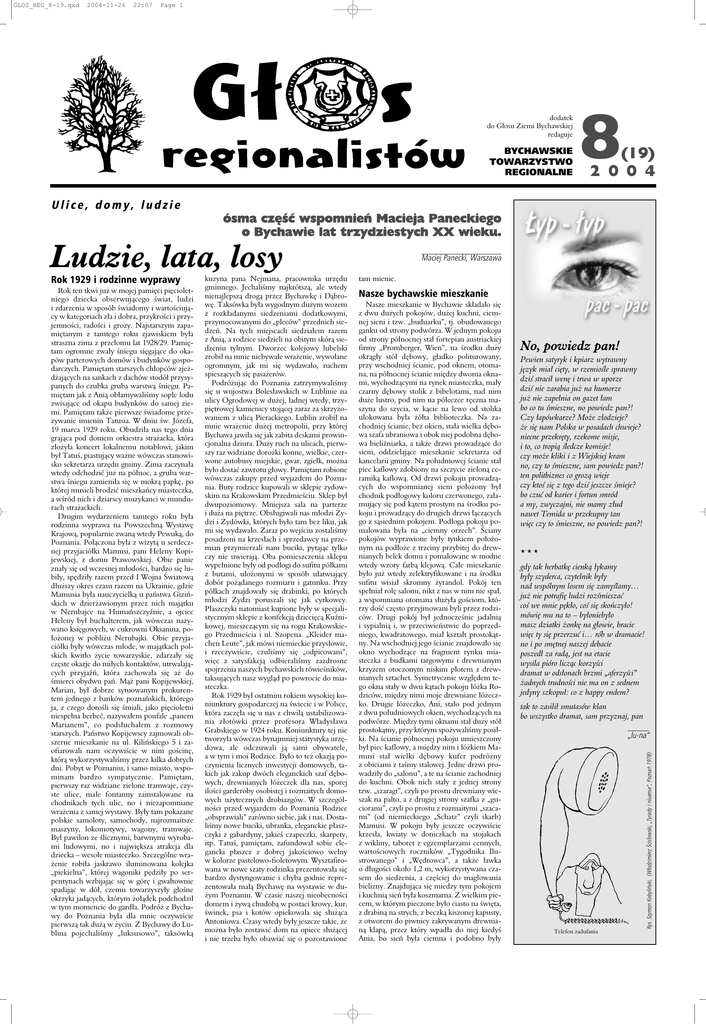 GLOS_REG_8-19.qxd 2004-11-26 22:07 Page 1 dodatek do Głosu Ziemi Bychawskiej redaguje BYCHAWSKIE TOWARZYSTWO REGIONALNE 8 (19) 2 0 0 4 Ulice, domy, ludzie ósma część wspomnień Macieja Paneckiego o Bychawie lat trzydziestych XX wieku. Ludzie, lata, losy Rok ten tkwi już w mojej pamięci pięcioletniego dziecka obserwującego świat, ludzi i zdarzenia w sposób świadomy i wartościujący w kategoriach zła i dobra, przykrości i przyjemności, radości i grozy. Najstarszym zapamiętanym z tamtego roku zjawiskiem była straszna zima z przełomu lat 1928/29. Pamiętam ogromne zwały śniegu sięgające do okapów parterowych domów i budynków gospodarczych. Pamiętam starszych chłopców zjeżdżających na sankach z dachów stodół przysypanych do czubka gruba warstwą śniegu. Pamiętam jak z Anią obłamywaliśmy sople lodu zwisające od okapu budynków do samej ziemi. Pamiętam także pierwsze świadome przeżywanie imienin Tatusia. W dniu św. Józefa, 19 marca 1929 roku. Obudziła nas tego dnia grająca pod domem orkiestra strażacka, która złożyła koncert lokalnemu notablowi, jakim był Tatuś, piastujący ważne wówczas stanowisko sekretarza urzędu gminy. Zima zaczynała wtedy odchodzić już na północ, a gruba warstwa śniegu zamieniła się w mokrą papkę, po której musieli brodzić mieszkańcy miasteczka, a wśród nich i dziarscy muzykanci w mundurach strażackich. Drugim wydarzeniem tamtego roku była rodzinna wyprawa na Powszechną Wystawę Krajową, popularnie zwaną wtedy Pewuką, do Poznania. Połączona była z wizytą u serdecznej przyjaciółki Mamusi, pani Heleny Kopijewskiej, z domu Prawowskiej. Obie panie znały się od wczesnej młodości, bardzo się lubiły, spędziły razem przed I Wojna Światową dłuższy okres czasu razem na Ukrainie, gdzie Mamusia była nauczycielką u państwa Gizińskich w dzierżawionym przez nich majątku w Nerubajce na Humańszczyźnie, a ojciec Heleny był buchalterem, jak wówczas nazywano księgowych, w cukrowni Oksanina, położonej w pobliżu Nerubajki. Obie przyjaciółki były wówczas młode, w majątkach polskich kwitło życie towarzyskie, zdarzały się częste okazje do miłych kontaktów, utrwalających przyjaźń, która zachowała się aż do śmierci obydwu pań. Mąż pani Kopijewskiej, Marian, był dobrze sytuowanym prokurentem jednego z banków poznańskich, którego ja, z czego dorośli się śmiali, jako pięcioletni niespełna berbeć, nazywałem poufale „panem Marianem”, co podsłuchałem z rozmowy starszych. Państwo Kopijewscy zajmowali obszerne mieszkanie na ul. Kilińskiego 5 i zaofiarowali nam oczywiście w nim gościnę, którą wykorzystywaliśmy przez kilka dobrych dni. Pobyt w Poznaniu, i samo miasto, wspominam bardzo sympatycznie. Pamiętam, pierwszy raz widziane zielone tramwaje, czyste ulice, małe fontanny zainstalowane na chodnikach tych ulic, no i niezapomniane wrażenia z samej wystawy. Były tam pokazane polskie samoloty, samochody, najrozmaitsze maszyny, lokomotywy, wagony, tramwaje. Był pawilon ze ślicznymi, barwnymi wyrobami ludowymi, no i największa atrakcja dla dziecka – wesołe miasteczko. Szczególne wrażenie robiła jaskrawo iluminowana kolejka „piekielna”, której wagoniki pędziły po serpentynach wzbijając się w górę i gwałtownie spadając w dół, czemu towarzyszyły głośne okrzyki jadących, którym żołądek podchodził w tym momencie do gardła. Podróż z Bychawy do Poznania była dla mnie oczywiście pierwszą tak dużą w życiu. Z Bychawy do Lublina pojechaliśmy „luksusowo”, taksówką kuzyna pana Nejmana, pracownika urzędu gminnego. Jechaliśmy najkrótszą, ale wtedy nienajlepszą drogą przez Bychawkę i Dąbrowę. Taksówka była wygodnym dużym wozem z rozkładanymi siedzeniami dodatkowymi, przymocowanymi do „pleców” przednich siedzeń. Na tych miejscach siedziałem razem z Anią, a rodzice siedzieli na obitym skórą siedzeniu tylnym. Dworzec kolejowy lubelski zrobił na mnie niebywałe wrażenie, wywołane ogromnym, jak mi się wydawało, ruchem spieszących się pasażerów. Podróżując do Poznania zatrzymywaliśmy się u wujostwa Bolesławskich w Lublinie na ulicy Ogrodowej w dużej, ładnej wtedy, trzypiętrowej kamienicy stojącej zaraz za skrzyżowaniem z ulicą Pierackiego. Lublin zrobił na mnie wrażenie dużej metropolii, przy której Bychawa jawiła się jak zabita deskami prowincjonalna dziura. Duży ruch na ulicach, pierwszy raz widziane dorożki konne, wielkie, czerwone autobusy miejskie, gwar, zgiełk, można było dostać zawrotu głowy. Pamiętam robione wówczas zakupy przed wyjazdem do Poznania. Buty rodzice kupowali w sklepie żydowskim na Krakowskim Przedmieściu. Sklep był dwupoziomowy. Mniejsza sala na parterze i duża na piętrze. Obsługiwali nas młodzi Żydzi i Żydówki, których było tam bez liku, jak mi się wydawało. Zaraz po wejściu zostaliśmy posadzeni na krzesłach i sprzedawcy na przemian przymierzali nam buciki, pytając tylko czy nie uwierają. Oba pomieszczenia sklepu wypełnione były od podłogi do sufitu półkami z butami, ułożonymi w sposób ułatwiający dobór pożądanego rozmiaru i gatunku. Przy półkach znajdowały się drabinki, po których młodzi Żydzi poruszali się jak cyrkowcy. Płaszczyki natomiast kupione były w specjalistycznym sklepie z konfekcją dziecięcą Kuźnikowej, mieszczącym się na rogu Krakowskiego Przedmieścia i ul. Szopena. „Kleider machen Leute”, jak mówi niemieckie przysłowie, i rzeczywiście, czuliśmy się „odpicowani”, więc z satysfakcją odbieraliśmy zazdrosne spojrzenia naszych bychawskich rówieśników, taksujących nasz wygląd po powrocie do miasteczka. Rok 1929 był ostatnim rokiem wysokiej koniunktury gospodarczej na świecie i w Polsce, która zaczęła się u nas z chwilą ustabilizowania złotówki przez profesora Władysława Grabskiego w 1924 roku. Koniunktury tej nie tworzyła wówczas bynajmniej statystyka u