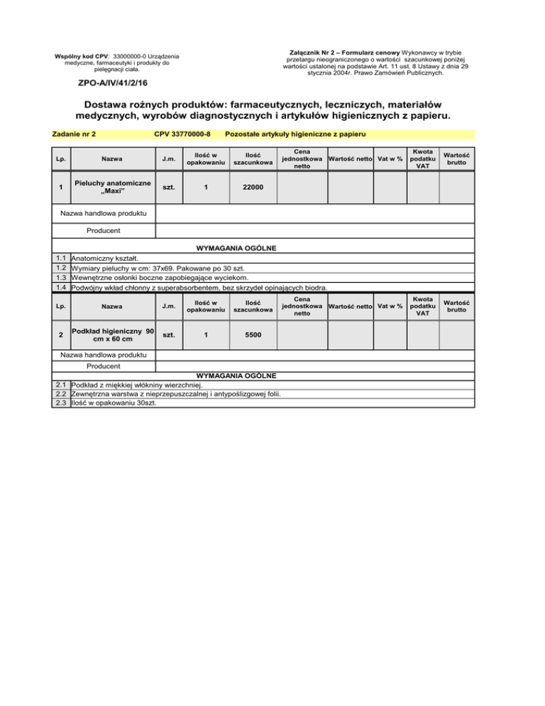 Załącznik Nr 2 – Formularz cenowy Wykonawcy w trybie przetargu nieograniczonego o wartości szacunkowej poniżej wartości ustalonej na podstawie Art. 11 ust. 8 Ustawy z dnia 29 stycznia 2004r. Prawo Zamówień Publicznych. Wspólny kod CPV: 33000000-0 Urządzenia medyczne, farmaceutyki i produkty do pielęgnacji ciała. ZPO-A/IV/41/2/16 Dostawa rożnych produktów: farmaceutycznych, leczniczych, materiałów medycznych, wyrobów diagnostycznych i artykułów higienicznych z papieru. Zadanie nr 2 CPV 33770000-8 Pozostałe artykuły higieniczne z papieru Lp. Nazwa J.m. Ilość w opakowaniu Ilość szacunkowa 1 Pieluchy anatomiczne „Maxi” szt. 1 22000 Cena jednostkowa Wartość netto Vat w % netto Kwota podatku VAT Wartość brutto Kwota podatku VAT Wartość brutto Nazwa handlowa produktu Producent 1.1 1.2 1.3 1.4 WYMAGANIA OGÓLNE Anatomiczny kształt. Wymiary pieluchy w cm: 37x69. Pakowane po 30 szt. Wewnętrzne osłonki boczne zapobiegające wyciekom. Podwójny wkład chłonny z superabsorbentem, bez skrzydeł opinających biodra. Lp. Nazwa J.m. Ilość w opakowaniu Ilość szacunkowa 2 Podkład higieniczny 90 cm x 60 cm szt. 1 5500 Nazwa handlowa produktu Producent WYMAGANIA OGÓLNE 2.1 Podkład z miękkiej włókniny wierzchniej. 2.2 Zewnętrzna warstwa z nieprzepuszczalnej i antypoślizgowej folii. 2.3 Ilość w opakowaniu 30szt. Cena jednostkowa Wartość netto Vat w % netto