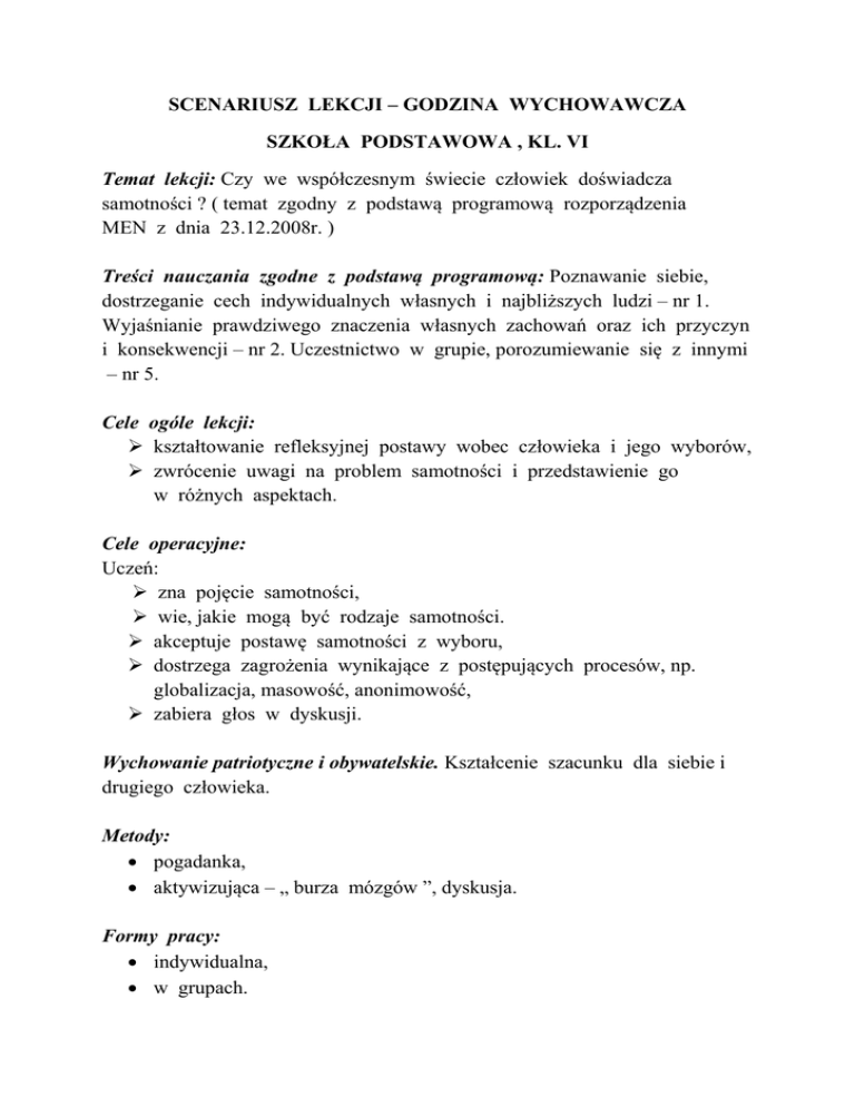 SCENARIUSZ LEKCJI – GODZINA WYCHOWAWCZA SZKOŁA PODSTAWOWA , KL. VI Temat lekcji: Czy we współczesnym świecie człowiek doświadcza samotności ? ( temat zgodny z podstawą programową rozporządzenia MEN z dnia 23.12.2008r. ) Treści nauczania zgodne z podstawą programową: Poznawanie siebie, dostrzeganie cech indywidualnych własnych i najbliższych ludzi – nr 1. Wyjaśnianie prawdziwego znaczenia własnych zachowań oraz ich przyczyn i konsekwencji – nr 2. Uczestnictwo w grupie, porozumiewanie się z innymi – nr 5. Cele ogóle lekcji: kształtowanie refleksyjnej postawy wobec człowieka i jego wyborów, zwrócenie uwagi na problem samotności i przedstawienie go w różnych aspektach. Cele operacyjne: Uczeń: zna pojęcie samotności, wie, jakie mogą być rodzaje samotności. akceptuje postawę samotności z wyboru, dostrzega zagrożenia wynikające z postępujących procesów, np. globalizacja, masowość, anonimowość, zabiera głos w dyskusji. Wychowanie patriotyczne i obywatelskie. Kształcenie szacunku dla siebie i drugiego człowieka. Metody: pogadanka, aktywizująca – „ burza mózgów ”, dyskusja. Formy pracy: indywidualna, w grupach. Pomoce dydaktyczne: „ Słownik synonimów ”, ilustracje przedstawiające problem, karty pracy do indywidualnych ćwiczeń. Uwagi: temat lekcji na godzinie wychowawczej została dopasowany do podstawy programowej z etyki dla II etapu kształcenia klas IV-VI. Przebieg lekcji: 1.Wprowadzenie Po zapoznaniu uczniów z tematem lekcji następują pytania, które mają pobudzić uczniów do dyskusji, np. Czym jest samotność ? Czy często jesteście samotni ? Czym spowodowana jest wasza samotność ? Czy lubicie być samotni ? Czy próbujecie walczyć z samotnością ? Jeśli tak, w jaki sposób ? Czy samotność oznacza zawsze ten sam stan ? Czy zauważacie wokół siebie ludzi samotnych ? Uczniowie podają wyrazy bliskoznaczne do wyrazu samotność. samotność odseparowanie odłączenie odosobnienie izolacja 2.Praca w grupach. Podział klasy na cztery grupy. Każda z grup otrzymuje ilustrację przedstawiającą samotność w różnych aspektach: a) Uczeń w nowej szkole, na szkolnym korytarzu, wśród wielu roześmianych rówieśników. Ilustracja ma sugerować uczniom problem samotności w tłumie. b) Smutny człowiek siedzący na krześle, trzymający w dłoniach zdjęcie matki. Ilustracja ma sugerować uczniom istotę, która czuje się osamotniona, opuszczona. c) Samotna postać siedząca nad jeziorem i łowiąca ryby. Ilustracja ma sugerować samotność z wyboru. d) Staruszek i drzewo na tle wielkiego miasta. Ilustracja sugeruje samotność w wielkomiejskiej „dżungli”. Dodatkowo każda z grup otrzymuje polecenie, aby napisać o tym, jakie odczucia mogą towarzyszyć przedstawionej sytuacji. 3.Poszczególne grupy przedstawiają omówienie ilustracji. Nauczyciel zadaje pomocnicze pytania, aby wywołać dyskusję. Grupa I Samotność w tłumie Czy może być spowodowana samotność w tłumie ? Jakie uczucia towarzyszą wówczas człowiekowi, który tego doświadcza ? Jak można sobie poradzić z tego typu samotnością ? Grupa II Osamotnienie W jakich sytuacjach człowiek może czuć się samotny ? Jakie uczucia towarzyszą osamotnieniu ? Czy można pomóc takim ludziom ? Grupa III Samotność z wyboru Czy można ingerować w życie człowieka – samotnika ? Czy taka samotność jest nam potrzebna ? Kiedy mamy potrzebę bycia samotnym ( samym ) ? Grupa IV Samotność w wielkomiejskiej „ dżungli ” Czym się przejawia taka samotność ? ( zagubienie, niezaradność ?) Kto może odczuwać taką samotność ? 4.Podsumowanie. Czy samotność jest uczuciem, które towarzyszy każdemu człowiekowi ? Czy zawsze jest to odczucie negatywne ? Jak można radzić sobie z samotnością/osamotnieniem ? Samotność to uczucie, które towarzyszy każdemu człowiekowi. Czasem może mieć ono pozytywny wpływ na człowieka, np. chwila refleksji, aby podjąć właściwą decyzję. Bądź pozytywnie nastawiony do świata, znajdź sobie hobby, rozwijaj swoje zainteresowania, staraj się rozmawiać częściej z rodzicami. Ćwiczenie indywidualne , pobudzające do autorefleksji. Dokończ zdania: „ Ostatnio czułem się samotny, gdy …………………….” „ Lubię być sam, gdy ………………………”.