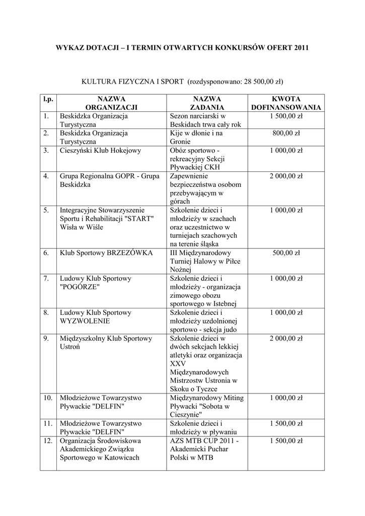 WYKAZ DOTACJI – I TERMIN OTWARTYCH KONKURSÓW OFERT 2011 KULTURA FIZYCZNA I SPORT (rozdysponowano: 28 500,00 zł) l.p. 1. 2. 3. NAZWA ORGANIZACJI Beskidzka Organizacja Turystyczna Beskidzka Organizacja Turystyczna Cieszyński Klub Hokejowy 4. Grupa Regionalna GOPR - Grupa Beskidzka 5. Integracyjne Stowarzyszenie Sportu i Rehabilitacji "START" Wisła w Wiśle 6. Klub Sportowy BRZEZÓWKA 7. Ludowy Klub Sportowy "POGÓRZE" 8. Ludowy Klub Sportowy WYZWOLENIE 9. Międzyszkolny Klub Sportowy Ustroń 10. Młodzieżowe Towarzystwo Pływackie "DELFIN" 11. Młodzieżowe Towarzystwo Pływackie "DELFIN" 12. Organizacja Środowiskowa Akademickiego Związku Sportowego w Katowicach NAZWA ZADANIA Sezon narciarski w Beskidach trwa cały rok Kije w dłonie i na Gronie Obóz sportowo rekreacyjny Sekcji Pływackiej CKH Zapewnienie bezpieczeństwa osobom przebywającym w górach Szkolenie dzieci i młodzieży w szachach oraz uczestnictwo w turniejach szachowych na terenie śląska III Międzynarodowy Turniej Halowy w Piłce Nożnej Szkolenie dzieci i młodzieży - organizacja zimowego obozu sportowego w Istebnej Szkolenie dzieci i młodzieży uzdolnionej sportowo - sekcja judo Szkolenie dzieci w dwóch sekcjach lekkiej atletyki oraz organizacja XXV Międzynarodowych Mistrzostw Ustronia w Skoku o Tyczce Międzynarodowy Miting Pływacki "Sobota w Cieszynie" Szkolenie dzieci i młodzieży w pływaniu AZS MTB CUP 2011 Akademicki Puchar Polski w MTB KWOTA DOFINANSOWANIA 1 500,00 zł 800,00 zł 1 000,00 zł 2 000,00 zł 1 000,00 zł 500,00 zł 1 000,00 zł 1 000,00 zł 2 000,00 zł 1 000,00 zł 1 500,00 zł 1 500,00 zł 13. Stowarzyszenie "Dziedzictwo" św. VII Zimowa Spartakiada Jana Sarkandra w Cieszynie Katolickiego Liceum Ogólnokształcącego im. Św. Melchiora Grodzieckiego w Cieszynie 14. Stowarzyszenie na rzecz "ZŁOTA RYBKA" Harmonijnego Rozwoju Dzieci i Młodzieży "NASZE DZIECI" 15. Stowarzyszenie na Rzecz Wspierania Rozwoju Zespołu Szkół Gastronomiczno Hotelarskich "Teraz Patelniok" 16. Stowarzyszenie Promocji i Rozwoju Ustronia 17. Stowarzyszenie Rehabilitacji Kultury Fizycznej Turystyki i Integracji Osób Niepełnosprawnych w Cieszynie 18. Stowarzyszenie Rehabilitacji Kultury Fizycznej Turystyki i Integracji Osób Niepełnosprawnych w Cieszynie 19. Stowarzyszenie Rehabilitacji Kultury Fizycznej Turystyki i Integracji Osób Niepełnosprawnych w Cieszynie 20. Szkolne Forum Inicjatyw "Ogólniak" 21. Towarzystwo Sportowe "MIESZKO-PIAST" 22. Uczniowski Gminny Klub Sportowy "Sokół" 23. Uczniowski Klub Sportowy Brenna - Górki 800,00 zł 1 000,00 zł Szkolne zawody pływackie z okazji pierwszego dnia wiosny 400,00 zł Ustrońska Szkoła Narciarstwa Biegowego Cykl imprez sportowo rekreacyjnych osób niepełnosprawnych (Zawody Zimowe Os. N, Zawody Strzeleckie Os.N, Międzynarodowy Turniej Tenisa Stołowego Os. N) Zajęcia na basenie z osobami niepełnosprawnymi 2 000,00 zł XX Międzynarodowa Spartakiada Osób Niepełnosprawnych o Puchar Ziemi Cieszyńskiej Otwarte Mistrzostwa Liceum w Narciarstwie Alpejskim i Snowboardzie Organizacja Międzynarodowych Turniejów Żaków, Trampkarzy i Juniorów Powiatowa Olimpiada Młodzieży MiniOlimpik Zebrzydowice 2011 Szkolenie sportowe i doskonalenie umiejętności dzieci i młodzieży 2 000,00 zł 2 000,00 zł 1 700,00 zł 1 000,00 zł 800,00 zł 1 000,00 zł 1 000,00 zł KULTURA (rozdysponowano: 12 300,00 zł) l.p. 1. NAZWA ORGANIZACJI Fundacja Kultury Audiowizualnej STREFA SZAREJ 2. Fundacji im. Zofii Kossak w Górkach Wielkich 3. Macierz Ziemi Cieszyńskiej Towarzystwo Miłośników Regionu Stowarzyszenie "Grupa Twórców Wiślanie" w Wiśle 4. 5. 6. Stowarzyszenie AMICUS COPERNICUS Stowarzyszenie AMICUS COPERNICUS 7. Stowarzyszenie Animacji Kultury i Sportu "Anima Pro Activ" 8. Stowarzyszenie Cieszyńskiej Młodzieży Twórczej 9. Stowarzyszenie Miłośników Beskidzkiego Folkloru Muzyki Tańca i Śpiewu "Pod Ochodzitą" 10. Stowarzyszenie na rzecz Wspierania Rodziny "Siloe in Nobis" 11. Stowarzyszenie "Wszechnica" NAZWA ZADANIA Internetowy Portal Informacyjny Organizacji Pozarządowych ngo.cieszyn.pl Panel dyskusyjny "Zofia Kossak prawa i sprawiedliwa?" VII Przegląd Kapel Karpackich oraz Koncert Kolęd Organizacja obchodów jubileuszowych 20-lecia stowarzyszenia "Grupa Twórców Wiślanie" Razem możemy więcej KWOTA DOFINANSOWANIA 1 000,00 zł III Festiwal Kultury Śląska Cieszyńskiego U ŹRÓDEŁ OLZY GÓROLSKO MUZYKA I OBYCZAJE Cieszyńska Rewialacja 1 000, 00 zł Latająca Akademia Sztuk VII Powiatowy Konkurs Recytatorski dla Gimnazjów Nagranie audiowizulane - Przedstawienie Promujące Tradycję i Kulturę Regionu Śląska Cieszyńskiego "Zabawy folklorem kiszyni kapusty" 1 000,00 zł Wydanie publikacji książkowej i przeprowadzenie prelekcji pod tytułem: "Martyrologium mieszkańców Śląska Cieszyńskiego - Słownik biograficzny" 1 000,00 zł 1 000,00 zł 800,00 zł 1 000,00 zł 1 000,00 zł 1 000,00 zł 1 000,00 zł 500,00 zł 12. Szkolne Forum Inicjatyw "Ogólniak" "Teatralna maska 2011" - udział młodzieży ZSO w Międzynarodowym Festiwalu Teatralnym Twórczości Młodzieży Szkolnej 2 000,00 zł TURYSTYKA (rozdysponowano 1 600,00 zł) l.p. 1. NAZWA ORGANIZACJI Polskie Towarzystwo Turystyczno - Krajoznawcze Oddział Wisła NAZWA ZADANIA VIII Międzynarodowy Rajd Narciarsko-Pieszy "Ku źródłom Wisły" KWOTA DOFINANSOWANIA 1 600,00 zł EDUKACJA (rozdysponowano: 8 500,00 zł) l.p. 1. 2. 3. 4. 5. 6. NAZWA ORGANIZACJI Stowarzyszenie dla Rozwoju Przedsiębiorczości Edukacji i Kultury Młodzieży "EkoGa" Stowarzyszenie na Rzecz Wspierania Rozwoju Zespołu Szkół Gastronomiczno Hotelarskich "Teraz Patelniok" Stowarzyszenie Nauczycieli i Absolwentów "AGROSZKOŁA" w Międzyświeciu Stowarzyszenie WRZOS Szkolne Forum Inicjatyw "Ogólniak" Szkolne Forum Inicjatyw "Ogólniak" NAZWA ZADANIA III Beskidzki Konkurs Młodych Kelnerów KWOTA DOFINANSOWANIA 3 000,00 zł Intensywna promocja potencjału edukacyjnego szkół i placówek ponadgimnazjalnych Zapr