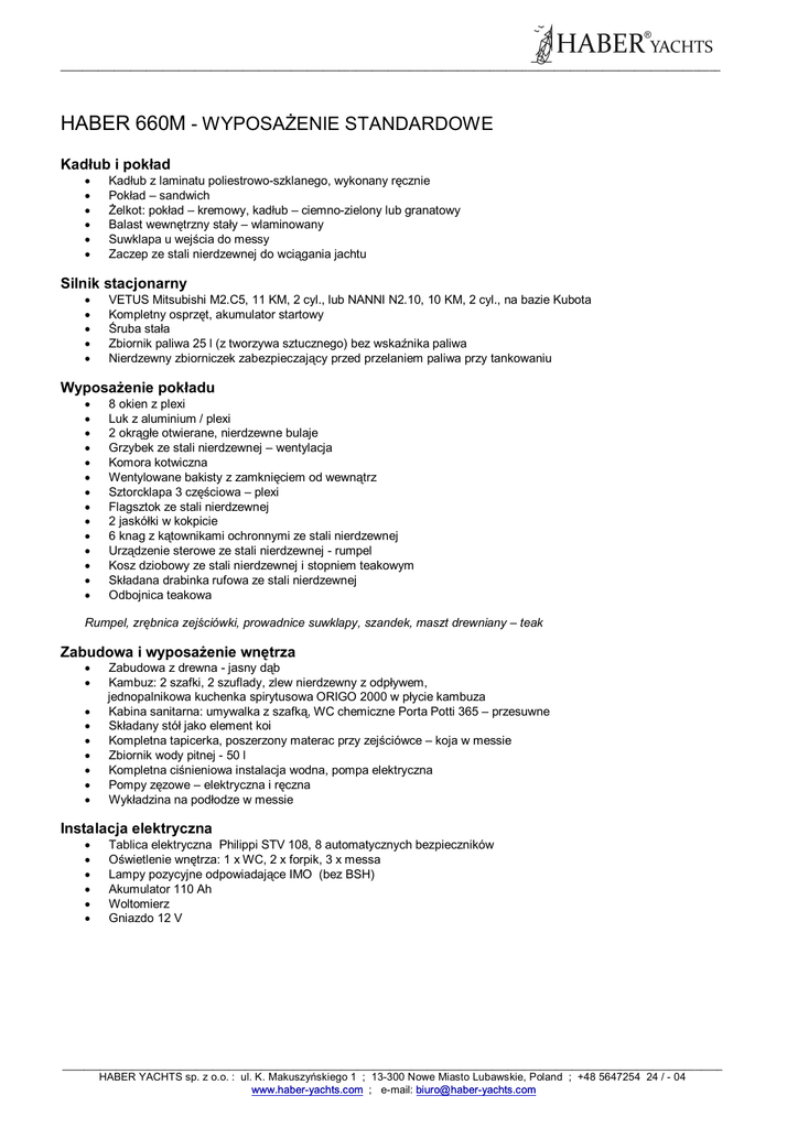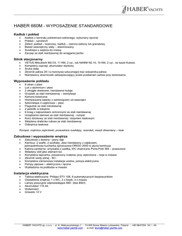___________________________________________________________________________________________________________________________ HABER 660M - WYPOSAŻENIE STANDARDOWE Kadłub i pokład Kadłub z laminatu poliestrowo-szklanego, wykonany ręcznie Pokład – sandwich Żelkot: pokład – kremowy, kadłub – ciemno-zielony lub granatowy Balast wewnętrzny stały – wlaminowany Suwklapa u wejścia do messy Zaczep ze stali nierdzewnej do wciągania jachtu Silnik stacjonarny VETUS Mitsubishi M2.C5, 11 KM, 2 cyl., lub NANNI N2.10, 10 KM, 2 cyl., na bazie Kubota Kompletny osprzęt, akumulator startowy Śruba stała Zbiornik paliwa 25 l (z tworzywa sztucznego) bez wskaźnika paliwa Nierdzewny zbiorniczek zabezpieczający przed przelaniem paliwa przy tankowaniu Wyposażenie pokładu 8 okien z plexi Luk z aluminium / plexi 2 okrągłe otwierane, nierdzewne bulaje Grzybek ze stali nierdzewnej – wentylacja Komora kotwiczna Wentylowane bakisty z zamknięciem od wewnątrz Sztorcklapa 3 częściowa – plexi Flagsztok ze stali nierdzewnej 2 jaskółki w kokpicie 6 knag z kątownikami ochronnymi ze stali nierdzewnej Urządzenie sterowe ze stali nierdzewnej - rumpel Kosz dziobowy ze stali nierdzewnej i stopniem teakowym Składana drabinka rufowa ze stali nierdzewnej Odbojnica teakowa Rumpel, zrębnica zejściówki, prowadnice suwklapy, szandek, maszt drewniany – teak Zabudowa i wyposażenie wnętrza Zabudowa z drewna - jasny dąb Kambuz: 2 szafki, 2 szuflady, zlew nierdzewny z odpływem, jednopalnikowa kuchenka spirytusowa ORIGO 2000 w płycie kambuza Kabina sanitarna: umywalka z szafką, WC chemiczne Porta Potti 365 – przesuwne Składany stół jako element koi Kompletna tapicerka, poszerzony materac przy zejściówce – koja w messie Zbiornik wody pitnej - 50 l Kompletna ciśnieniowa instalacja wodna, pompa elektryczna Pompy zęzowe – elektryczna i ręczna Wykładzina na podłodze w messie Instalacja elektryczna Tablica elektryczna Philippi STV 108, 8 automatycznych bezpieczników Oświetlenie wnętrza: 1 x WC, 2 x forpik, 3 x messa Lampy pozycyjne odpowiadające IMO (bez BSH) Akumulator 110 Ah Woltomierz Gniazdo 12 V ___________________________________________________________________________________________________________________________ HABER YACHTS sp. z o.o. : ul. K. Makuszyńskiego 1 ; 13-300 Nowe Miasto Lubawskie, Poland ; +48 5647254 24 / - 04 www.haber-yachts.com ; e-mail: [email protected]