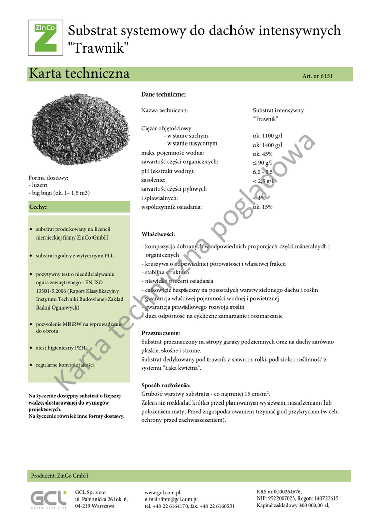 Substrat systemowy do dachów intensywnych "Trawnik" Karta techniczna Art. nr 6151 Dane techniczne: Substrat intensywny "Trawnik" gl ą Forma dostawy: - luzem - big bagi (ok. 1- 1,5 m3) ok. 1100 g/l ok. 1400 g/l ok. 45% ≤ 90 g/l 6,0 - 8,5 < 2,5 g/l do w Ciężar objętościowy - w stanie suchym - w stanie nasyconym maks. pojemność wodna: zawartość części organicznych: pH (ekstrakt wodny): zasolenie: zawartość części pyłowych i spławialnych: współczynnik osiadania: a Nazwa techniczna: • substrat zgodny z wytycznymi FLL • pozytywny test o nieoddziaływaniu - kompozycja dobranych w odpowiednich proporcjach części mineralnych i organicznych - kruszywa o odpowiedniej porowatości i właściwej frakcji - stabilna struktura - niewielki procent osiadania - całkowicie bezpieczny na pozostałych warstw zielonego dachu i roślin - gwarancja właściwej pojemności wodnej i powietrznej - gwarancja prawidłowego rozwoju roślin - duża odporność na cykliczne zamarzanie i rozmarzanie ch n ognia zewnętrznego - EN ISO 13501-5:2006 (Raport Klasyfikacyjny Instytutu Techniki Budowlanej-Zakład Badań Ogniowych) Właściwości: po niemieckiej firmy ZinCo GmbH na • substrat produkowany na licencji icz Cechy: < 1% ok. 15% te • pozwolenie MRiRW na wprowadzenie do obrotu ta • atest higieniczny PZH Ka r • regularne kontrole jakości Na życzenie dostępny substrat o lżejszej wadze, dostosowanej do wymogów projektowych. Na życzenie również inne formy dostawy. Przeznaczenie: Substrat przeznaczony na stropy garaży podziemnych oraz na dachy zarówno płaskie, skośne i strome. Substrat dedykowany pod trawnik z siewu i z rolki, pod zioła i roślinność z systemu "Łąka kwietna". Sposób rozłożenia: Grubość warstwy substratu - co najmniej 15 cm/m2. Zaleca się rozkładać krótko przed planowanym wysiewem, nasadzeniami lub położeniem maty. Przed zagospodarowaniem trzymać pod przykryciem (w celu ochrony przed zachwaszczeniem). Producent: ZinCo GmbH GCL Sp. z o.o ul. Pabianicka 26 lok. 6, 04-219 Warszawa www.gcl.com.pl e-mail: [email protected] tel. +48 22 6164170, fax: +48 22 6160531 KRS nr 0000264676, NIP: 9522007023, Regon: 140722615 Kapitał zakładowy 300 000,00 zł,