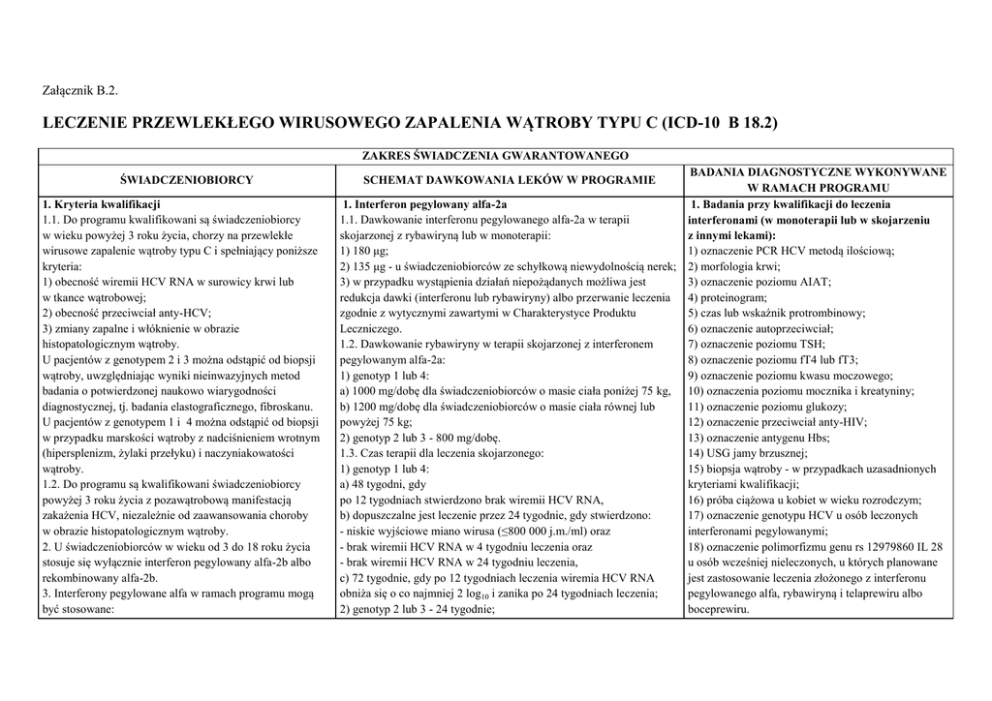 Załącznik B.2. LECZENIE PRZEWLEKŁEGO WIRUSOWEGO ZAPALENIA WĄTROBY TYPU C (ICD-10 B 18.2) ZAKRES ŚWIADCZENIA GWARANTOWANEGO ŚWIADCZENIOBIORCY 1. Kryteria kwalifikacji 1.1. Do programu kwalifikowani są świadczeniobiorcy w wieku powyżej 3 roku życia, chorzy na przewlekłe wirusowe zapalenie wątroby typu C i spełniający poniższe kryteria: 1) obecność wiremii HCV RNA w surowicy krwi lub w tkance wątrobowej; 2) obecność przeciwciał anty-HCV; 3) zmiany zapalne i włóknienie w obrazie histopatologicznym wątroby. U pacjentów z genotypem 2 i 3 można odstąpić od biopsji wątroby, uwzględniając wyniki nieinwazyjnych metod badania o potwierdzonej naukowo wiarygodności diagnostycznej, tj. badania elastograficznego, fibroskanu. U pacjentów z genotypem 1 i 4 można odstąpić od biopsji w przypadku marskości wątroby z nadciśnieniem wrotnym (hipersplenizm, żylaki przełyku) i naczyniakowatości wątroby. 1.2. Do programu są kwalifikowani świadczeniobiorcy powyżej 3 roku życia z pozawątrobową manifestacją zakażenia HCV, niezależnie od zaawansowania choroby w obrazie histopatologicznym wątroby. 2. U świadczeniobiorców w wieku od 3 do 18 roku życia stosuje się wyłącznie interferon pegylowany alfa-2b albo rekombinowany alfa-2b. 3. Interferony pegylowane alfa w ramach programu mogą być stosowane: BADANIA DIAGNOSTYCZNE WYKONYWANE W RAMACH PROGRAMU 1. Interferon pegylowany alfa-2a 1. Badania przy kwalifikacji do leczenia 1.1. Dawkowanie interferonu pegylowanego alfa-2a w terapii interferonami (w monoterapii lub w skojarzeniu skojarzonej z rybawiryną lub w monoterapii: z innymi lekami): 1) 180 μg; 1) oznaczenie PCR HCV metodą ilościową; 2) 135 μg - u świadczeniobiorców ze schyłkową niewydolnością nerek; 2) morfologia krwi; 3) w przypadku wystąpienia działań niepożądanych możliwa jest 3) oznaczenie poziomu AIAT; redukcja dawki (interferonu lub rybawiryny) albo przerwanie leczenia 4) proteinogram; zgodnie z wytycznymi zawartymi w Charakterystyce Produktu 5) czas lub wskaźnik protrombinowy; Leczniczego. 6) oznaczenie autoprzeciwciał; 1.2. Dawkowanie rybawiryny w terapii skojarzonej z interferonem 7) oznaczenie poziomu TSH; pegylowanym alfa-2a: 8) oznaczenie poziomu fT4 lub fT3; 1) genotyp 1 lub 4: 9) oznaczenie poziomu kwasu moczowego; a) 1000 mg/dobę dla świadczeniobiorców o masie ciała poniżej 75 kg, 10) oznaczenia poziomu mocznika i kreatyniny; b) 1200 mg/dobę dla świadczeniobiorców o masie ciała równej lub 11) oznaczenie poziomu glukozy; powyżej 75 kg; 12) oznaczenie przeciwciał anty-HIV; 2) genotyp 2 lub 3 - 800 mg/dobę. 13) oznaczenie antygenu Hbs; 1.3. Czas terapii dla leczenia skojarzonego: 14) USG jamy brzusznej; 1) genotyp 1 lub 4: 15) biopsja wątroby - w przypadkach uzasadnionych a) 48 tygodni, gdy kryteriami kwalifikacji; po 12 tygodniach stwierdzono brak wiremii HCV RNA, 16) próba ciążowa u kobiet w wieku rozrodczym; b) dopuszczalne jest leczenie przez 24 tygodnie, gdy stwierdzono: 17) oznaczenie genotypu HCV u osób leczonych - niskie wyjściowe miano wirusa (≤800 000 j.m./ml) oraz interferonami pegylowanymi; - brak wiremii HCV RNA w 4 tygodniu leczenia oraz 18) oznaczenie polimorfizmu genu rs 12979860 IL 28 - brak wiremii HCV RNA w 24 tygodniu leczenia, u osób wcześniej nieleczonych, u których planowane c) 72 tygodnie, gdy po 12 tygodniach leczenia wiremia HCV RNA jest zastosowanie leczenia złożonego z interferonu obniża się o co najmniej 2 log10 i zanika po 24 tygodniach leczenia; pegylowanego alfa, rybawiryną i telaprewiru albo 2) genotyp 2 lub 3 - 24 tygodnie; boceprewiru. SCHEMAT DAWKOWANIA LEKÓW W PROGRAMIE 1) w monoterapii: a) u świadczeniobiorców dializowanych; b) u świadczeniobiorców przed i po przeszczepach narządowych; c) u świadczeniobiorców z przeciwwskazaniami do stosowania lub nadwrażliwością na rybawirynę; 2) w leczeniu skojarzonym z rybawiryną u świadczeniobiorców: a) nieleczonych uprzednio interferonami; b) z nawrotem zakażenia; c) u których terapia interferonem rekombinowanym alfa lub interferonem rekombinowanym alfa i rybawiryną okazała się nieskuteczna; d) przed i po przeszczepach narządowych; e) u których terapia interferonem pegylowanym innego typu okazała się nieskuteczna jedynie w przypadku obserwowanej progresji choroby. 3) w leczeniu skojarzonym z rybawiryną i telaprewirem albo rybawiryną i boceprewirem u świadczeniobiorców powyżej 18 roku życia z genotypem 1: a) uprzednio leczonych nieskutecznie interferonem pegylowanym i rybawiryną, u których leczenie było przerwane po 12 tygodniach z powodu braku odpowiedzi wirusologicznej albo b) z brakiem odpowiedzi na wcześniejsze leczenie interferonem pegylowanym alfa z rybawiryną, przy czym stężenie HCV RNA przez cały okres terapii nie uległo obniżeniu o więcej niż 2 logarytmy dziesiętne (100-krotnie) albo c) z nawrotem zakażenia po terapii interferonem pegylowanym alfa z rybawiryną zakończonej uzyskaniem negatywnego wyniku HCV RNA (HCV RNA niewykrywalne w chwili zakończenia terapii, lecz wykrywalne w okresie obserwacji po leczeniu) albo 3) niezależnie od genotypu, przy współistniejącym zakażeniu HIV i HCV - 48 tygodni; 4) niezależnie od genotypu, przy współistniejącym zakażeniu HBV i HCV - 48 tygodni. 1.4. Leczenie należy przerwać u świadczeniobiorców z włóknieniem wątroby do 2 stopnia włącznie w skali Scheuer'a, zakażonych genotypem 1 lub 4, u których: a) po 12 tygodniach terapii nie stwierdza się spadku wiremii o minimum 2 log10 względem wartości wyjściowej albo b) po 24 tygodniach terapii wiremia HCV RNA jest nadal wykrywalna, mimo że po 12 tygodniach zmniejszyła się o ponad 2 log10 względem wartości wyjściowej. 1.5. U świadczeniobiorców z włóknieniem wątroby powyżej 2 stopnia w skali Scheuer'a lub manifestacją pozawątrobową zakażenia HCV terapię kontynuuje się do 48 tygodni. 2. Interferon pegylowany alfa-2b 2.1. Dawkowanie interferonu pegylowa