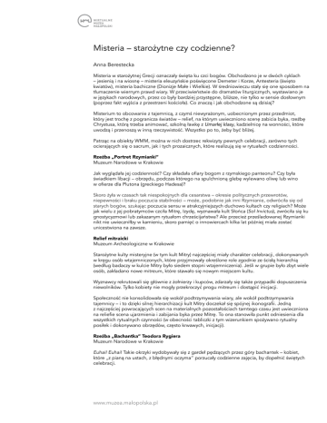 Misteria – starożytne czy codzienne? Anna Berestecka Misteria w starożytnej Grecji oznaczały święta ku czci bogów. Obchodzono je w dwóch cyklach – jesienią i na wiosnę – misteria eleuzyńskie poświęcone Demeter i Korze, Antesteria (święto kwiatów), misteria bachiczne (Dionizje Małe i Wielkie). W średniowieczu stały się one sposobem na tłumaczenie wiernym prawd wiary. W przeciwieństwie do dramatów liturgicznych, wystawiano je w językach narodowych, przez co były bardziej przystępne, bliższe, nie tylko w sensie dosłownym (poprzez fakt wyjścia z przestrzeni kościoła). Co znaczą i jak obchodzone są dzisiaj? Misterium to obcowanie z tajemnicą, z czymś niewyrażonym, uobecnionym przez przedmiot, który jest trochę z pogranicza światów – relief, na którym uwieczniono scenę zabicia byka, rzeźbę Chrystusa, którą trzeba animować, szkolną ławkę z Umarłej klasy, kadzielnicę na wonności, które uwodzą i przenoszą w inną rzeczywistość. Wszystko po to, żeby być bliżej. Patrząc na obiekty WMM, można w nich dostrzec rekwizyty pewnych celebracji, zarówno tych ocierających się o sacrum, jak i tych prozaicznych, które realizują się w rytuałach codzienności. Rzeźba „Portret Rzymianki” Muzeum Narodowe w Krakowie Jak wyglądała jej codzienność? Czy składała ofiary bogom z rzymskiego panteonu? Czy była świadkiem libacji – obrzędu, podczas którego na spulchnioną glebę wylewano oliwę lub wino w ofierze dla Plutona (greckiego Hadesa)? Skoro żyła w czasach tak niespokojnych dla cesarstwa – okresie politycznych przewrotów, niepewności i braku poczucia stabilności – może, podobnie jak inni Rzymianie, odwróciła się od starych bogów, szukając poczucia sensu w atrakcyjniejszych duchowo kultach czy religiach? Może jak wielu z jej pobratymców czciła Mitrę, Izydę, wyznawała kult Słońca (Sol Invictus), zwróciła się ku gnostycyzmowi lub zakazanym rytuałom chrześcijaństwa? Ale przecież prześladowanej Rzymianki nikt nie uwieczniłby w kamieniu, skoro pamięć o innowiercach kilka lat później miała zostać unicestwiona na zawsze. Relief mitraicki Muzeum Archeologiczne w Krakowie Starożytne kulty misteryjne (w tym kult Mitry) najczęściej miały charakter celebracji, dokonywanych w kręgu osób wtajemniczonych, które przyjmowały określone role zgodnie ze ścisłą hierarchią (według badaczy w kulcie Mitry było siedem stopni wtajemniczenia). Jeśli w grupie było zbyt wiele osób, zakładano nowe mitreum, które stawało się nowym miejscem kultu. Wyznawcy rekrutowali się głównie z żołnierzy i kupców, zdarzały się także przypadki dopuszczenia niewolników. Tylko kobiety nie mogły przekroczyć progu mitreum i dostąpić inicjacji. Społeczność nie konsolidowała się wokół podtrzymywania wiary, ale wokół podtrzymywania tajemnicy – i to dzięki silnej hierarchizacji kult Mitry doczekał się spójnej ikonografii. Jedną z najczęściej powracających scen na materialnych pozostałościach tamtego czasu jest uwieczniona na reliefie scena ujarzmienia i zabijania byka przez Mitrę. To ona stanowiła punkt odniesienia dla wszystkich rytualnych czynności (w obecności tabliczki z tym wizerunkiem spożywano rytualny posiłek i dokonywano obrzędów, często krwawych, inicjacji). Rzeźba „Bachantka” Teodora Rygiera Muzeum Narodowe w Krakowie Euhai! Euhai! Takie okrzyki wydobywały się z gardeł pędzących przez góry bachantek – kobiet, które „z pianą na ustach, z błędnymi oczyma” porzucały codzienne zajęcia, by dopełnić świętych celebracji. www.muzea.malopolska.pl Obrzędy ku czci Dionizosa, inaczej niż w kulcie Mitry czy w przypadku misteriów eleuzyjskich, wiązały się z bachicznym szałem. Obcowanie z bóstwem w misterium, potęgowane przez wino, prowadziło do ekstazy (wyjścia poza siebie) i entuzjazmu (rozumianego jako wejście w boga). Dawało to przyzwolenie na zachowania na granicy szału. Siła religijnego przeżycia była tak wielka, że mogła prowadzić do mordu. Uchwycona przez Rygiera bachantka zdająca się krzyczeć frazę z dramatu Eurypidesa: „Czy w całonocnych tańcach będę pląsać białą stopą w korowodach Bakcha, odrzuciwszy głowę w tył w powietrze wilgotne od rosy”*, nie przeczuwa nawet, że za chwilę może wejść w rolę mitycznej Agaue, która celebrując orgiastyczne obrzędy, zabiła swojego syna Pentheusa. * Cyt. za: Eurypides, Bachantki, [w:] Tragedie, t. IV, przeł. J. Łanowski, Warszawa 2007, s. 56. Berło rogowe, tzw. bâton de commandement, z Jaskini Maszyckiej Muzeum Archeologiczne w Krakowie Róg renifera był prawdopodobnie rodzajem utensylia używanego do celebracji rytuałów magicznych. Misteria ludów pierwotnych ogniskowały się wokół zjawisk naturalnych – cyklów wegetacyjnych, księżycowych i słonecznych, często praktyk magicznych i szamańskich. Co wiemy o kulturze i wierzeniach tego ludu? Berło znaleziono przy szczątkach osób, które padły ofiarą kanibalizmu – z dzisiejszej perspektywy praktyki nieludzkiej. Aż trudno uwierzyć, że wytworem społeczności, która dopuszczała się takich aktów przemocy, był tak wysublimowany przedmiot jak kościana igła z uszkiem (przypisywana właśnie kulturze magdaleńskiej). Rzeźba „Chrystus na Osiołku Palmowym” Muzeum Narodowe w Krakowie Chrystus na osiołku w muzealnej gablocie nie jest triumfatorem. Przez kilkaset lat dla mieszkańców Szydłowca (niewielkiej miejscowości w woj. mazowieckim) był przedmiotem kultu, znakiem uobecnienia, traktowanym jako skarb i świętość. To za nim maszerowały tłumy wiernych. Patrząc na drewnianą figurę, łatwiej było im wierzyć w dramat i triumf Wielkiej Nocy. To typowe praktyki średniowiecznych misteriów. Jeszcze do niedawna procesje z figurami były powszechnym sposobem celebracji. Po stuletniej przerwie reaktywowano je w Szydłowcu (tym razem z kopią figury). Można je także zobaczyć 