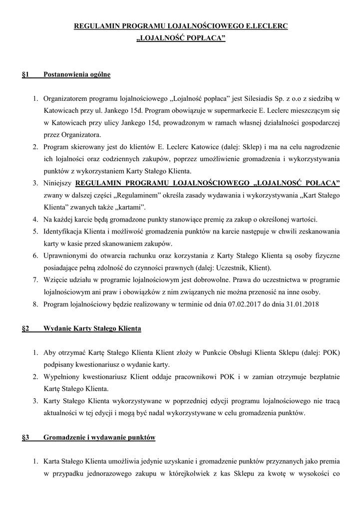 REGULAMIN PROGRAMU LOJALNOŚCIOWEGO E.LECLERC „LOJALNOŚĆ POPŁACA” §1 Postanowienia ogólne 1. Organizatorem programu lojalnościowego „Lojalność popłaca” jest Silesiadis Sp. z o.o z siedzibą w Katowicach przy ul. Jankego 15d. Program obowiązuje w supermarkecie E. Leclerc mieszczącym się w Katowicach przy ulicy Jankego 15d, prowadzonym w ramach własnej działalności gospodarczej przez Organizatora. 2. Program skierowany jest do klientów E. Leclerc Katowice (dalej: Sklep) i ma na celu nagrodzenie ich lojalności oraz codziennych zakupów, poprzez umożliwienie gromadzenia i wykorzystywania punktów z wykorzystaniem Karty Stałego Klienta. 3. Niniejszy REGULAMIN PROGRAMU LOJALNOŚCIOWEGO „LOJALNOSĆ POŁACA” zwany w dalszej części „Regulaminem” określa zasady wydawania i wykorzystywania „Kart Stałego Klienta” zwanych także „kartami”. 4. Na każdej karcie będą gromadzone punkty stanowiące premię za zakup o określonej wartości. 5. Identyfikacja Klienta i możliwość gromadzenia punktów na karcie następuje w chwili zeskanowania karty w kasie przed skanowaniem zakupów. 6. Uprawnionymi do otwarcia rachunku oraz korzystania z Karty Stałego Klienta są osoby fizyczne posiadające pełną zdolność do czynności prawnych (dalej: Uczestnik, Klient). 7. Wzięcie udziału w programie lojalnościowym jest dobrowolne. Prawa do uczestnictwa w programie lojalnościowym ani praw i obowiązków z nim związanych nie można przenosić na inne osoby. 8. Program lojalnościowy będzie realizowany w terminie od dnia 07.02.2017 do dnia 31.01.2018 §2 Wydanie Karty Stałego Klienta 1. Aby otrzymać Kartę Stałego Klienta Klient złoży w Punkcie Obsługi Klienta Sklepu (dalej: POK) podpisany kwestionariusz o wydanie karty. 2. Wypełniony kwestionariusz Klient oddaje pracownikowi POK i w zamian otrzymuje bezpłatnie Kartę Stałego Klienta. 3. Karty Stałego Klienta wykorzystywane w poprzedniej edycji programu lojalnościowego nie tracą aktualności w tej edycji i mogą być nadal wykorzystywane w celu gromadzenia punktów. §3 Gromadzenie i wydawanie punktów 1. Karta Stałego Klienta umożliwia jedynie uzyskanie i gromadzenie punktów przyznanych jako premia w przypadku jednorazowego zakupu w którejkolwiek z kas Sklepu za kwotę w wysokości co najmniej 50 PLN. Zakupy z różnych kas nie sumują się. Za każde następne 50 PLN wydane w tej samej transakcji Posiadacz Karty Stałego Klienta otrzymuje kolejny 1 punkt. 2. Punkty można uzyskać dzięki dokonaniu zakupów z całego dostępnego asortymentu, z zastrzeżeniem ust. 3 3. Do kwoty uprawniającej do otrzymania punktów, o której mowa w ust. 1 nie wlicza się wartości zakupionych w Sklepie następujących produktów: 1) napojów alkoholowych w rozumieniu art. 46 ust. 1 ustawy z dnia 26 października 1982 r. o wychowaniu w trzeźwości i przeciwdziałaniu alkoholizmowi (Dz. U. z 2016 r. poz. 487 z późn. zm.); 2) wyrobów tytoniowych, papierosów elektronicznych, pojemników zapasowych lub rekwizytów tytoniowych w rozumieniu ustawy z dnia 9 listopada 1995 r. o ochronie zdrowia przed następstwami używania tytoniu i wyrobów tytoniowych (Dz. U z 2015 r., poz. 298 z późn. zm.); 3) produktów leczniczych w rozumieniu art. 2 pkt 32 ustawy Prawo farmaceutyczne (Dz. U. z 2008 r. Nr 45, poz. 271 z późn. zm.); 4) preparatów do początkowego żywienia niemowląt oraz przedmiotów służących do karmienia niemowląt w rozumieniu ustawy z dnia 25 sierpnia 2006 r. o bezpieczeństwie żywności i żywienia (Dz. U. z 2015 r. poz. 594 z późn. zm.). 4. Kartę Stałego Klienta Klient powinien okazać pracownikowi kasy na końcu transakcji w celu zeskanowania przy każdorazowym przejściu przez kasę. Powyższa identyfikacja pozwoli każdorazowo na gromadzenie punktów na karcie. 5. W wypadku dokonywania zakupów przez Internet na stronie www.leclerckatowice24.pl. Identyfikacja Klienta jest możliwa przez : 1) wprowadzenie numeru Karty Stałego Klienta na ww. stronie w zakładce „Moje Konto” w części „Karta Lojalnościowa”, 2) podanie numeru Karty Stałego Klienta telefonicznie lub w trakcie składania zamówienia w polu „Uwagi”. 6. Punkty zgromadzone na koncie uprawniają do nabycia dowolnych towarów znajdujących się w katalogu lojalnościowym Sklepu 7. Obiór prezentów z katalogu lojalnościowego polega na wymianie zebranych punktów na Karcie Stałego Klienta na wybrane prezenty wg ich wartości w katalogu prezentów. Realizacja uprawnienia uczestnika programu lojalnościowego następuje w formie zawarcia umowy sprzedaży danego towaru z katalogu za cenę jednego grosza za sztukę lub za cenę wskazaną w katalogu. Dopuszcza się częściową lub całkowitą zapłatę w złotych wg kwot podanych w katalogu i na regale z prezentami. 8. Transakcja wymiany punktów na towary nie jest łączona z transakcją zakupu kolejnych towarów. 9. W ramach transakcji wymiany towarów nie są naliczane punkty w ramach programu lojalnościowego. Organizator zastrzega sobie prawo do wycofania danego prezentu z oferty po wyczerpaniu się jego zapasów. Organizator zastrzega sobie prawo w takiej sytuacji do zaoferowania prezentu zastępczego o zbliżonej wartości. 10. Odbiór prezentów za pomocą punktów zgromadzonych na Karcie Stałego Klienta można dokonywać jedynie w Sklepie, który otworzył rachunek i wydał Kartę bądź w sklepie internetowym przy składaniu standardowego zamówienia. Nie jest możliwym łączenie różnych kont programu lojalnościowego, ani przyznawanie punktów na inną kartę niż ta jaka jest przypisana do konta Klienta w sklepie internetowym 11. Wykorzystanie zgromadzonych punktów jest możliwe dopiero w następnej transakcji po ich przyznaniu. 12. Artykuły z katalogu lojalnościowego są dostępne w sprzedaży oraz wyeksponowane w specjalnie oznaczonych miejscach na sklepie. Klient chcąc odebrać produkt z programu lojalnościowego udaje się z nim do kasy i informu
